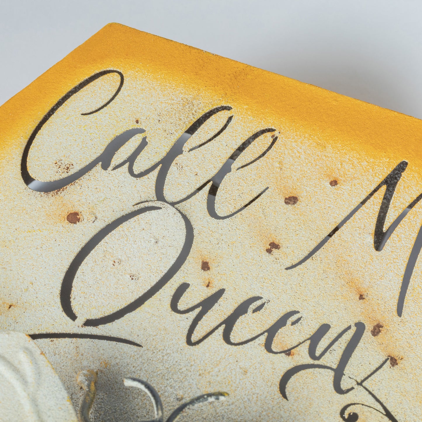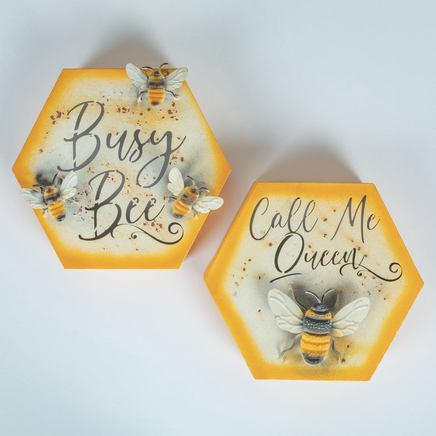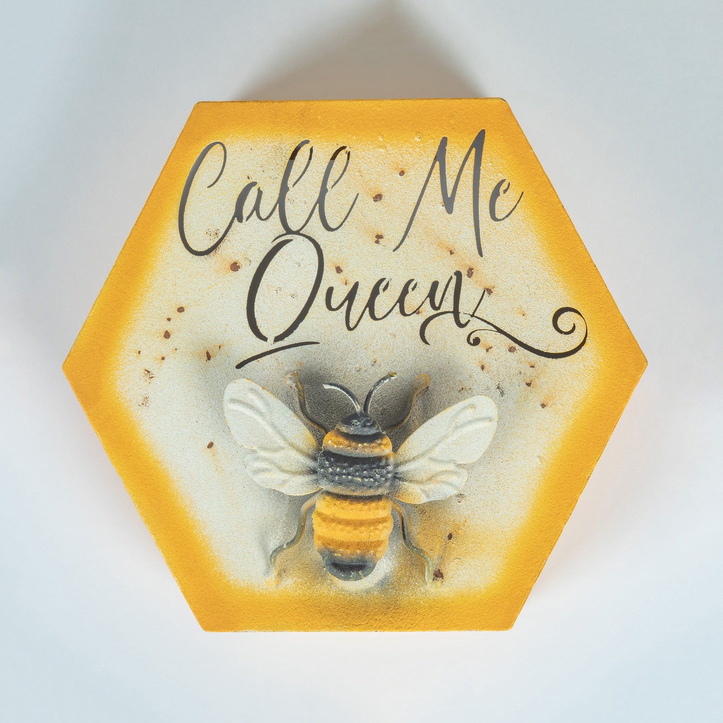 Inspired by a honeycomb cell shape, this delightfully rustic metal sign features the phrases "Call Me Queen Bee" or simply "Busy Bee" in half-cursive script.