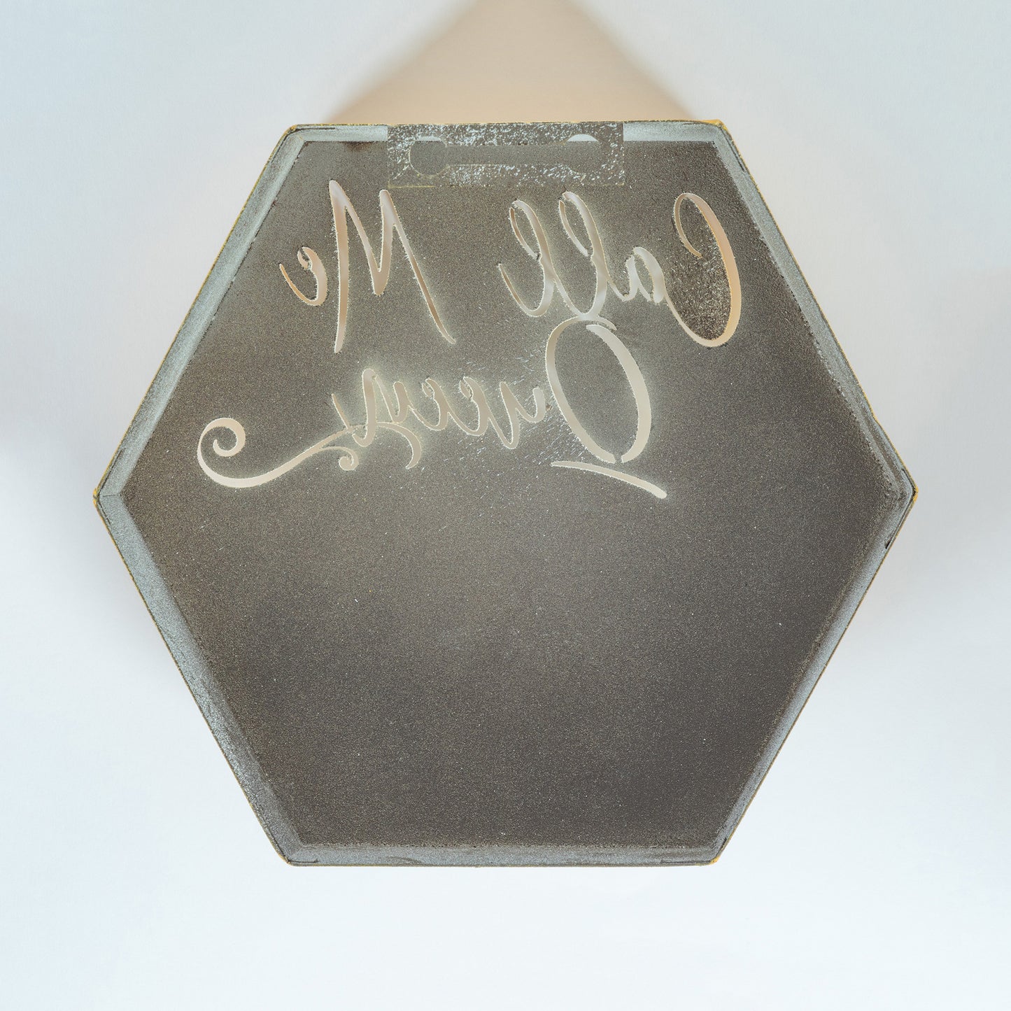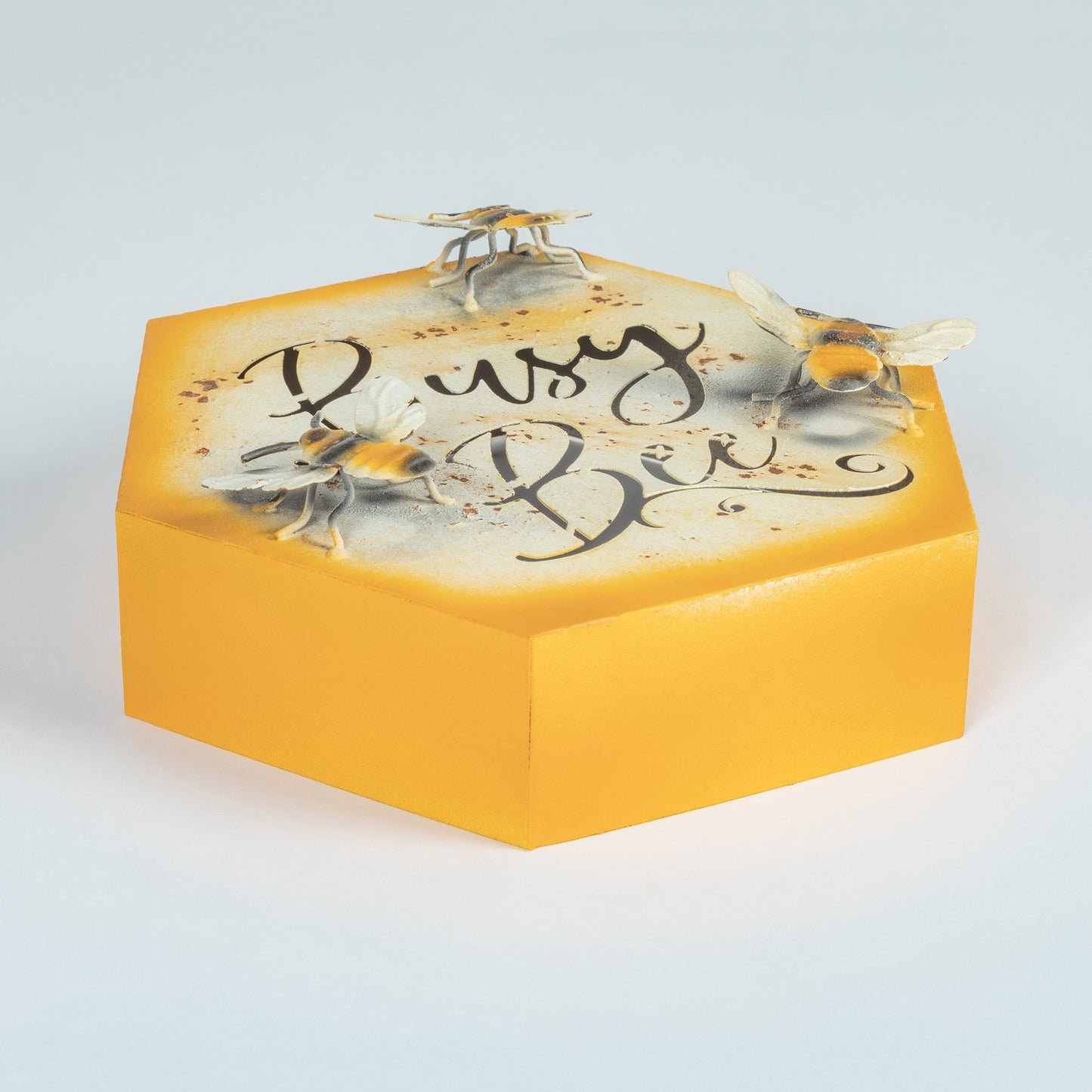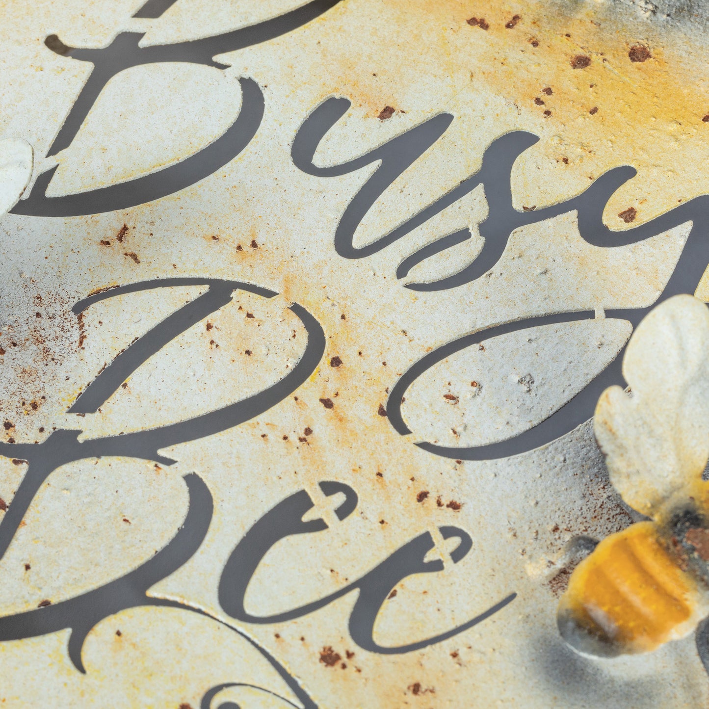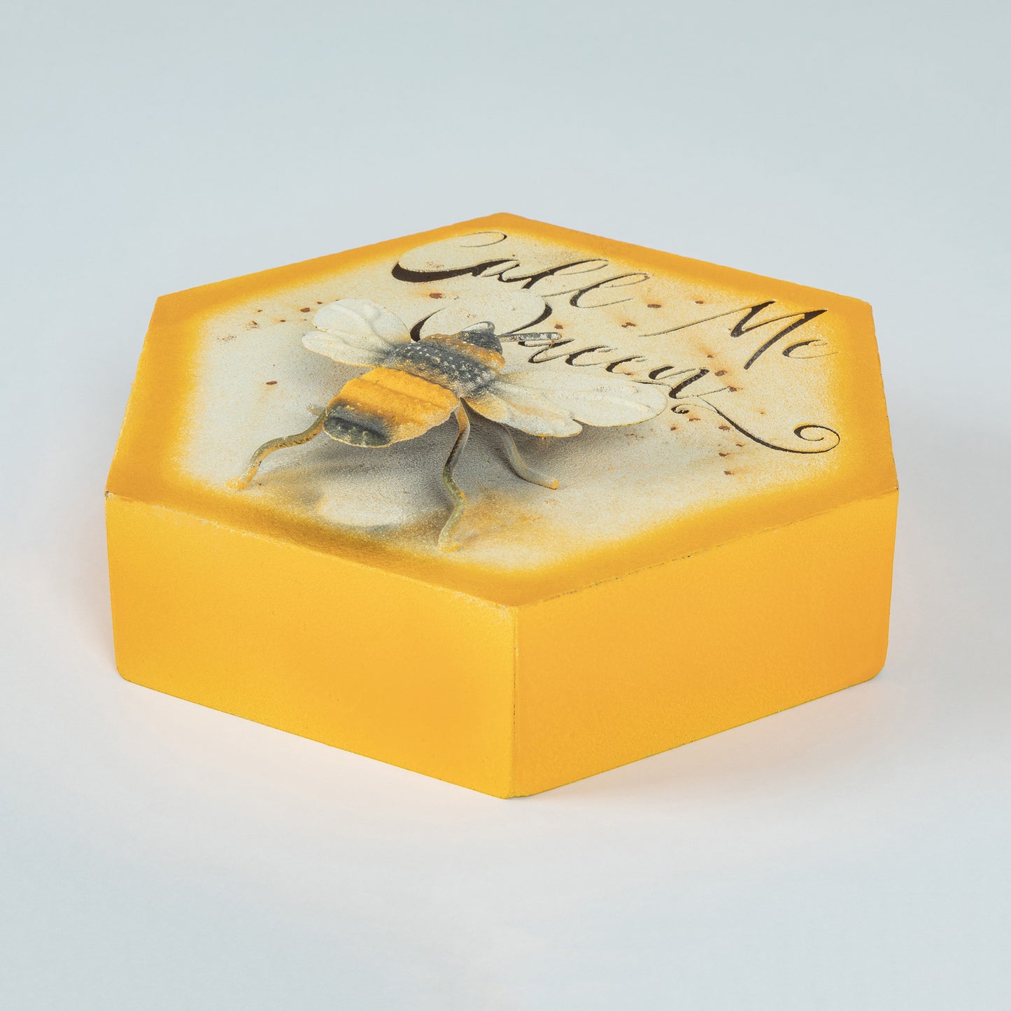 Inspired by a honeycomb cell shape, this delightfully rustic metal sign features the phrases "Call Me Queen Bee" or simply "Busy Bee" in half-cursive script.