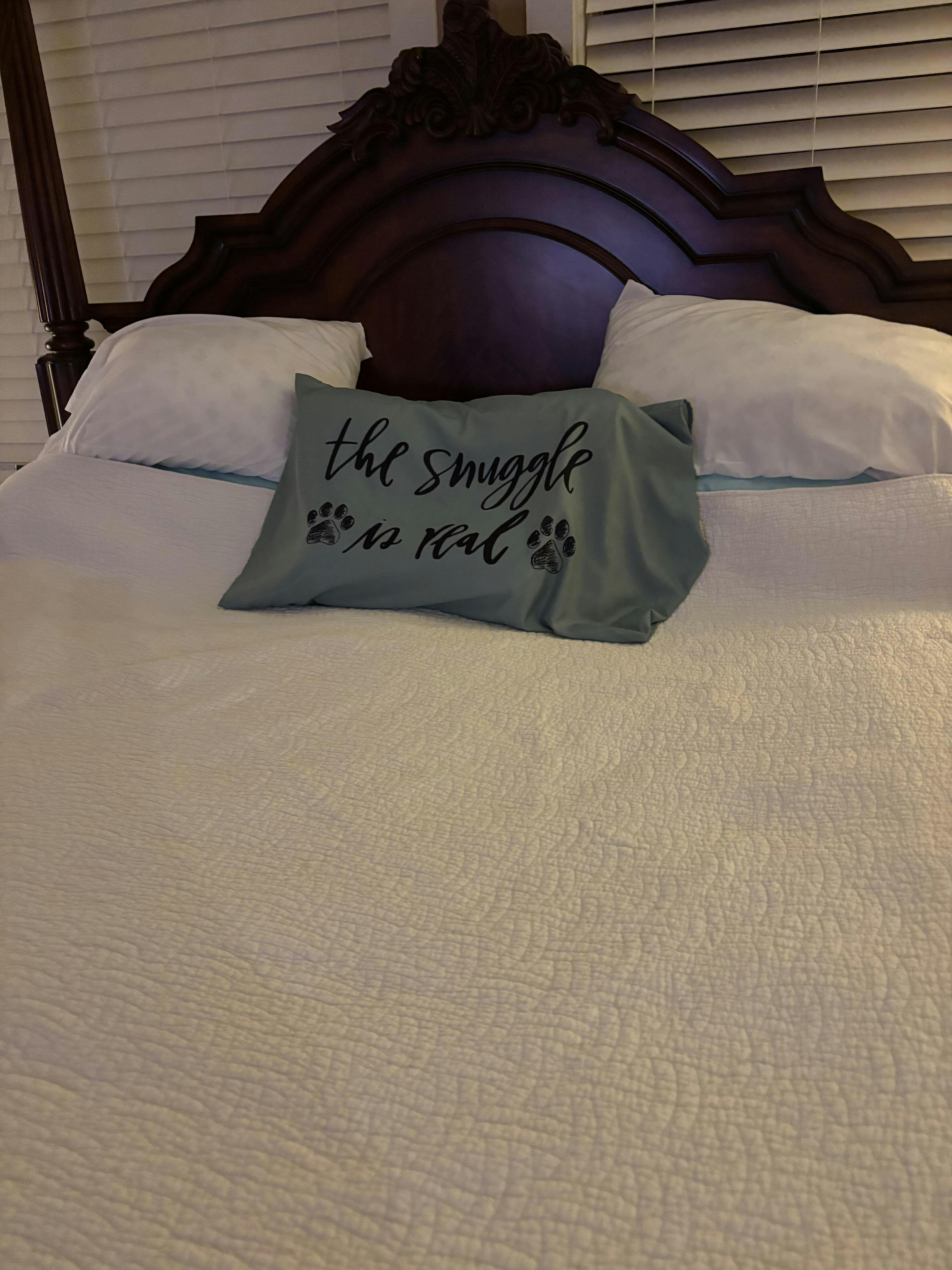 Crafted from buttery soft microfiber, this paw-printed pair of pillowcase covers lets you embrace the joys and challenges of being a pet parent! With black scribble-style paw prints and playful phrases like "The Snuggle is Real," or "Reserved for the Dog," or a solid black-and-white silhouette of cuddling cats, these pillowcases bring both comfort and personality to your space. They’re the perfect addition to any pet lover’s home, adding a touch of fun and coziness.