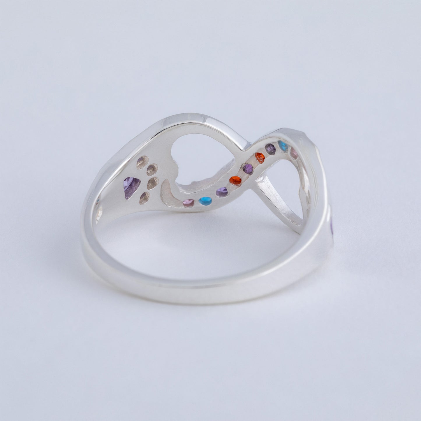 Multicolored crystals cross over the infinity sign, symbolizing the rainbow bridge that your furry friend has crossed. Handcrafted by artisans in Bolivia, this sterling silver ring features two purple crystal paws, and a subtle heart shape within the infinity sign.