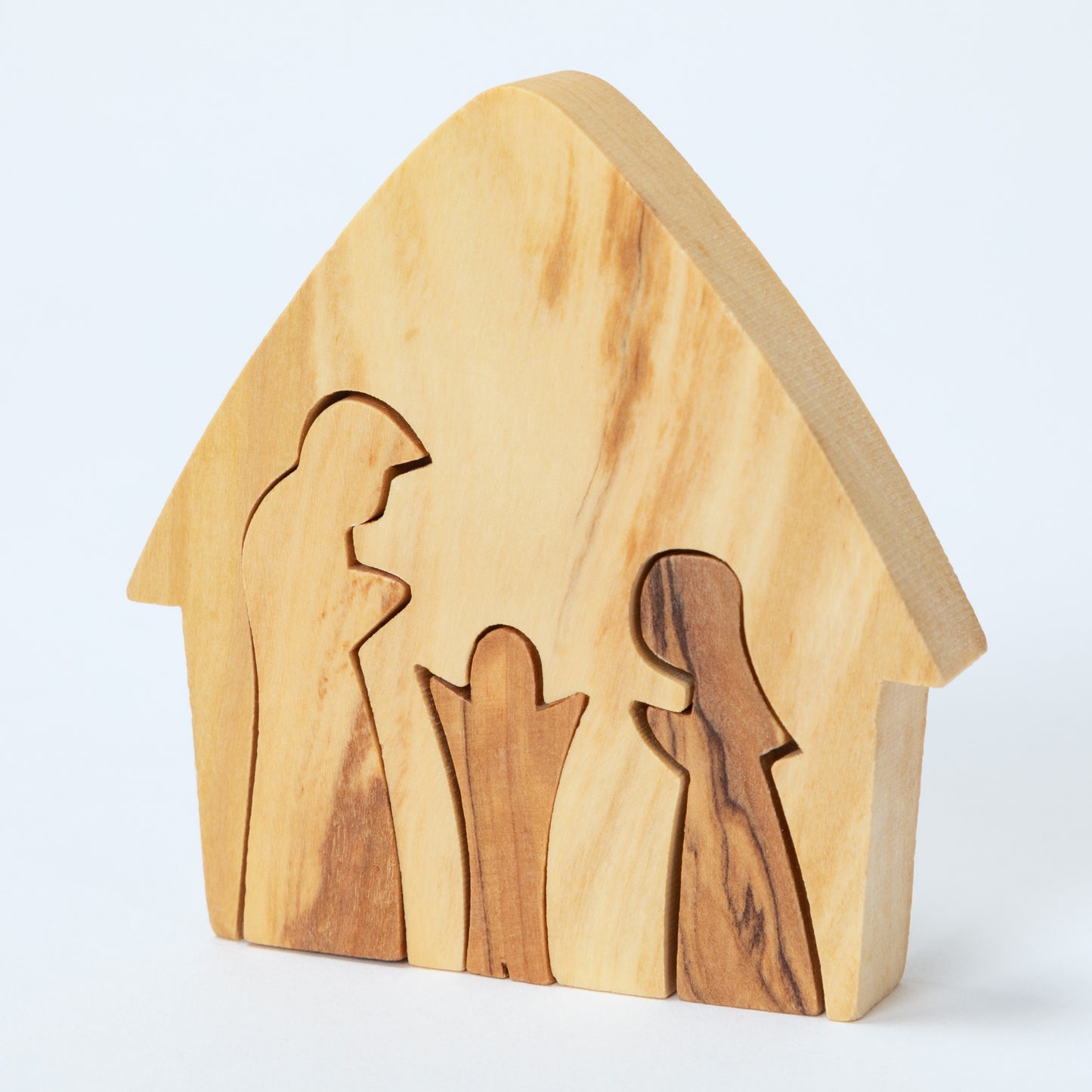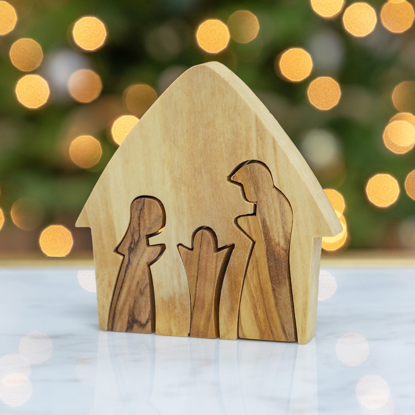 Gorgeously handcrafted from single pieces of olive wood that has been cut after harvest and sealed in parafin, each nativity features a silhouette of Mary, Joseph, baby Jesus and a manger. Placed in line or pulled into the individual pieces, this nativity puzzle makes for a simple yet stunning celebration of the Christmas season.