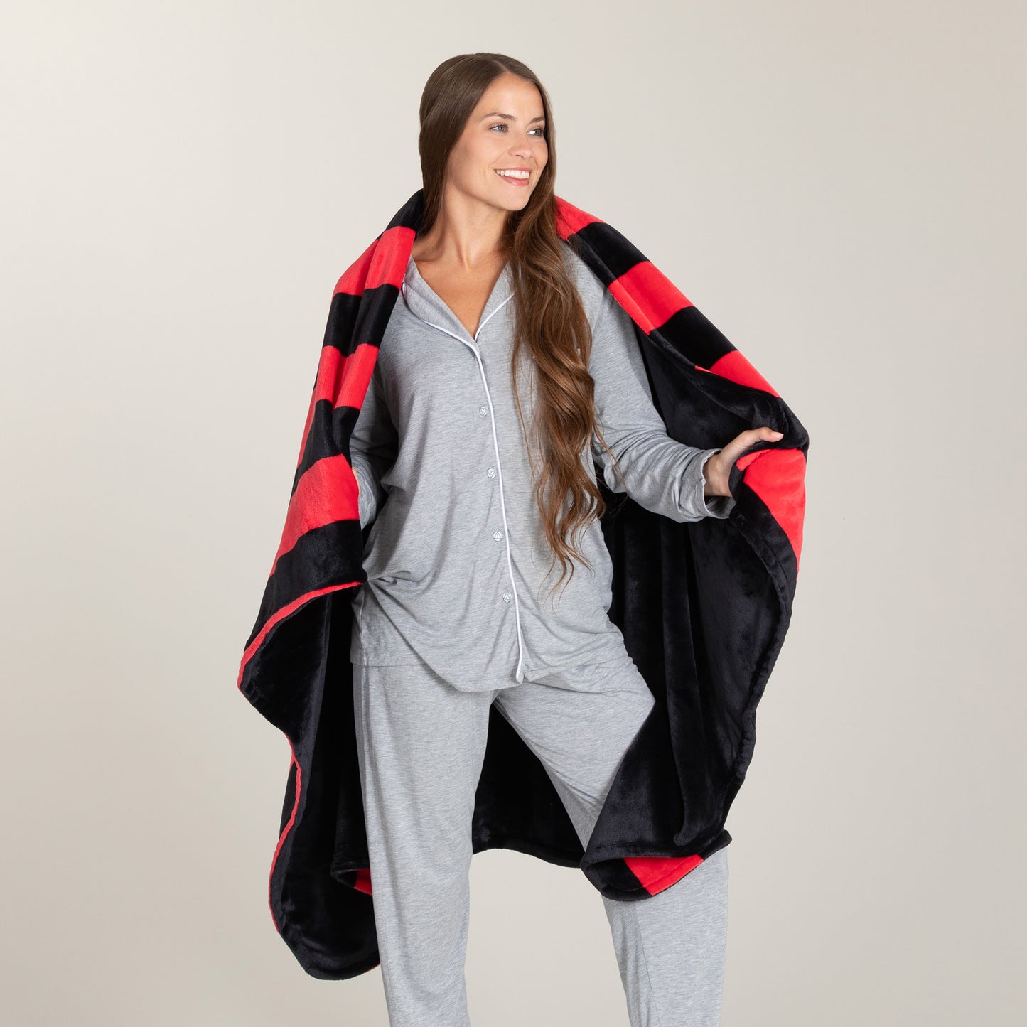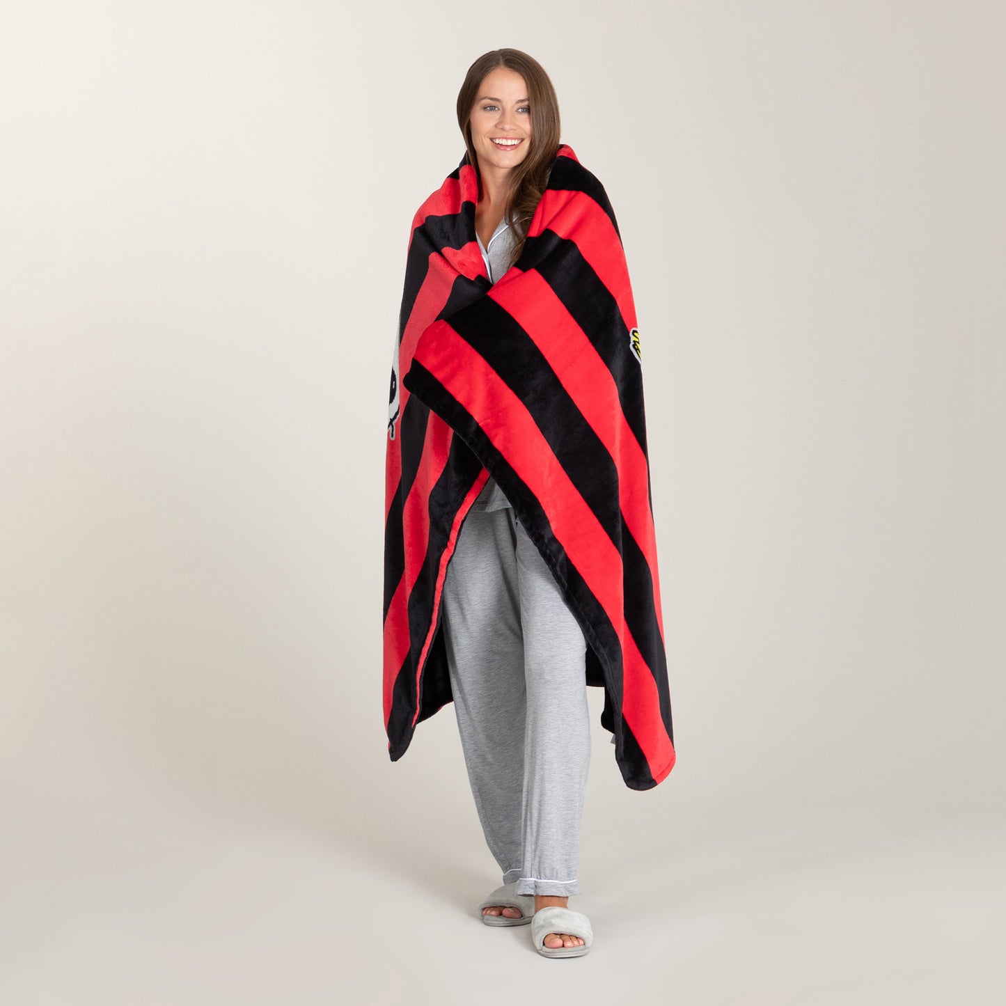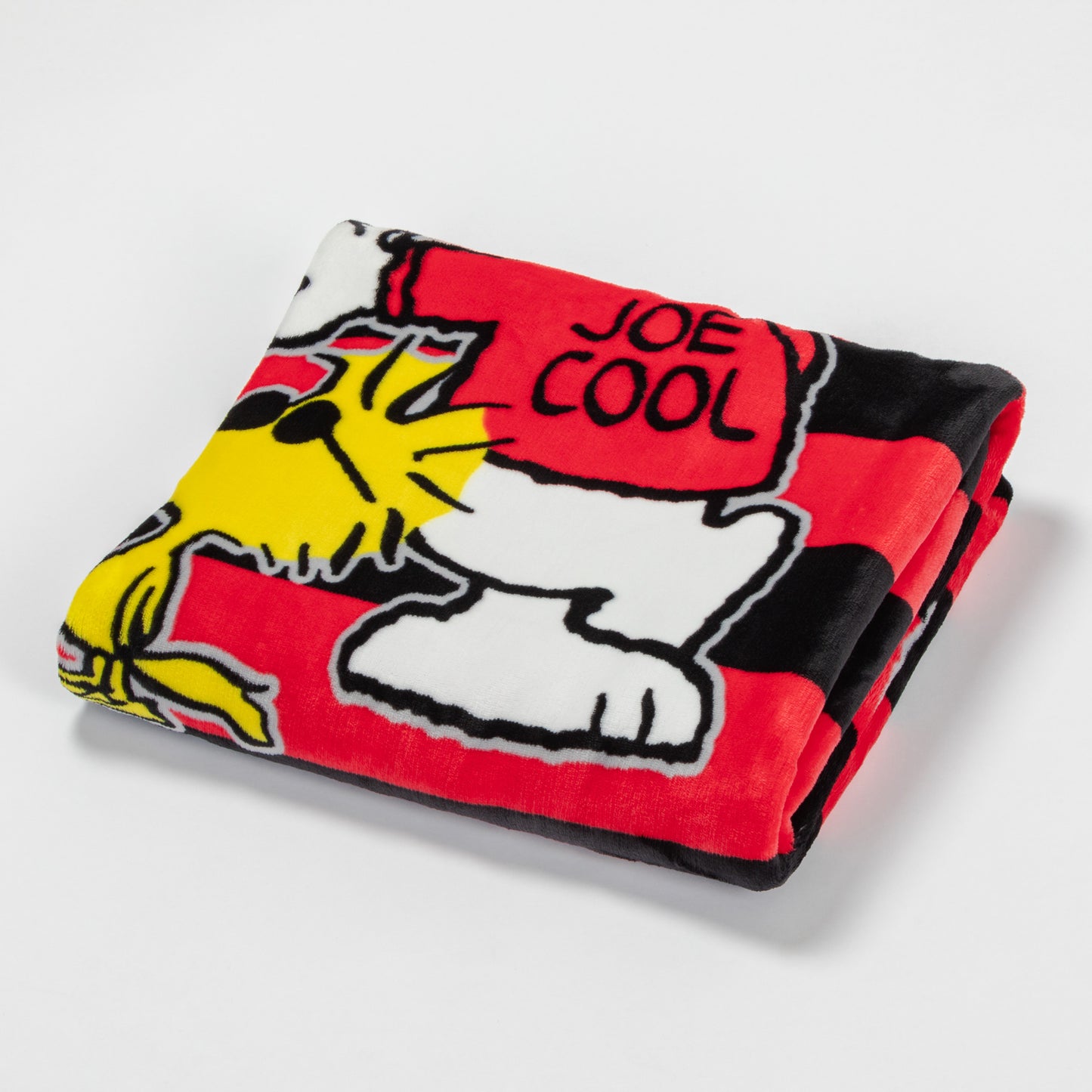 Black and red stripes set the tone with this cool and cozy Snoopy & Woodstock plush throw blanket! Featuring Snoopy in his "Joe Cool" persona, this super soft, fuzzy throw blanket is perfect for the Peanuts® fan in your life.