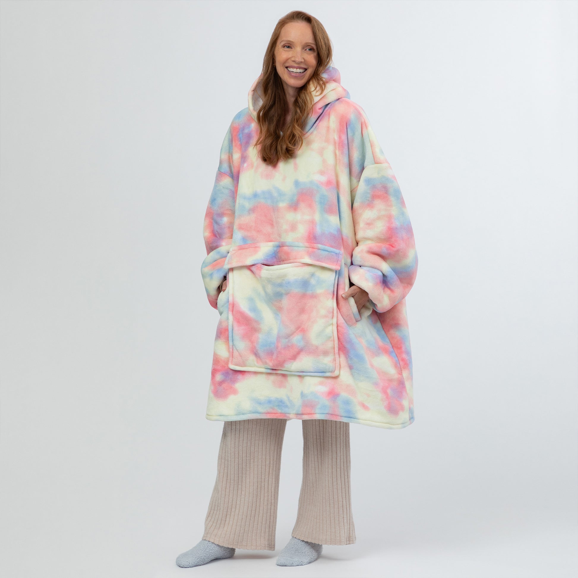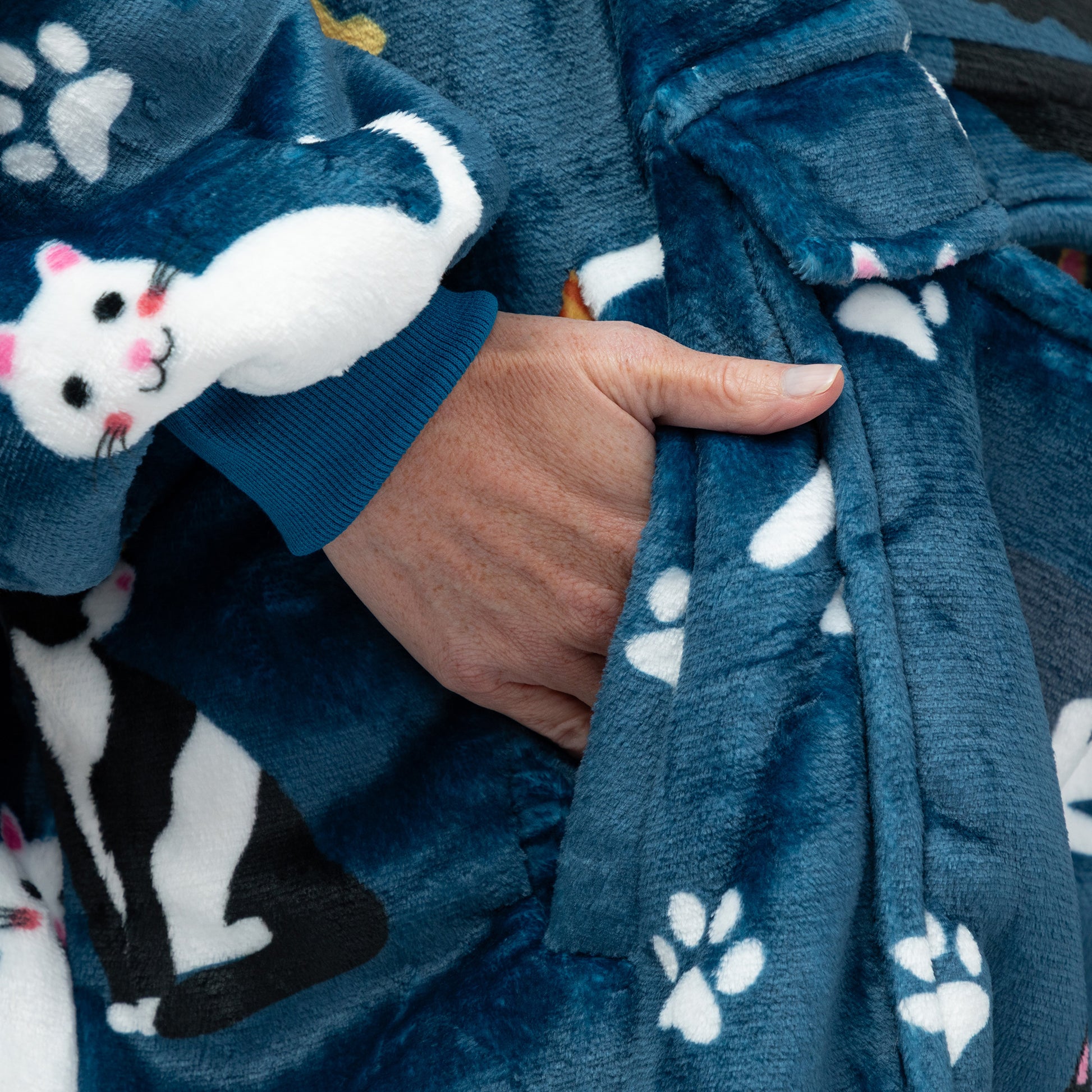 The only thing cozier than this hooded wearable blanket is being able to curl up with your best friend in the front pocket! Complete with super soft fleece and cuffed sleeves that keep you cozy warm, this hoodie blanket features a hood, two side pockets for your paws, and sherpa fleece lining in the front pocket.