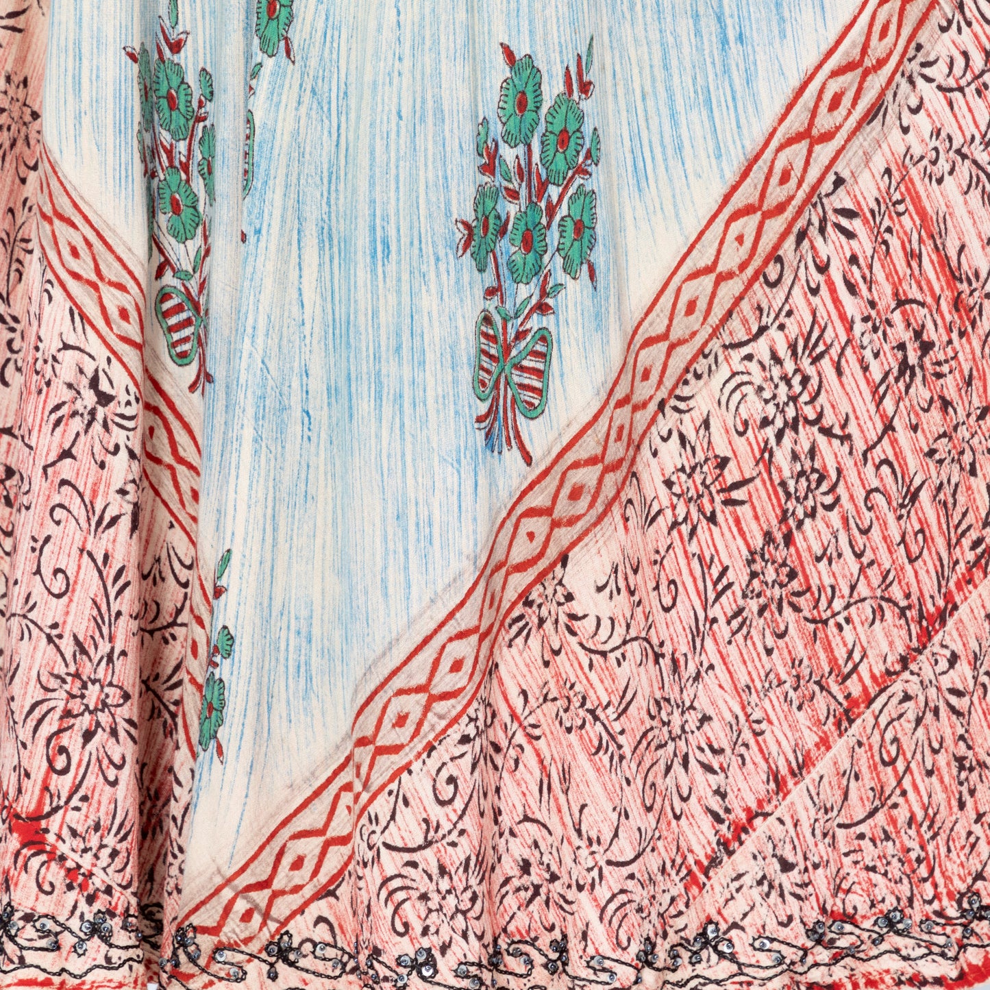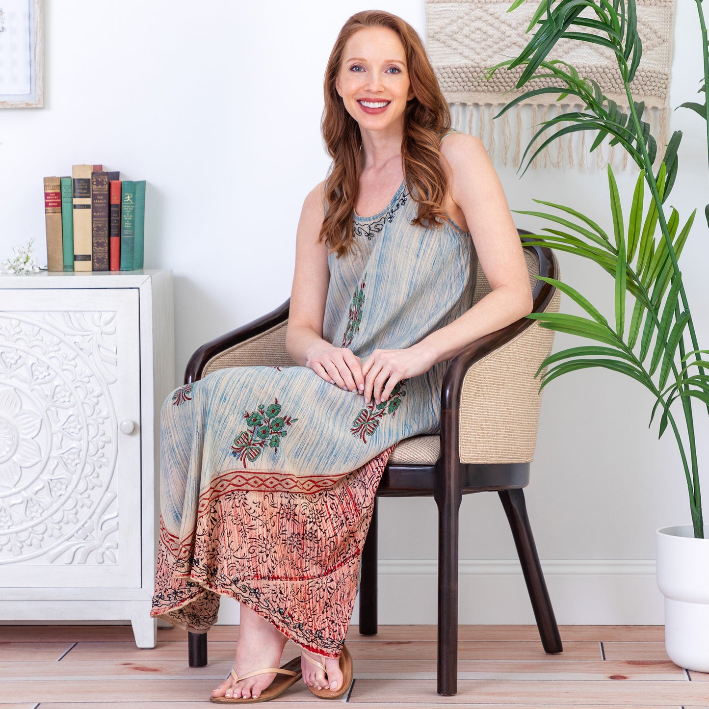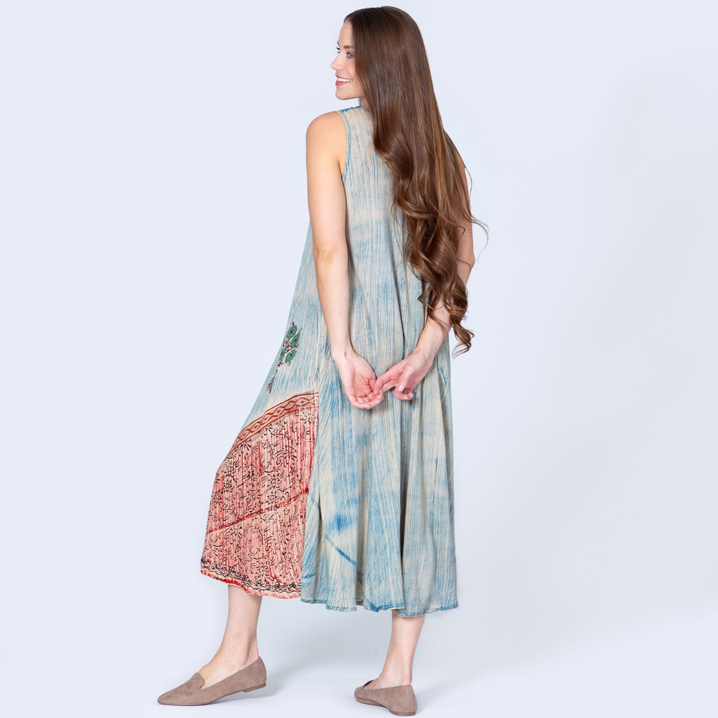 Enjoy an enchanting pastel dyed sleeveless dress, a stunning fusion of elegance and ethical craftsmanship. Handmade by skilled artisans in India through fair trade practices, this ankle-length dress features a flattering scoop neck adorned with intricate block printed flower bouquets along the front. Delicately embroidered with beaded accents along the hem and neckline, each dress is a testament to exquisite artistry and conscious fashion.