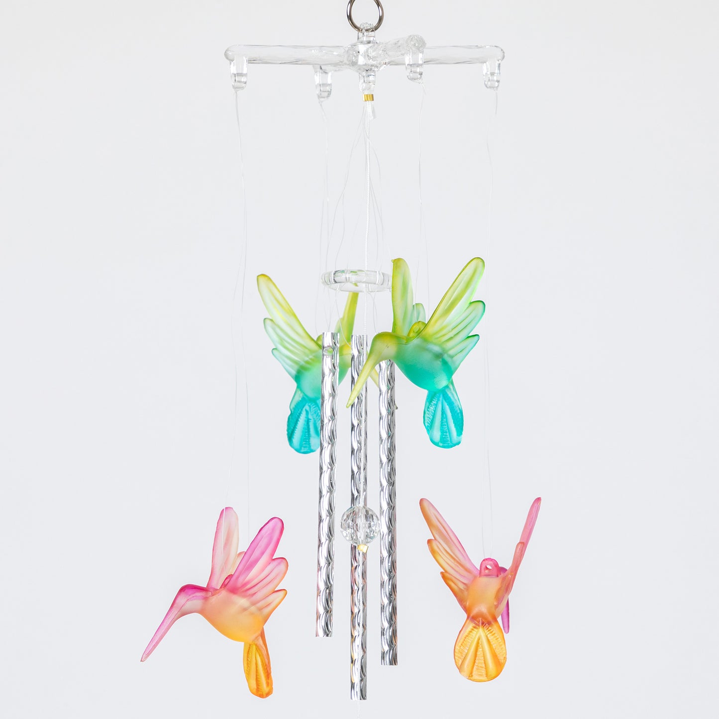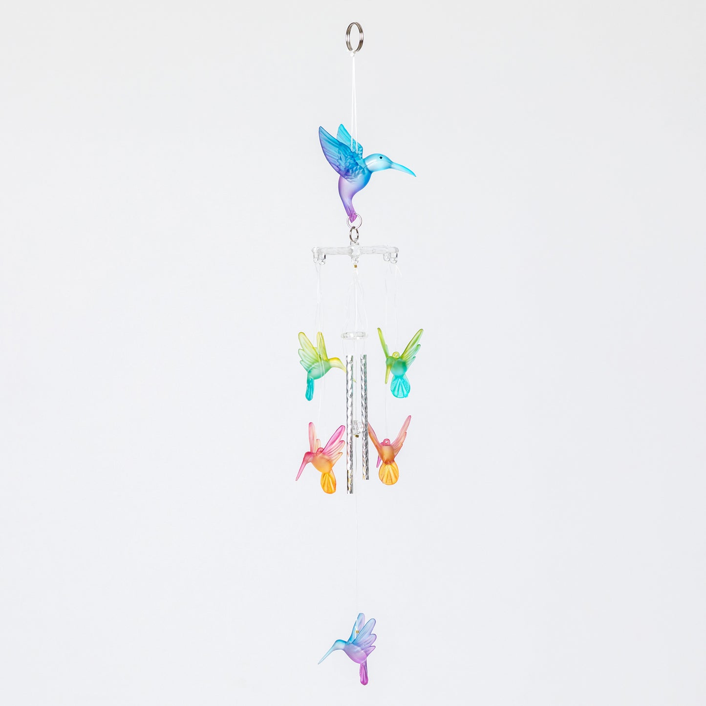Embrace the soothing melodies that dance through the air as the gentle breeze caresses this rainbow colored wind chime. Crafted with precision, each hummingbird and metal tube is tuned to perfection, creating a symphony to enjoy for years to come!