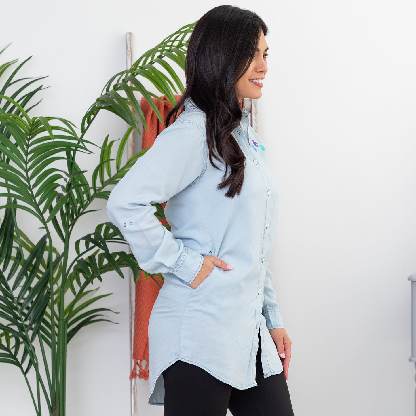 Elevate your casual style with a timeless, button up chambray shirt – the perfect blend of comfort and sophistication. Featuring convenient button tabs for effortlessly rolling up the sleeves, this versatile collared shirt is complete with the two side pockets, and a darling trio of colorful paws on the left chest, proudly displaying your love of animals!
