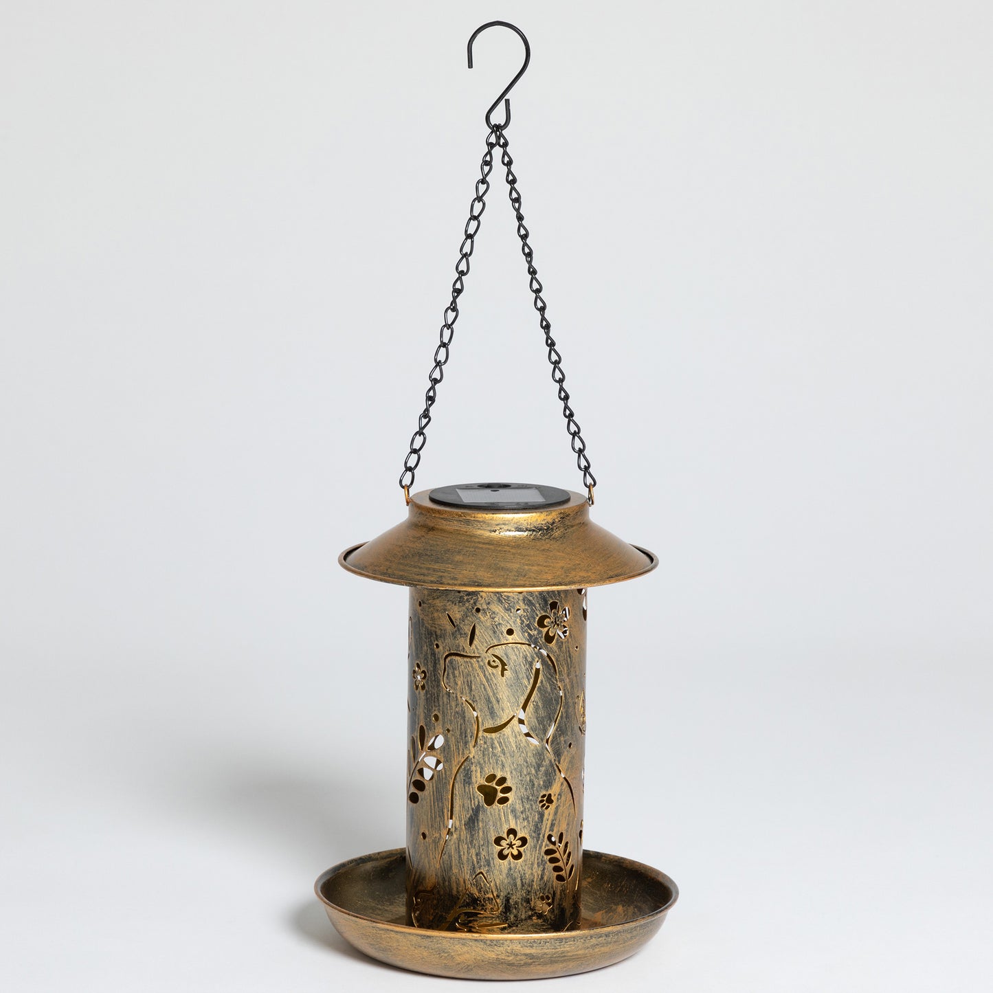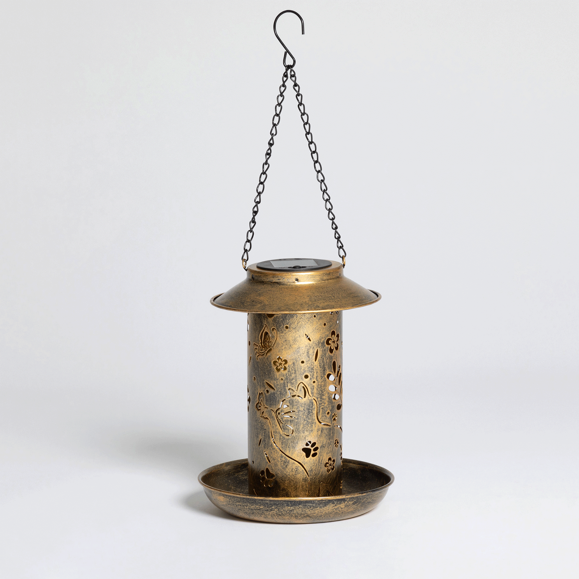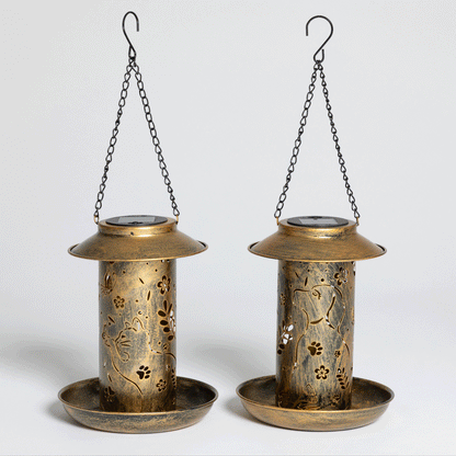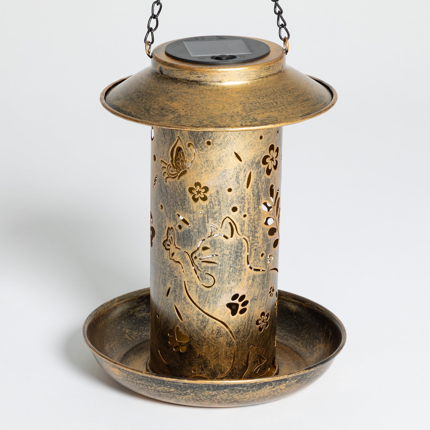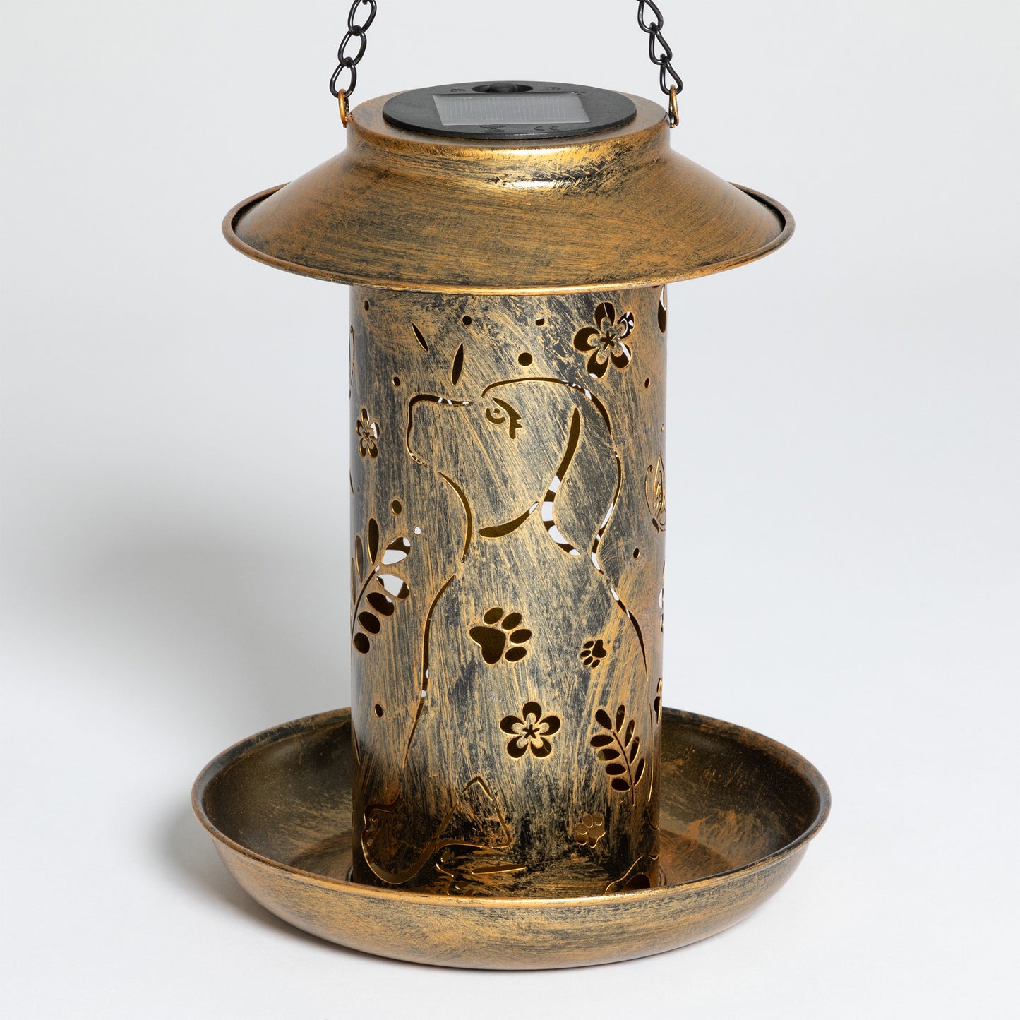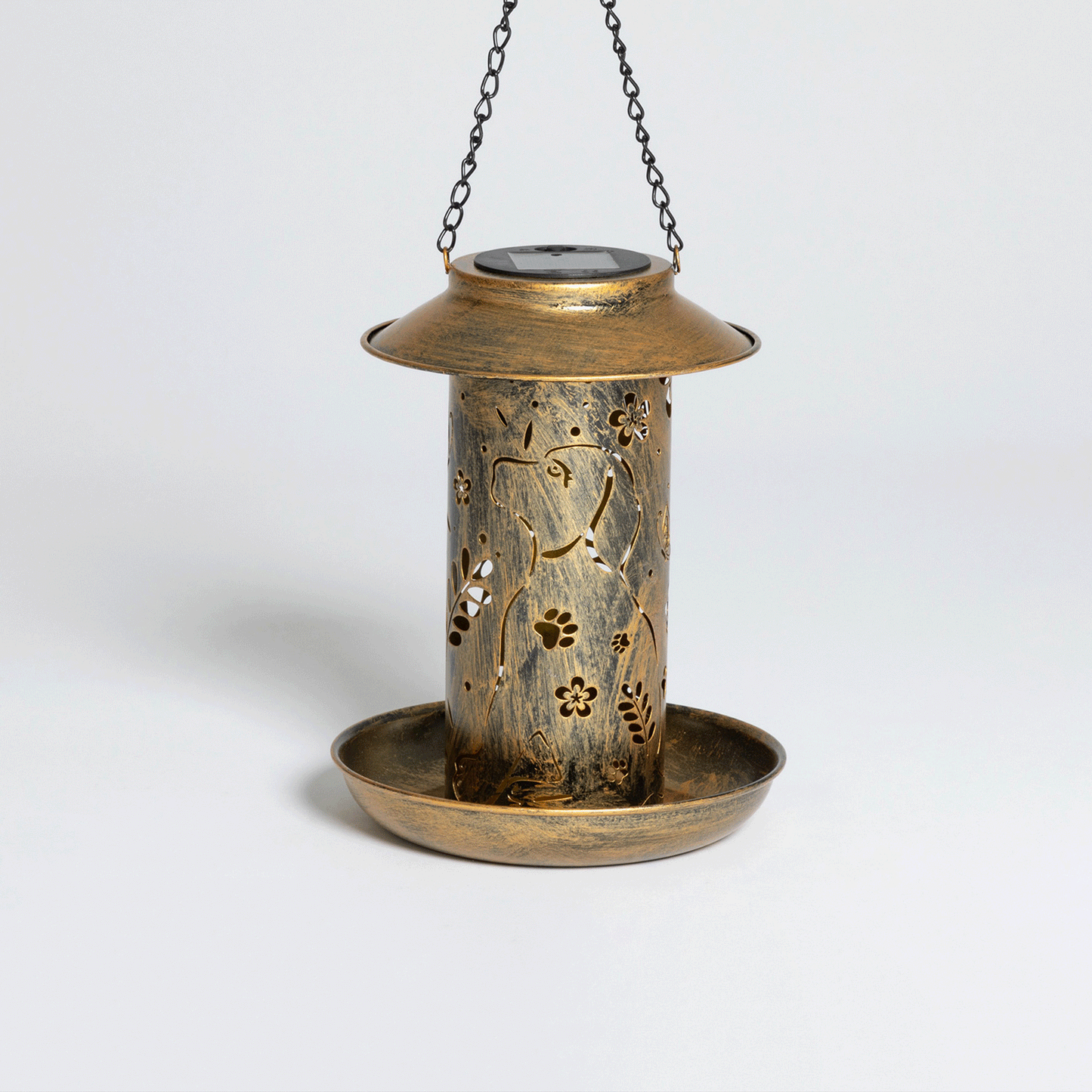 Illuminate your garden with whimsical charm using our solar-powered bird feeder, adorned with a delightful cutout design of your favorite furry friend - a playful dog or a serene cat, surrounded by blooming flowers. Crafted in a lustrous brushed gold hue, this feeder adds a touch of elegance to your outdoor space while providing a haven for feathered friends. As the sun sets, watch in awe as the built-in solar panel charges during the day, casting a gentle glow through the intricate cutouts, creating a mesmerizing display that brings joy to both humans and wildlife alike.