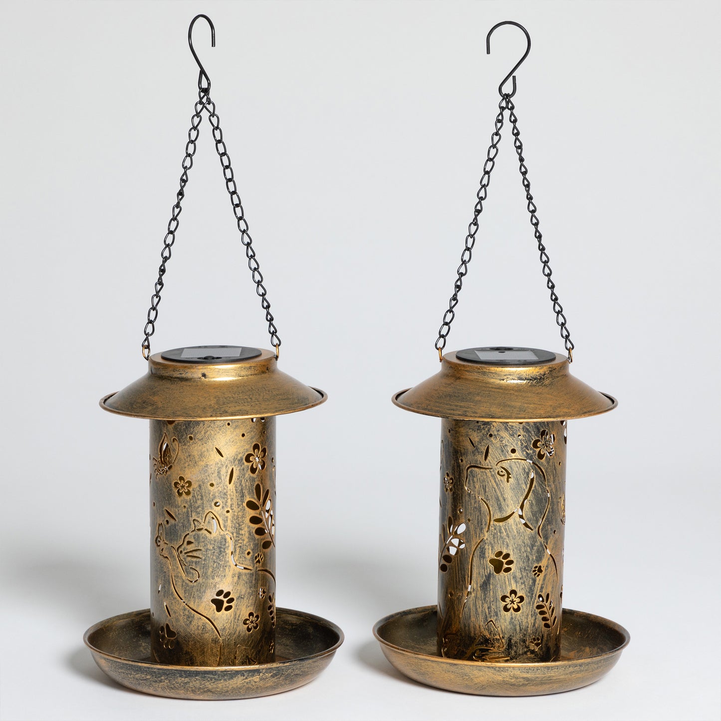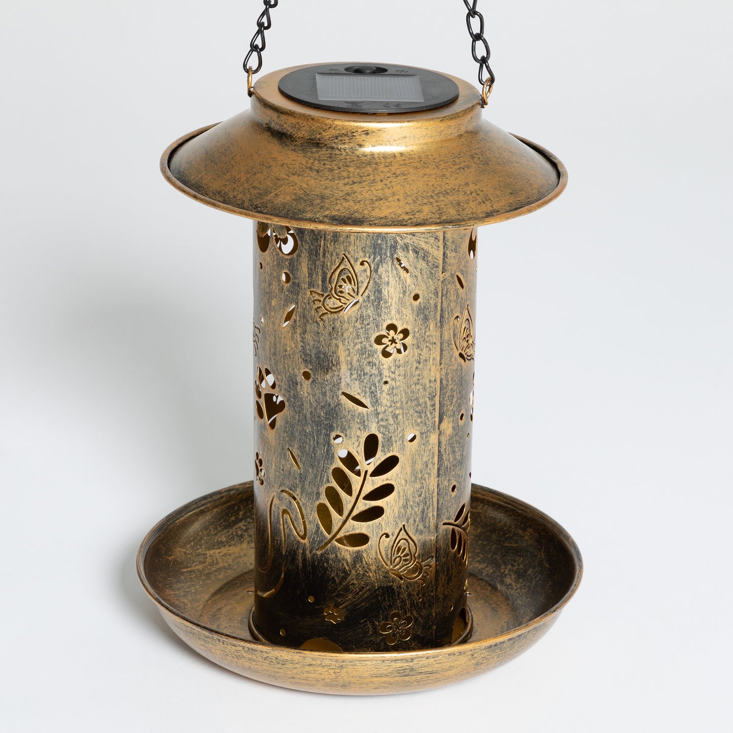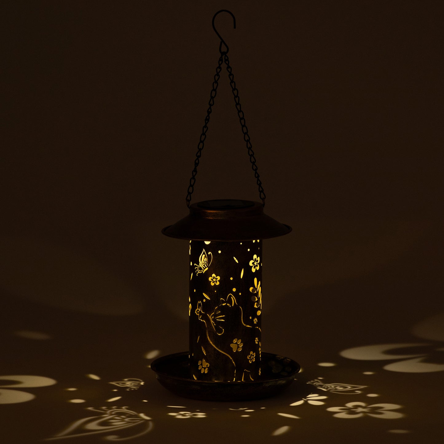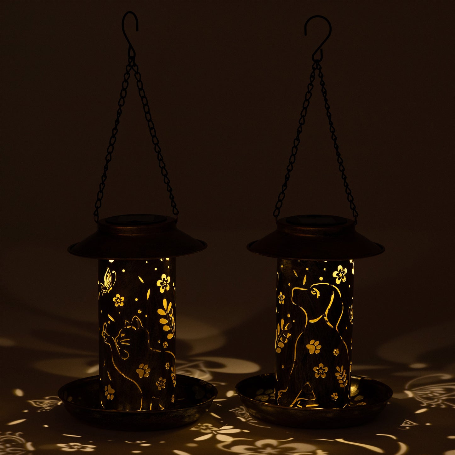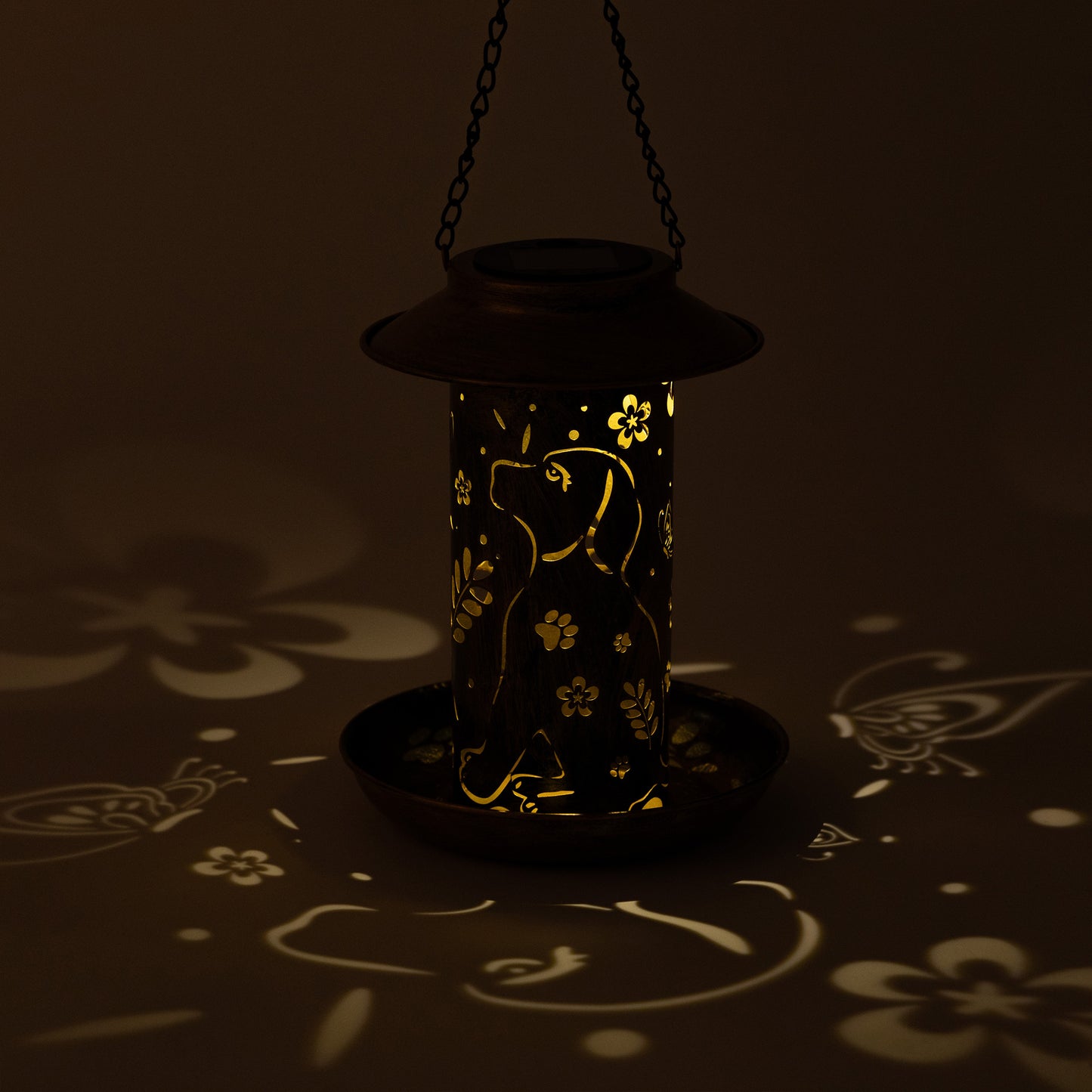 Illuminate your garden with whimsical charm using our solar-powered bird feeder, adorned with a delightful cutout design of your favorite furry friend - a playful dog or a serene cat, surrounded by blooming flowers. Crafted in a lustrous brushed gold hue, this feeder adds a touch of elegance to your outdoor space while providing a haven for feathered friends. As the sun sets, watch in awe as the built-in solar panel charges during the day, casting a gentle glow through the intricate cutouts, creating a mesmerizing display that brings joy to both humans and wildlife alike.