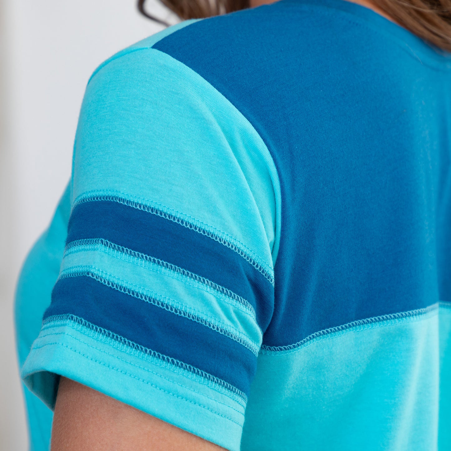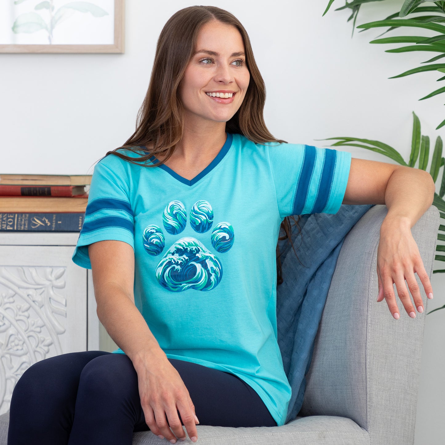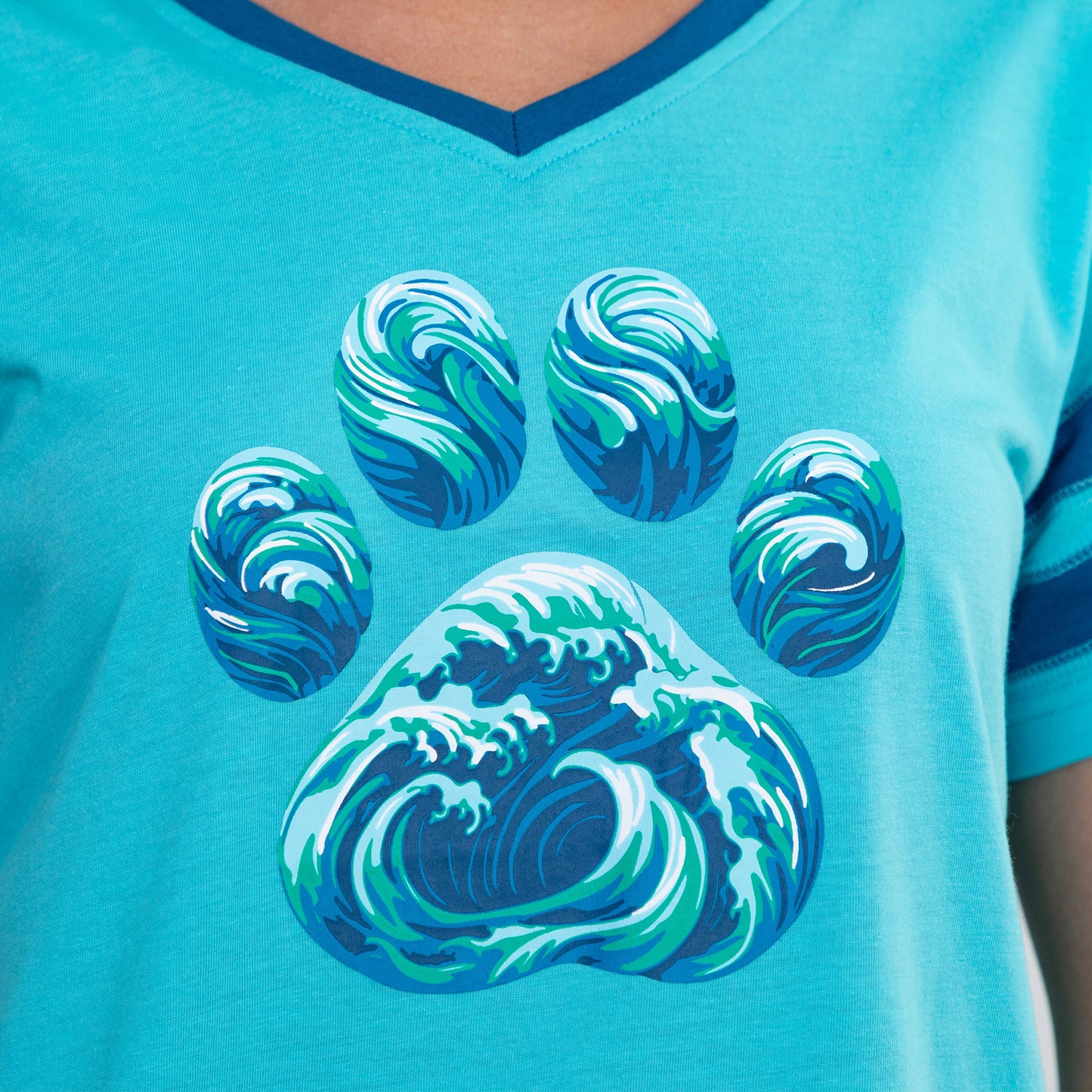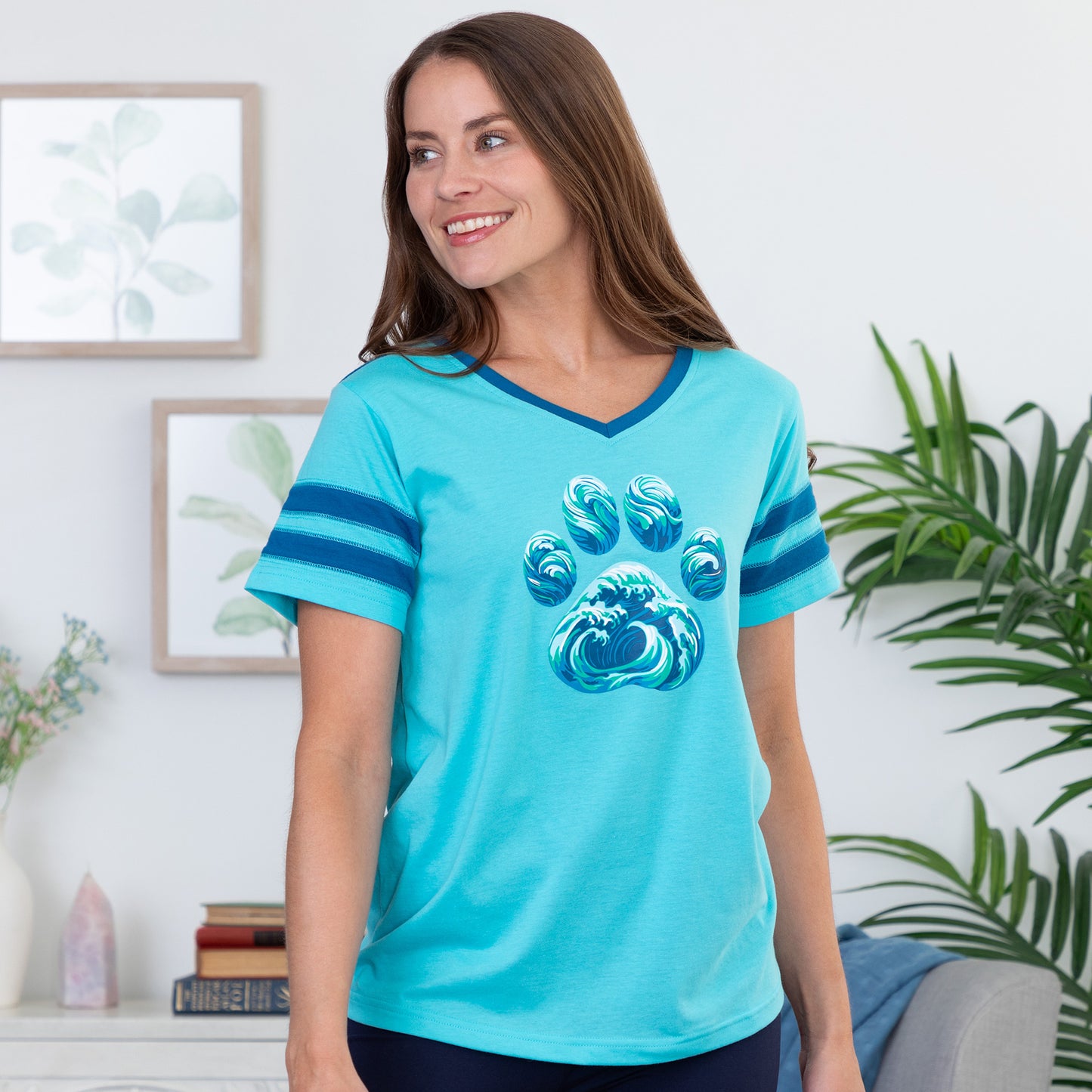 Introducing the Paw Waves V-Neck Football Tee, a stylish and sporty addition to your wardrobe. This bright blue tee features a unique paw print on the front, artistically filled with crashing waves, capturing both strength and serenity.