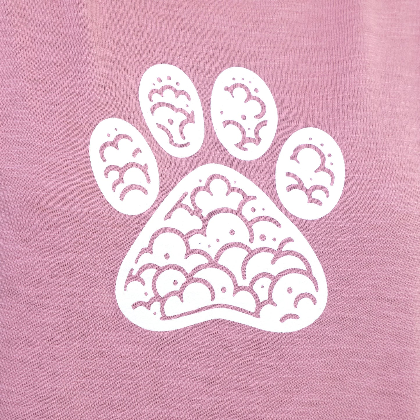 Picture yourself in the epitome of comfort and style with an orchid-colored slub muscle tank. Crafted for movement, its flowy fit allows for unrestricted motion, whether you're stretching, dancing, or simply lounging. The front boasts a whimsical touch with a paw print design filled with soft, dreamy clouds, adding a playful charm to your ensemble.