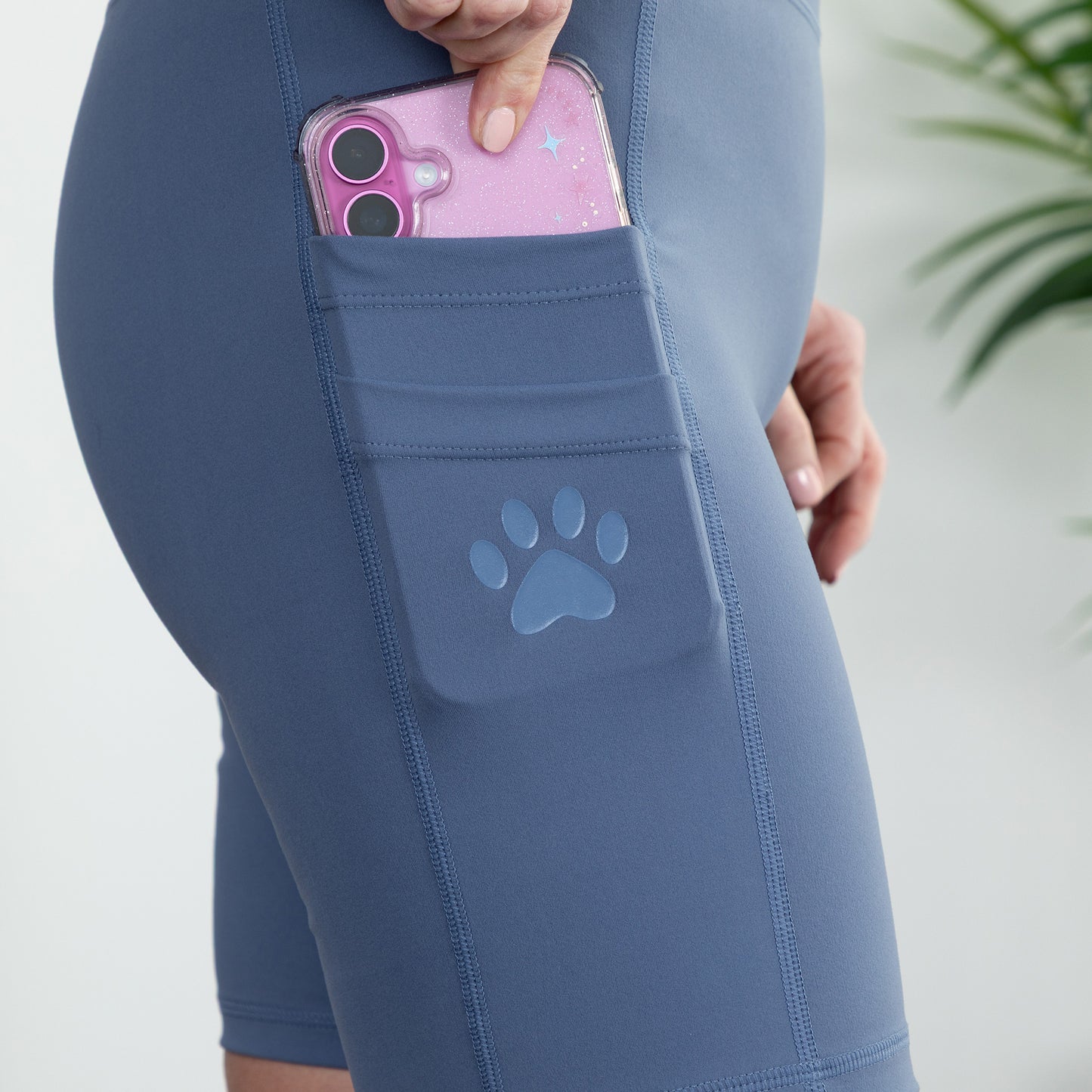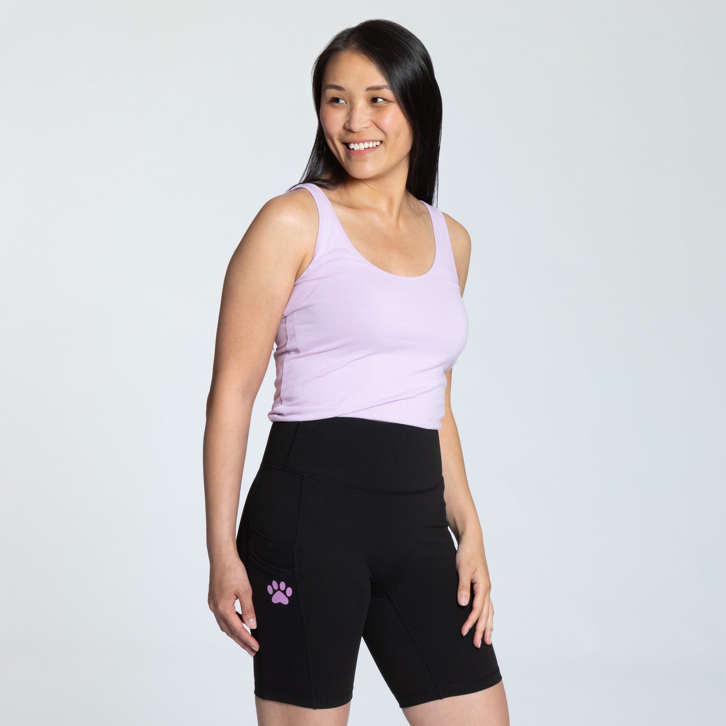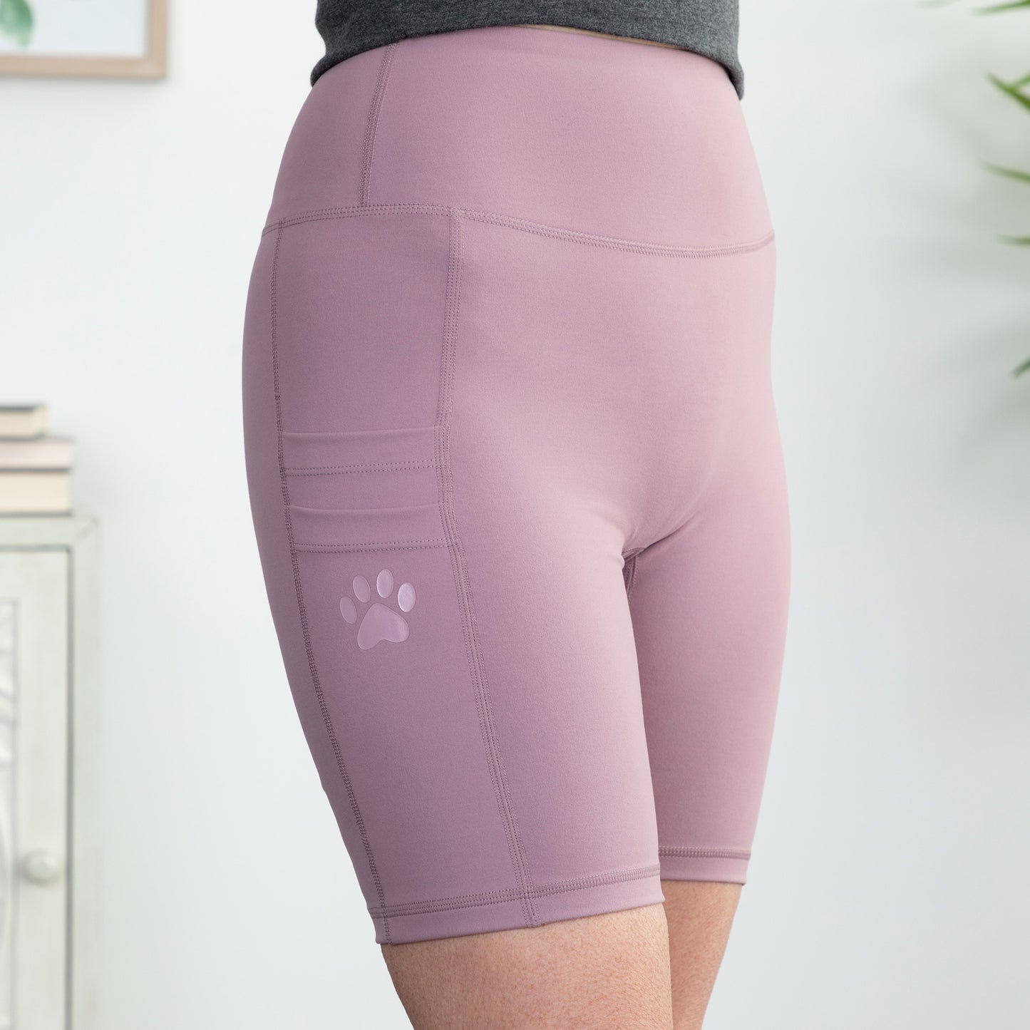 Embrace the day with soft, stretchy Paw Print High Rise Shorts! These black biker shorts feature a charming purple paw print on the side, adding a playful touch to your workout or casual wear. Designed with a high waist for a flattering fit and equipped with convenient pockets, these shorts combine fashion and function effortlessly. Perfect for any activity, they offer comfort and a touch of personality wherever you go.