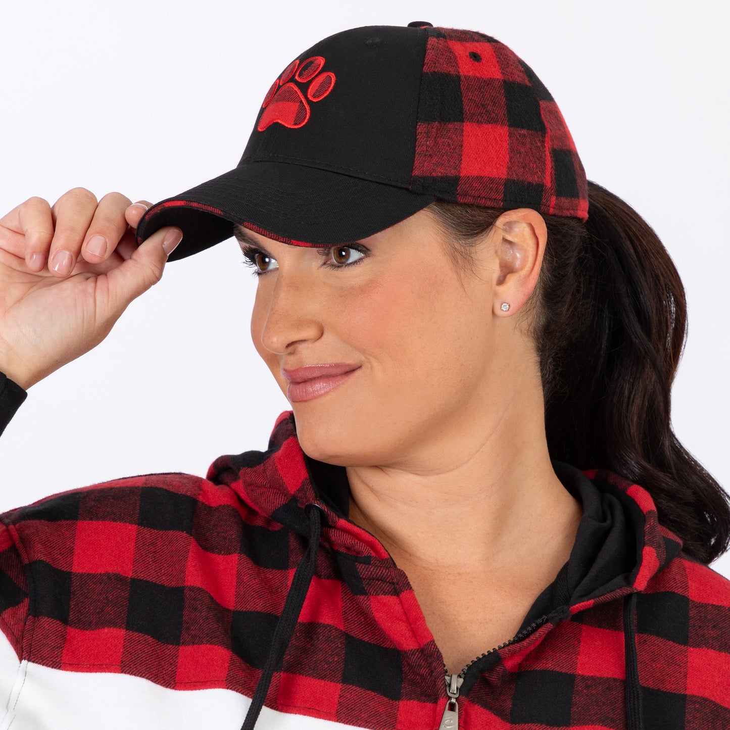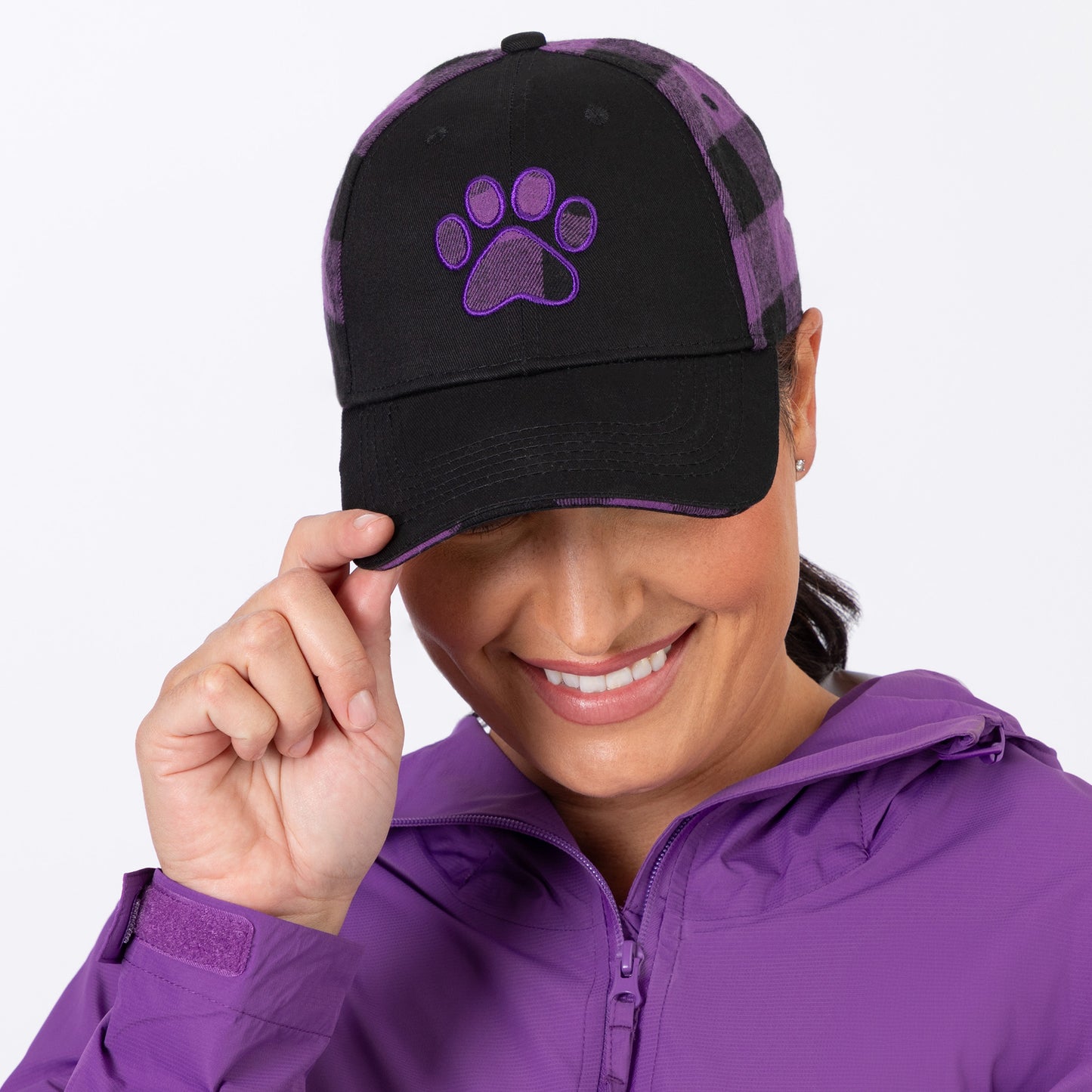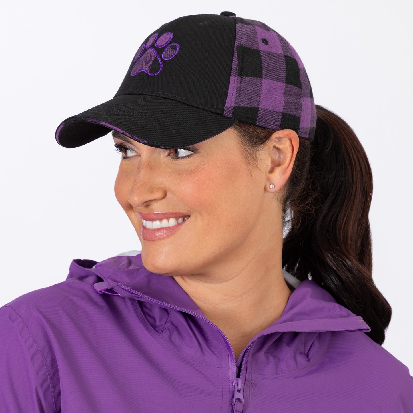 Top off your look with the playful charm of a paw print and plaid baseball hat! Featuring a bold paw print on the black front panel and a stylish plaid pattern on the back, this hat adds a fun twist to any outfit. Available in purple or red, it offers a comfy fit with its adjustable Velcro strap, making it perfect for everyday wear. Whether you're running errands or heading outdoors, this hat is a must-have for paw lovers!