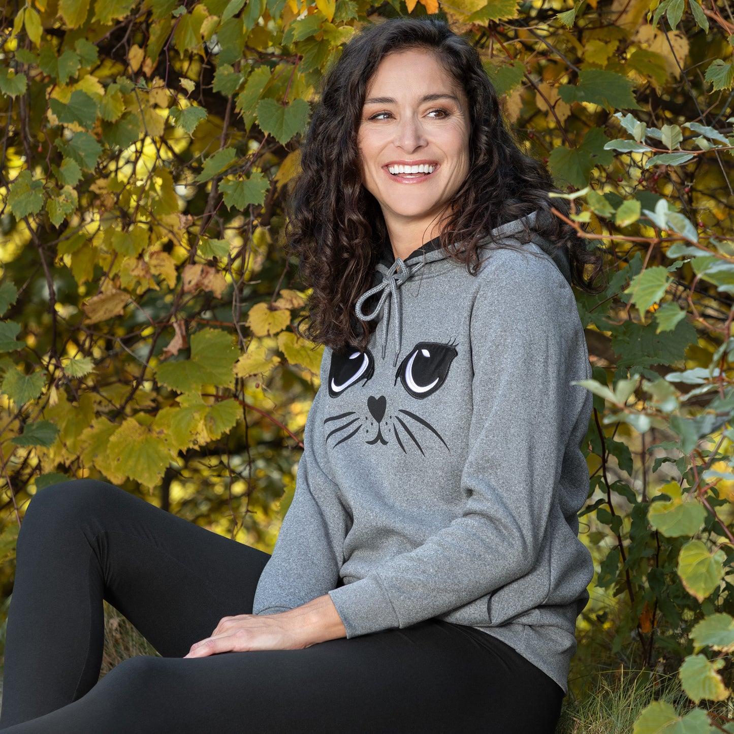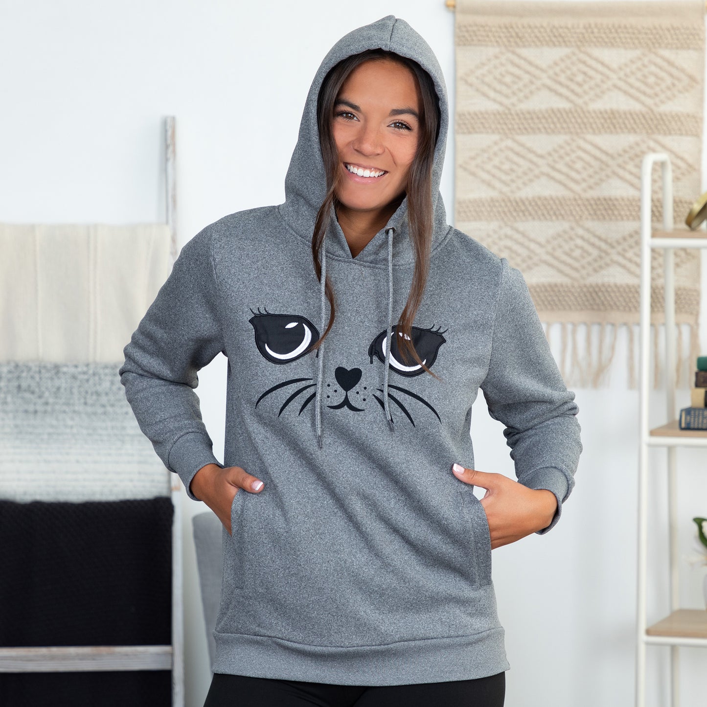 Wrap yourself in cozy charm with a dark heather gray hooded sweatshirt, featuring an adorable embroidered cat face on the front. Perfect for casual outings, this sweatshirt offers a drawstring hood for extra warmth and two side pockets to keep your hands snug or hold small essentials. Embrace comfort and style with this must-have hoodie that blends playful design with practical functionality.