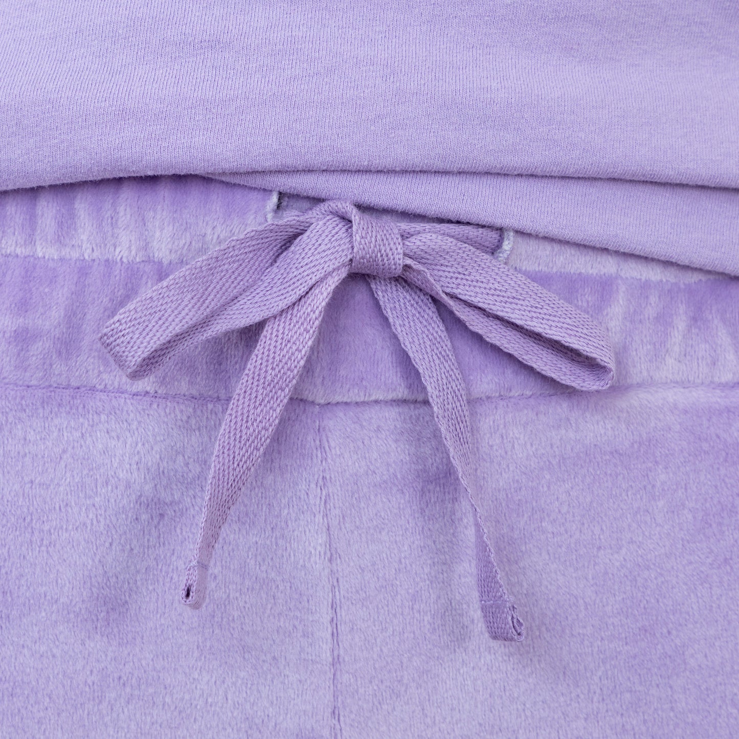 Indulge in luxurious comfort with a pair of Velour Paw Print Straight Leg Pants. Crafted from ultra-soft velour in elegant black or soothing lavender, these pants feature a practical elastic waistband and two handy side pockets. Plus, they're lined in a super soft brushed fleece, so they feel as good as they look! Embroidered paw prints on the leg add a charming touch, making them a cozy essential for lounging in style.