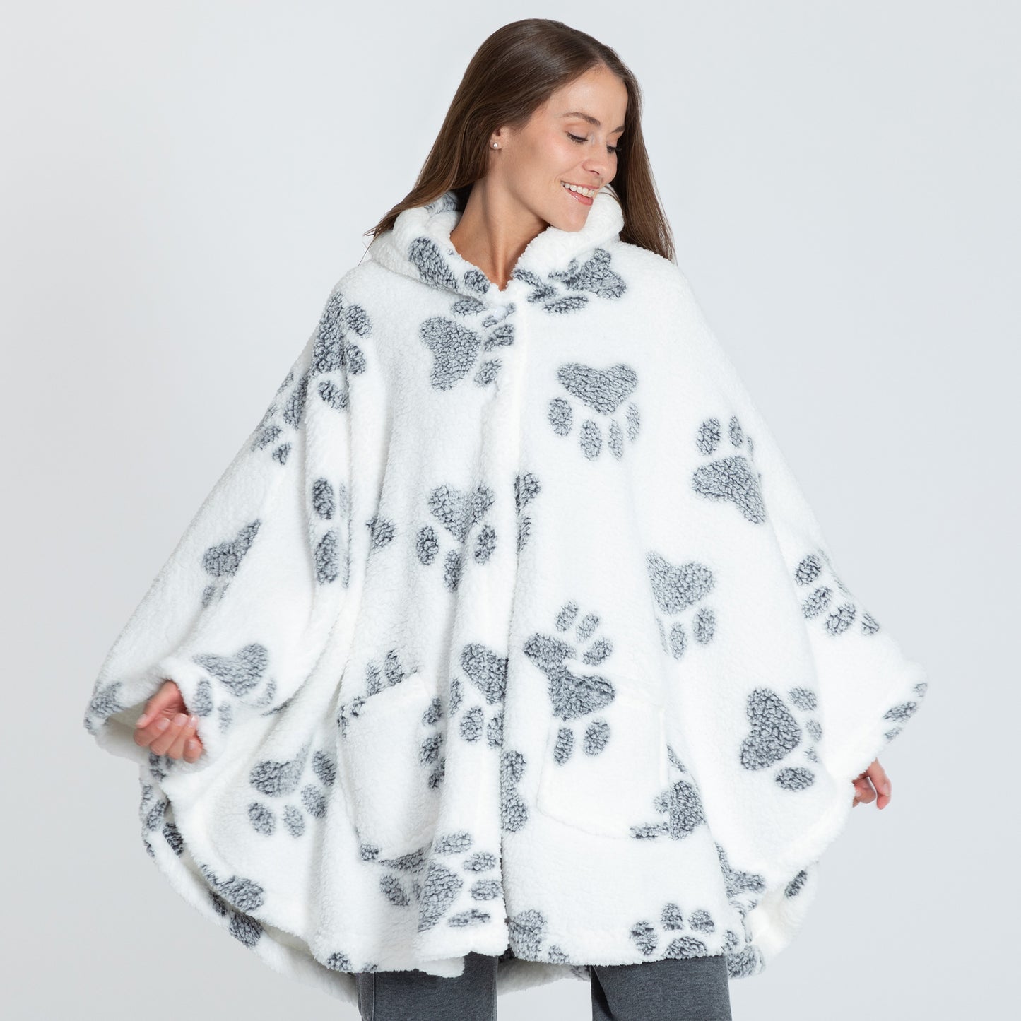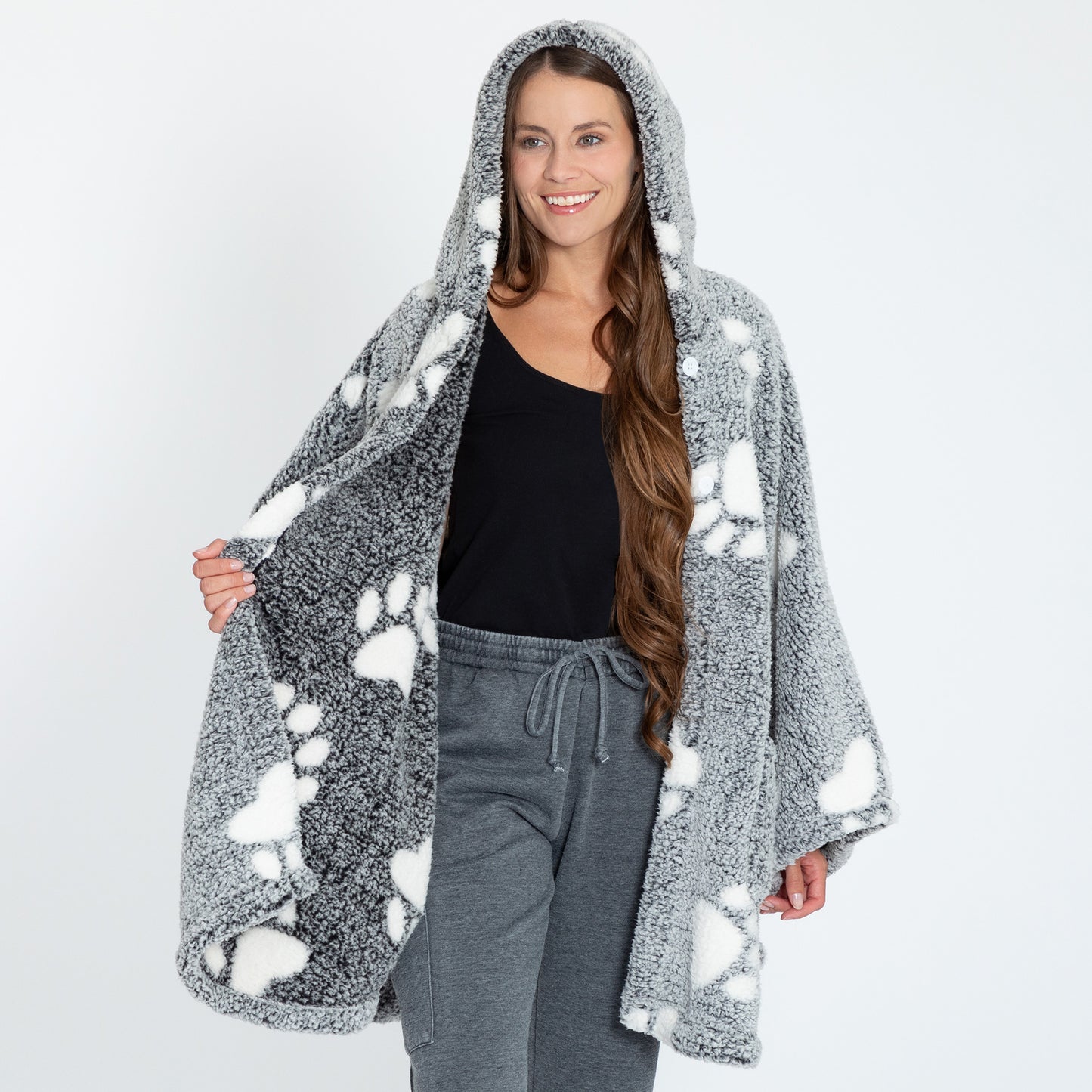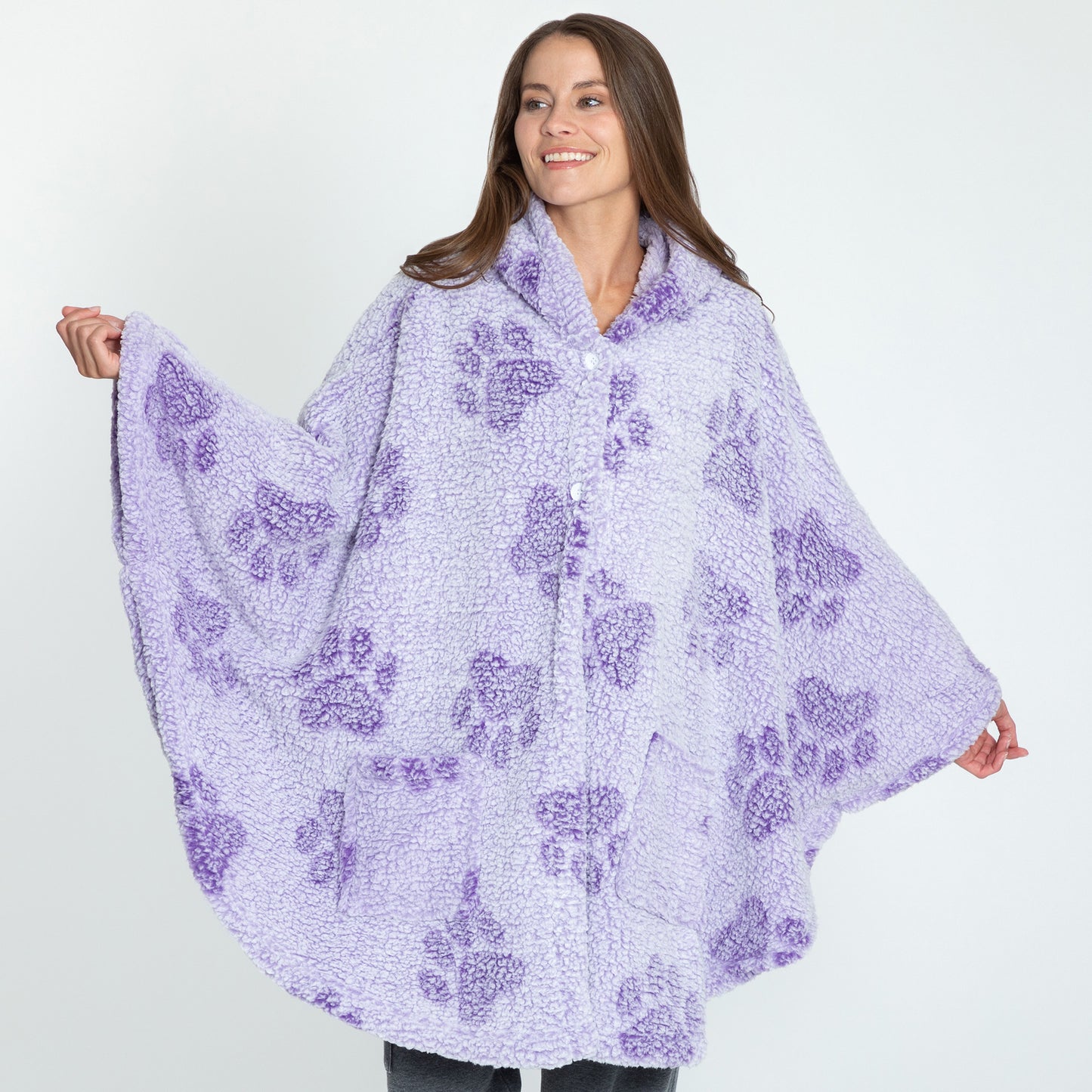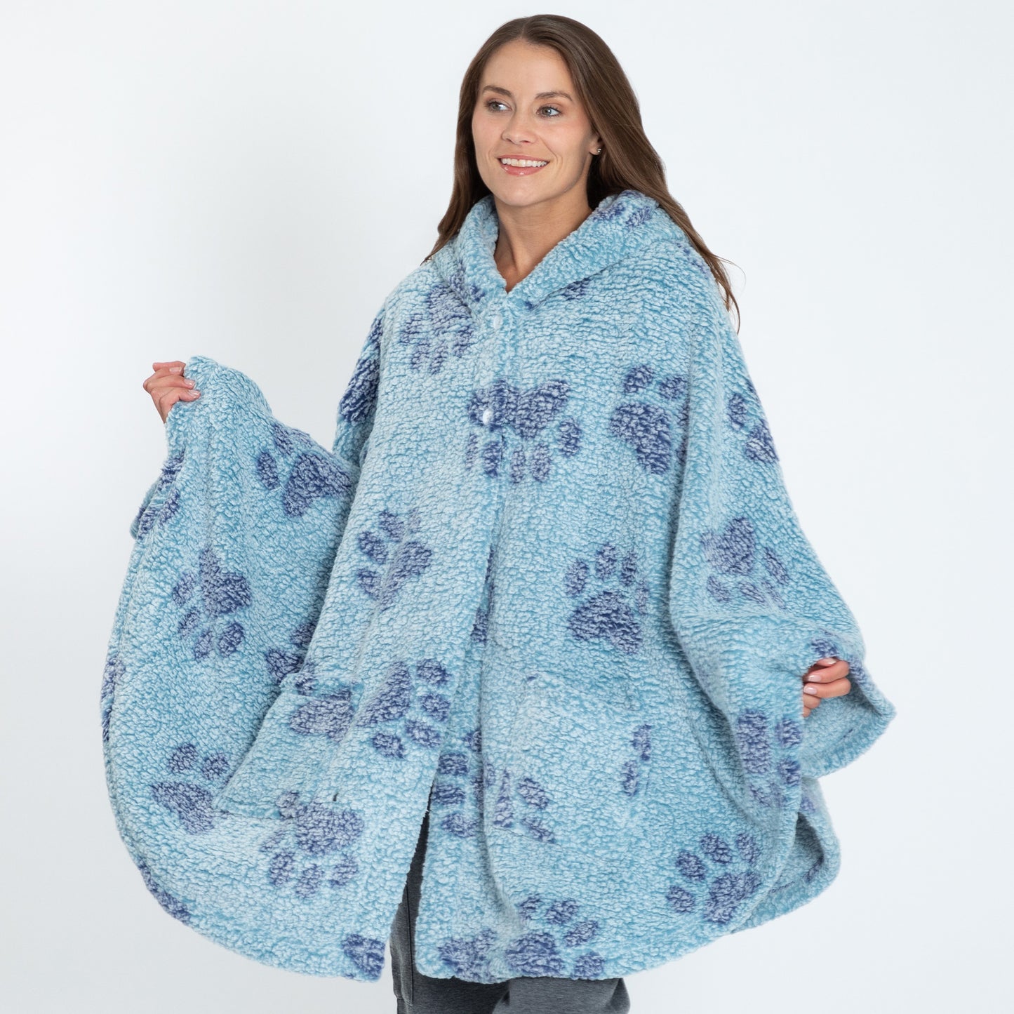 Wrap yourself in unparalleled warmth and comfort with the Cozy in Paws Sherpa Fleece Cape. Crafted from thick and plush paw-printed Sherpa fleece, this cape with a plush hood offers both style and functionality. Featuring two deep pockets for convenience and two buttons to secure the front, it ensures a snug fit. The loose armholes, created by side stitches, provide easy movement while keeping you cozy. Perfect for chilly days and nights!