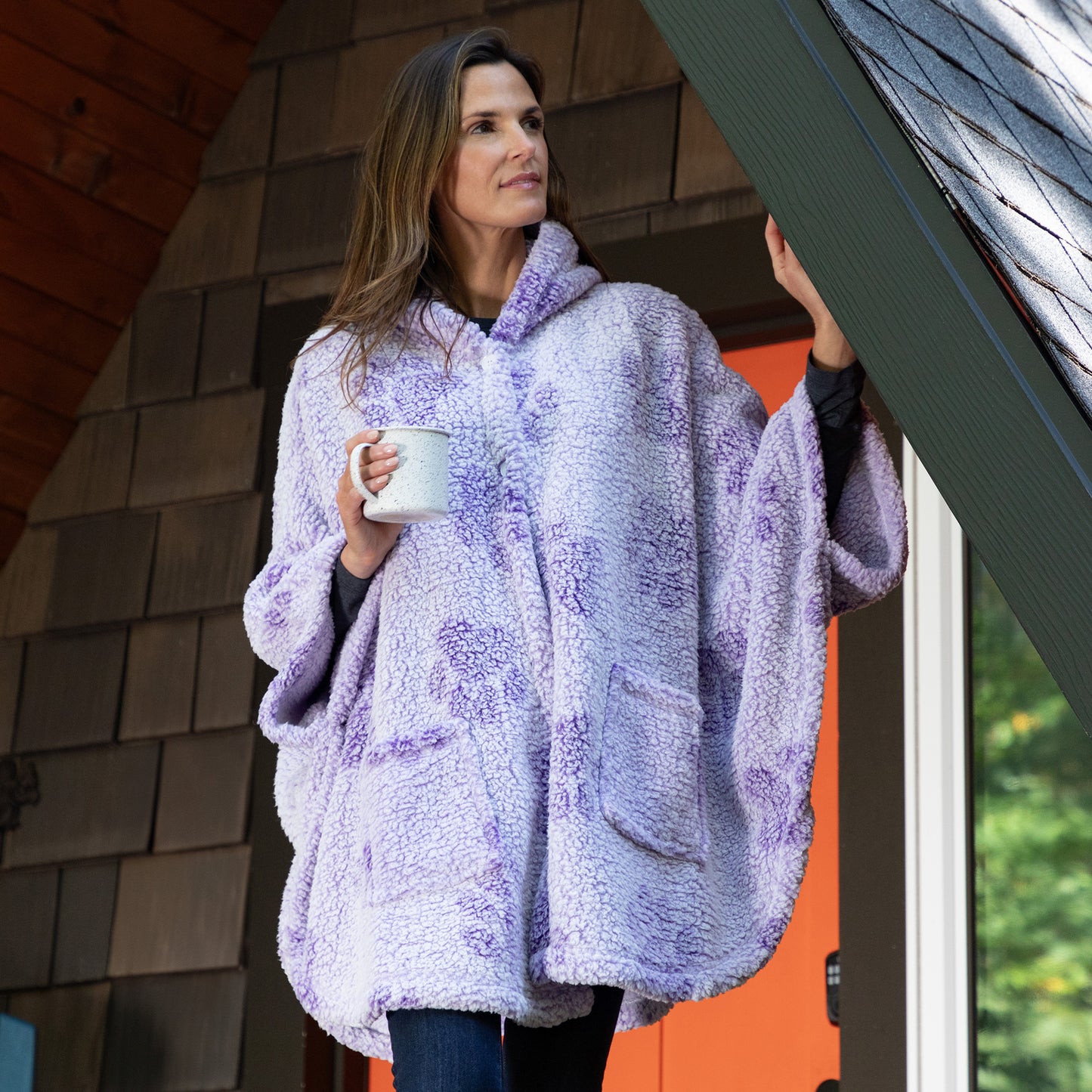 I looked at this cape several times and finally went for it and got the purple color. The last few days have been chilly so I wore the cape in the house with a lightweight sweater underneath. It is so warm and comfortable and the light weight adds to its cosyness.