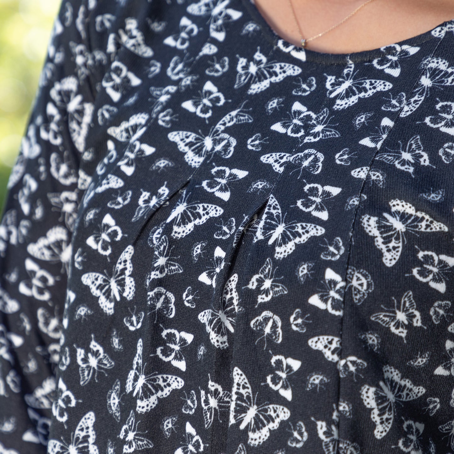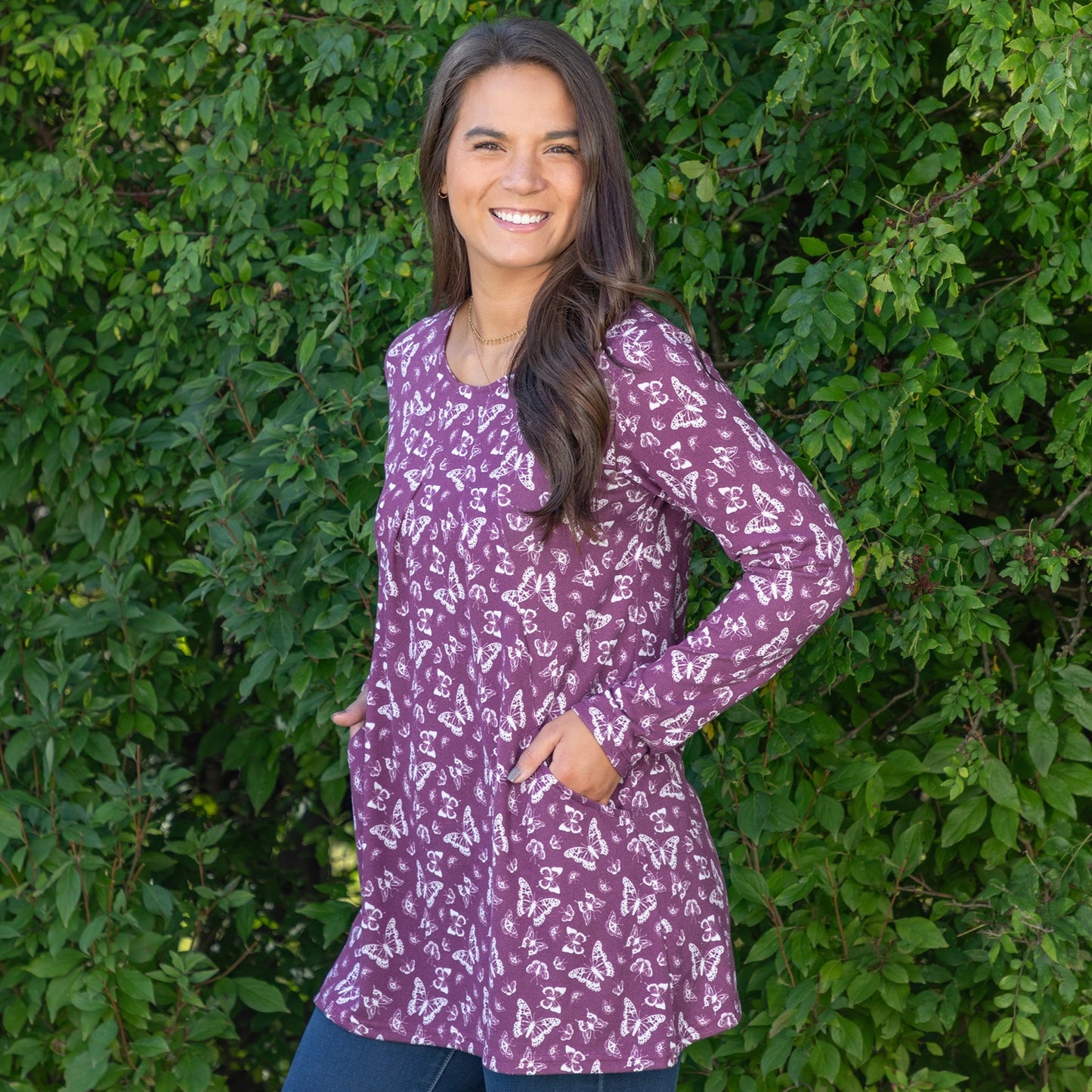 Soft fabric with just the right amount of stretch, this long sleeve tunic pairs comfort and a pretty pattern with butterflies that flit and flutter all around. Made with a flattering scoop neck, a flowy silhouette, and two side pockets!