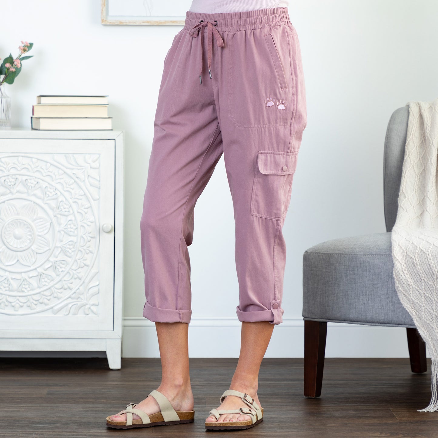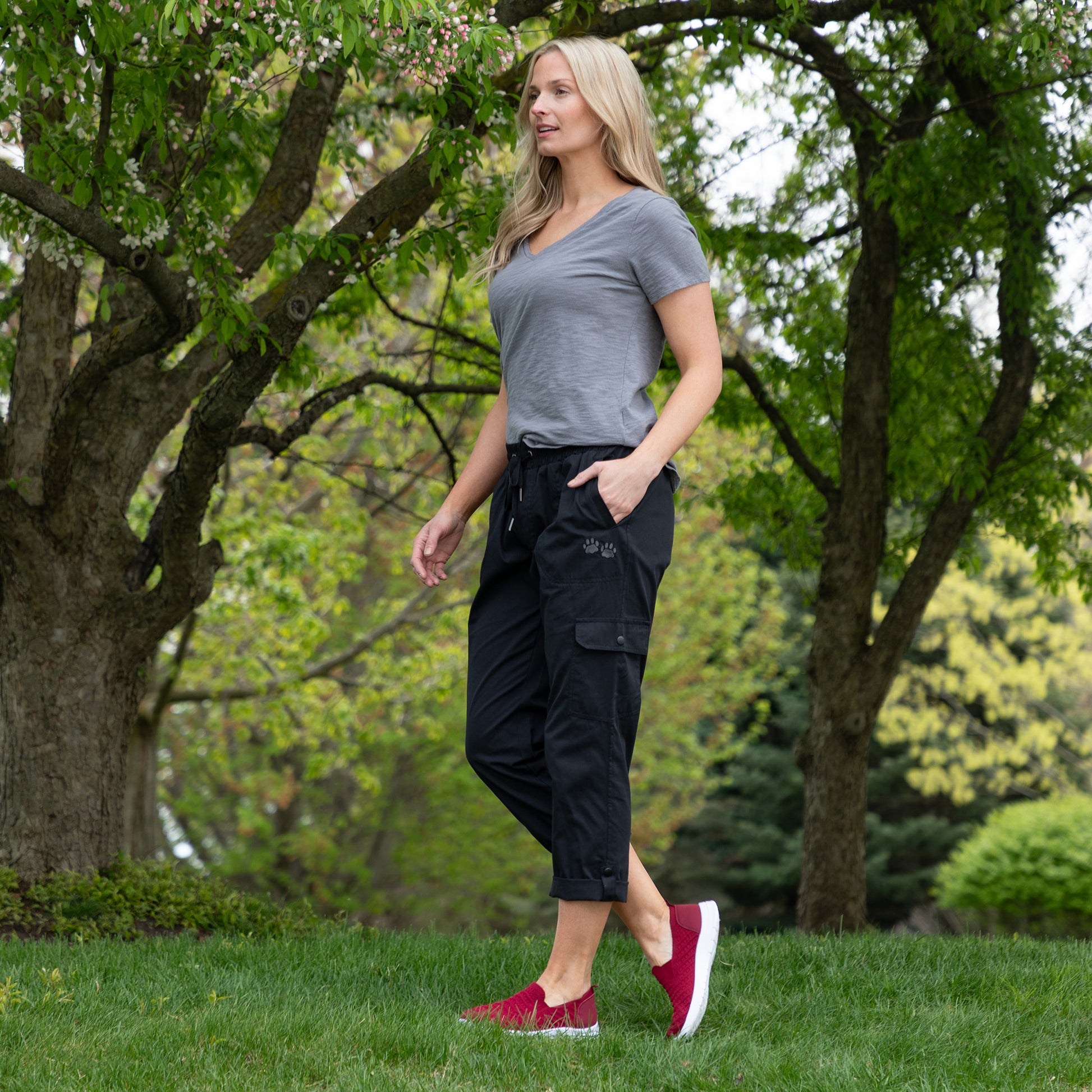 - Roll pant legs to convert to capri style, secure with snap closure