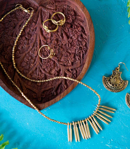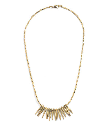 The spiked accents of the Akrita spiked collar rest like the gold rays of the sun in this unique collar necklace with beaded chain.