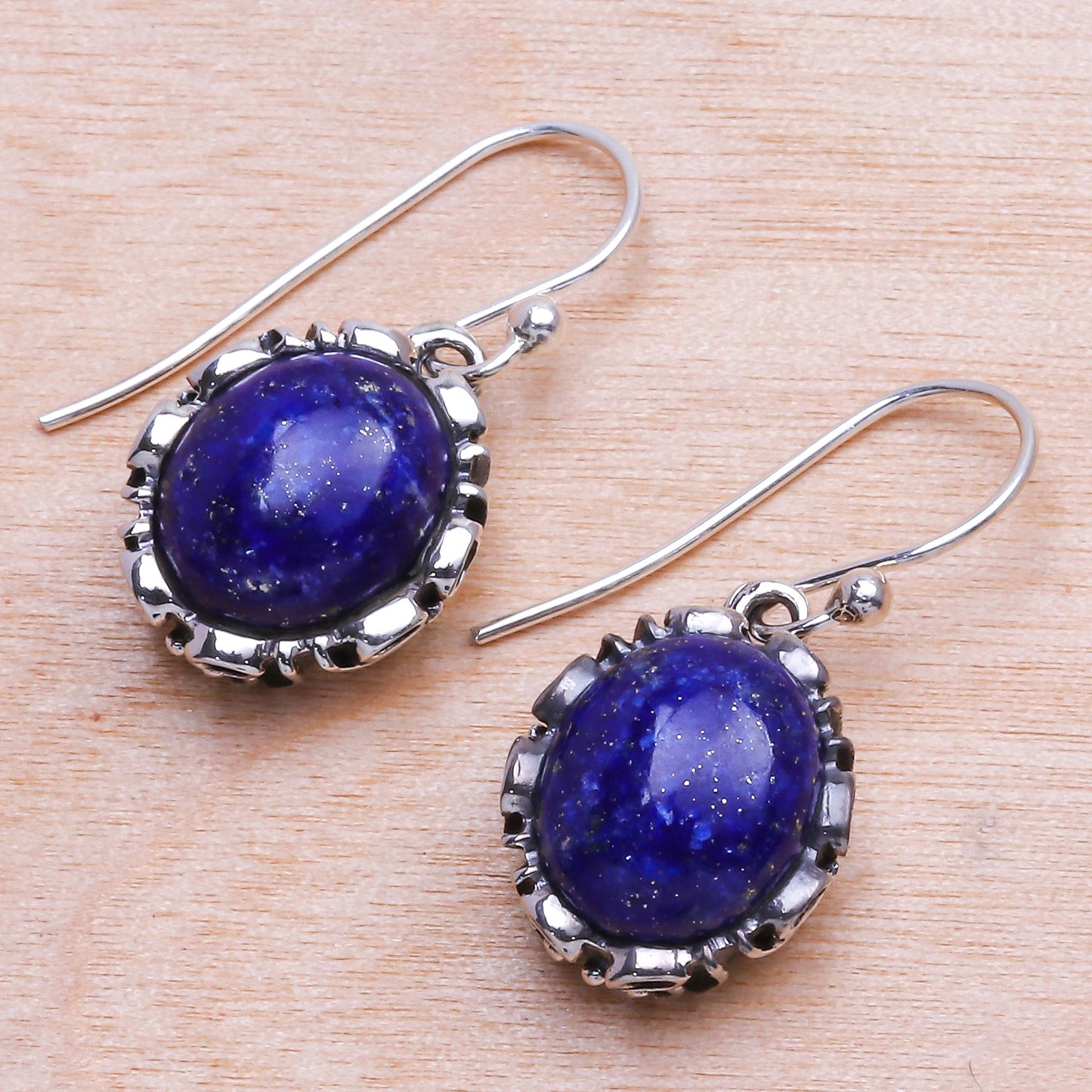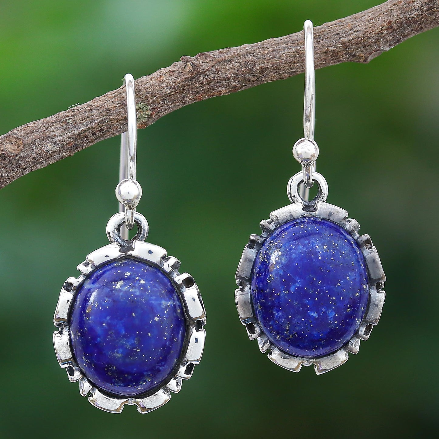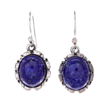 Thailand's Abhishek Singla presents these richly colored lapis lazuli dangle earrings, set in sterling silver. The polished gemstones are complemented by cast bezels, finished with oxidization for depth and character.