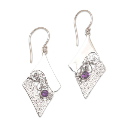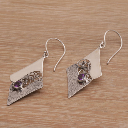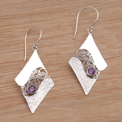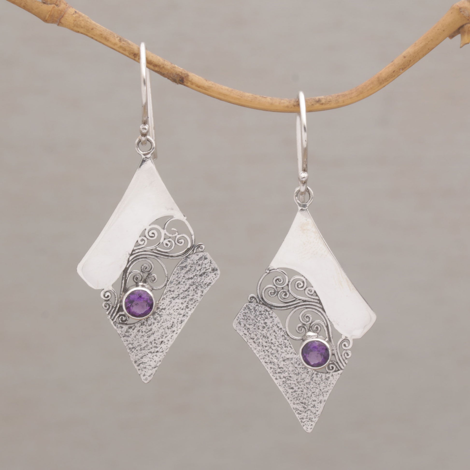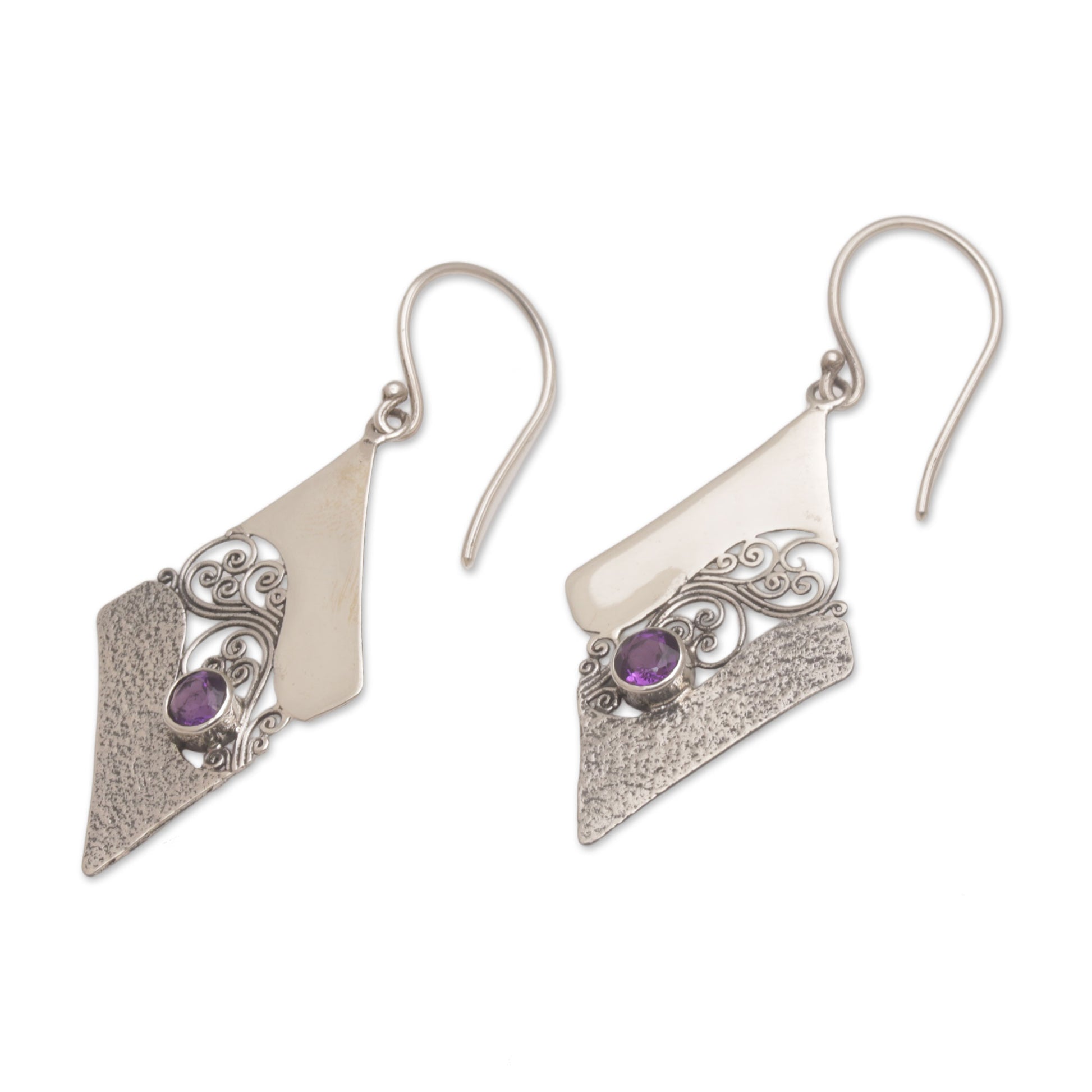 The diamond-shaped outline of the sterling silver dangle earrings feature a glittering amethyst in the midst of a playful swirl motif. Eka Devi of Bali presents these sterling silver earrings that feature both an oxidized and high polish finish. The different textures lend these sterling silver earrings a unique look.