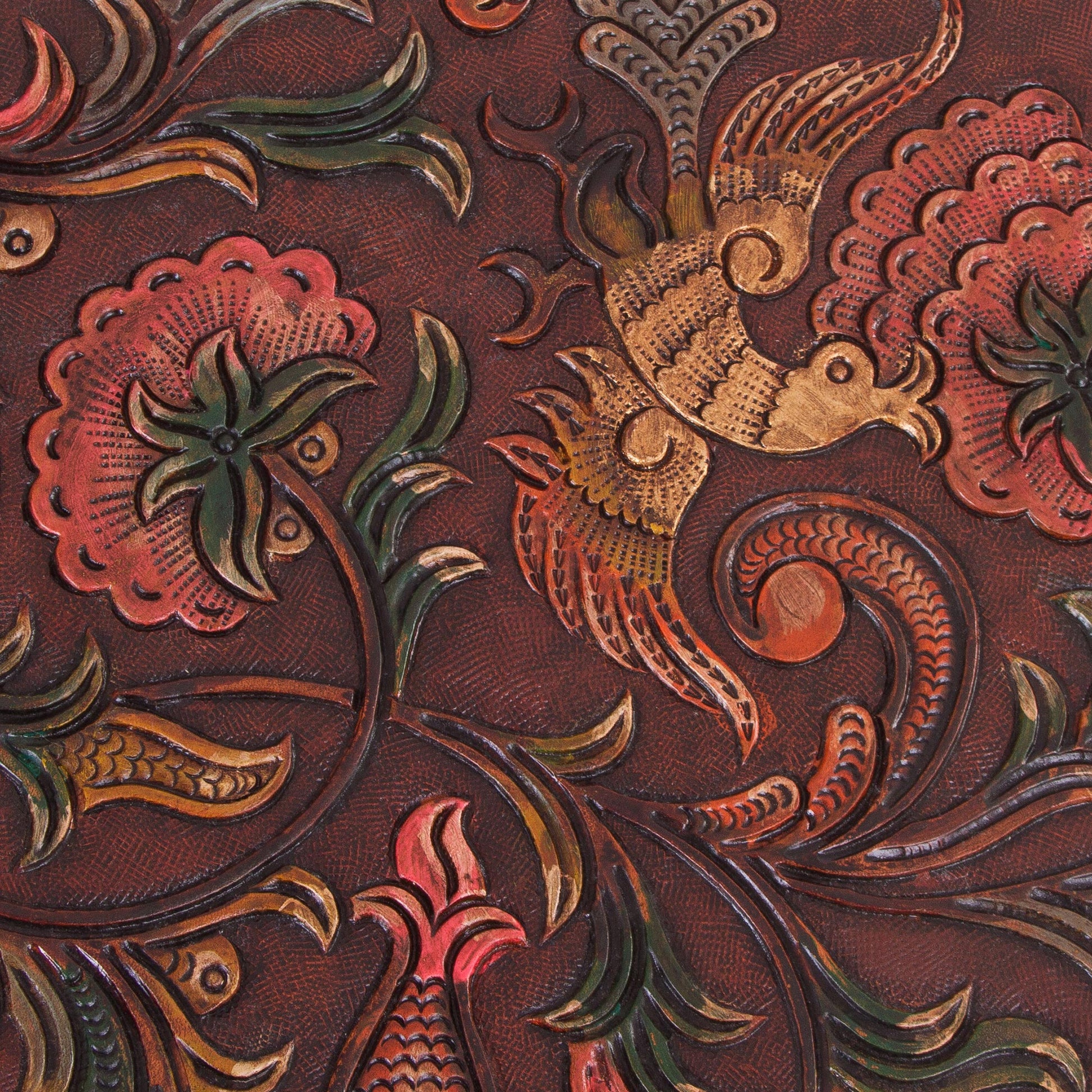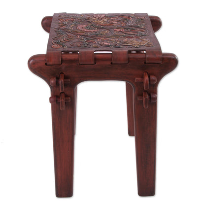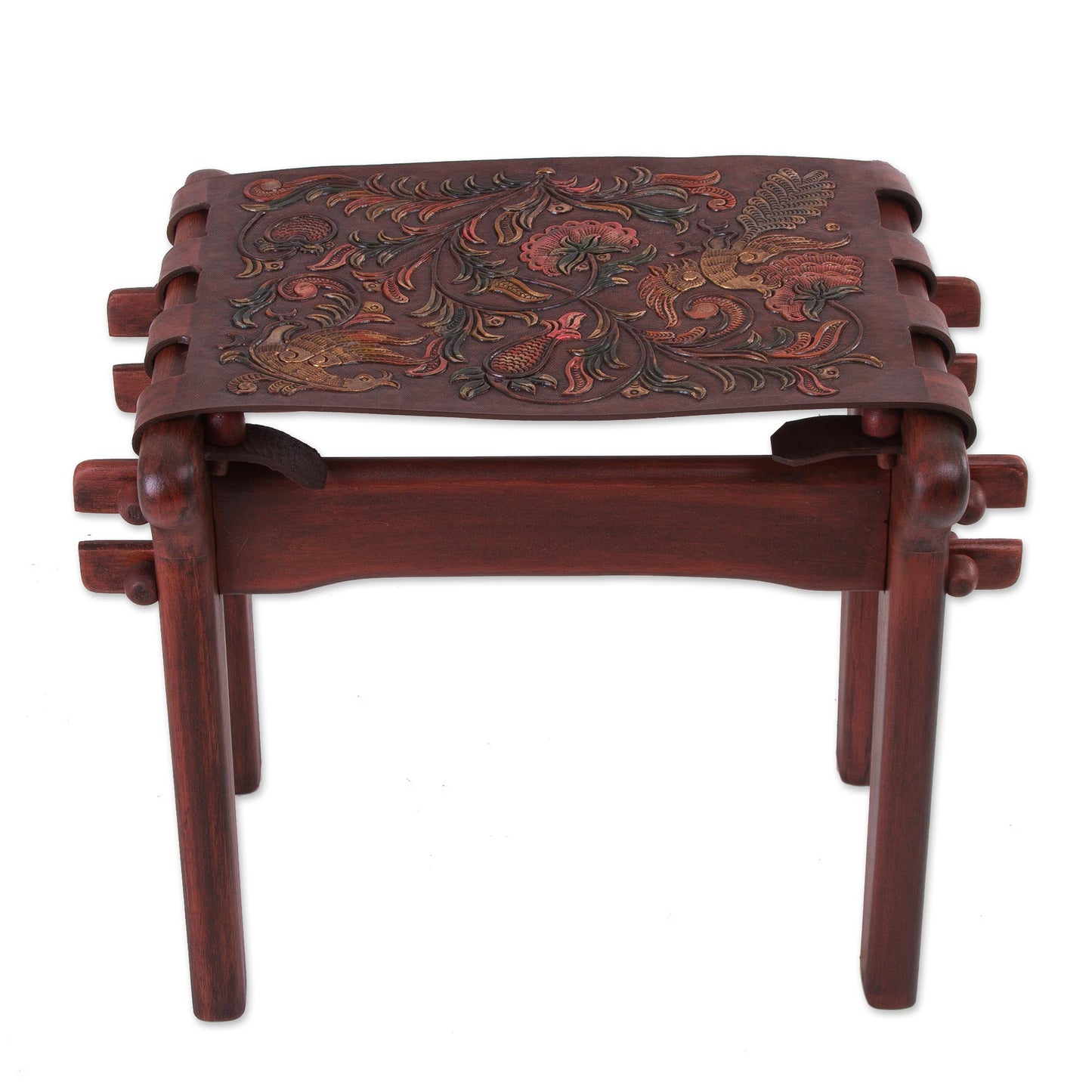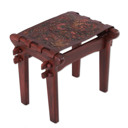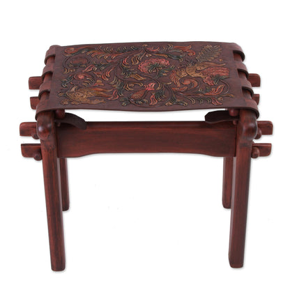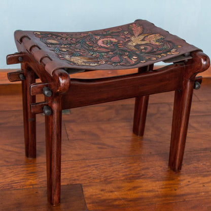 Andean Paradise Birds and Flowers Embossed on Leather and Wood Stool
