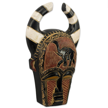 Featuring tusk-like horns and depicting an elephant on the forehead, this mask exudes boldness and strength. Saeed Musah of Ghana presents this animal-inspired mask intricately carved from sese wood and featuring a rustic finish over textured brass. The name Azubuike means 'the past is your strength' in a West African language.