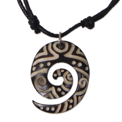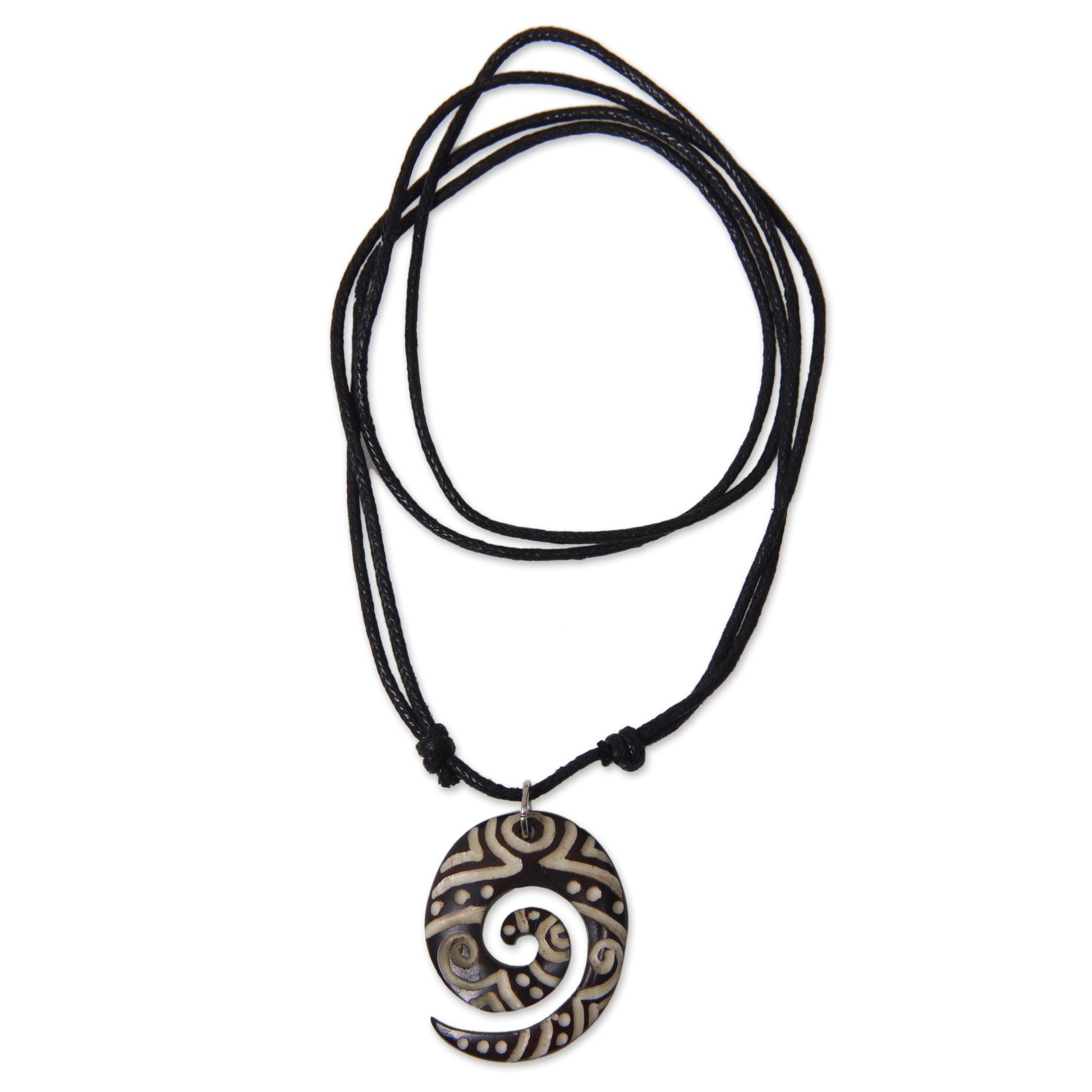 Ornate motifs are etched into the hand-carved bone and a black cotton cord completes the necklace. Carved in a graceful spiral, this necklace evokes Bali's lush fern forests. Its length can be adjusted by sliding the knots along the cord.