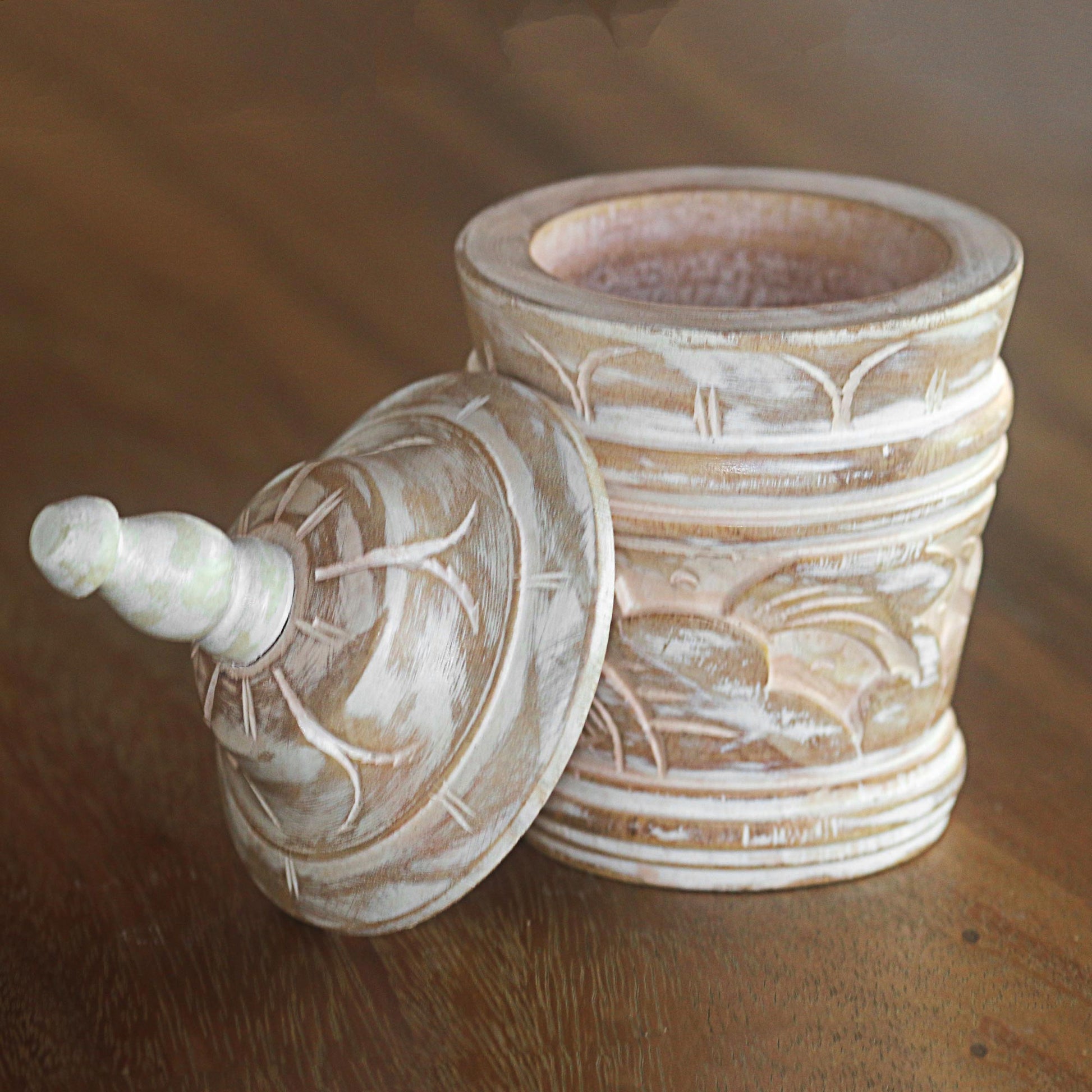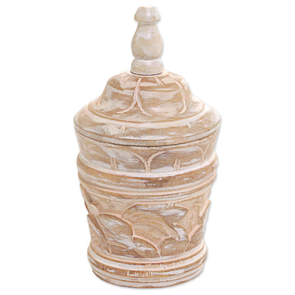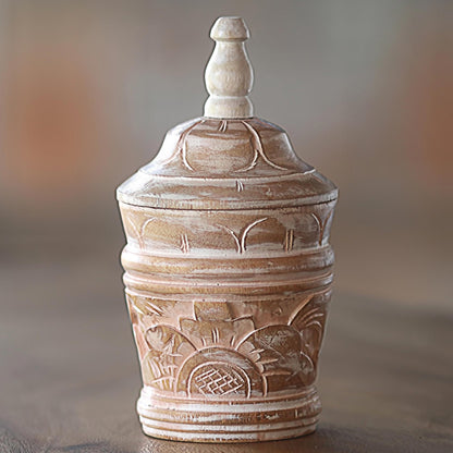 Learning wood carving at a young age, Indonesia's Sarwaedi is proud to present his own designs in this decorative box. Hand-carved from mahogany wood into a round, cylindrical shape with floral motifs, this piece features a spire atop the lid.