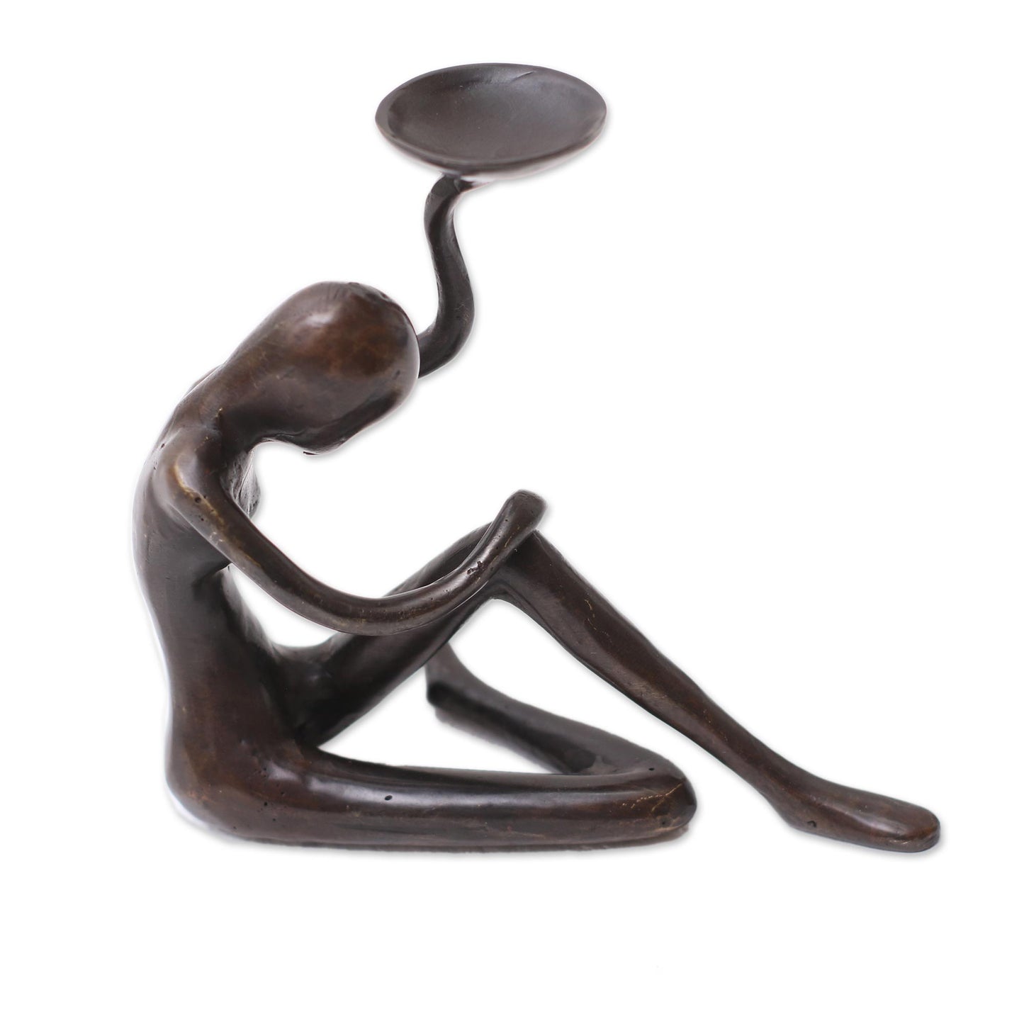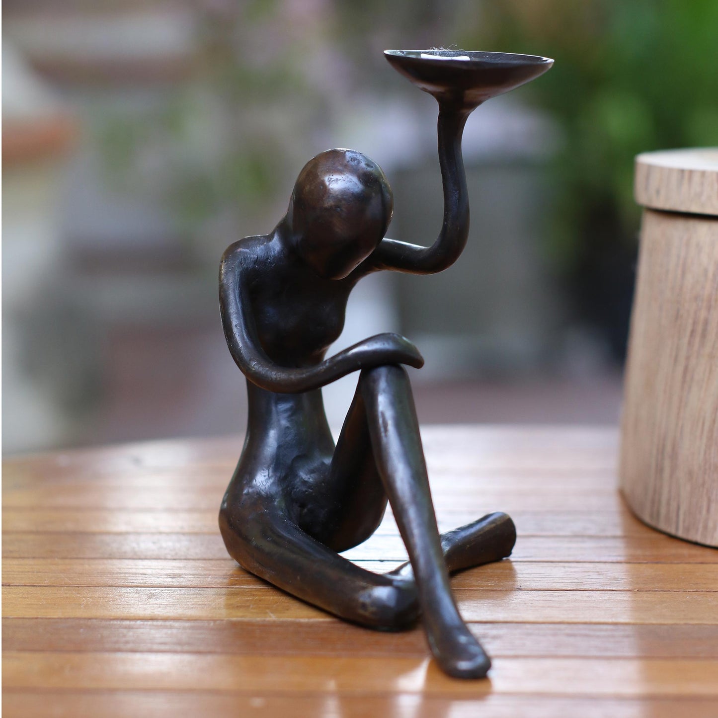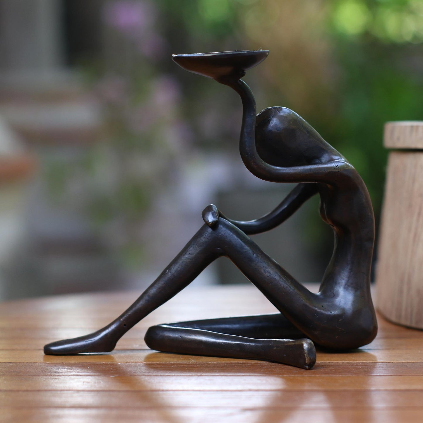 Sitting in a reclined posture, a ballet dancer holds a bowl above their head. By Balinese artisan Adi Noviantara, this figurine is cast from bronze that is treated with a dark, antiqued finish. This figurine can double as a candle holder; a candle or tealight fits in the bowl.