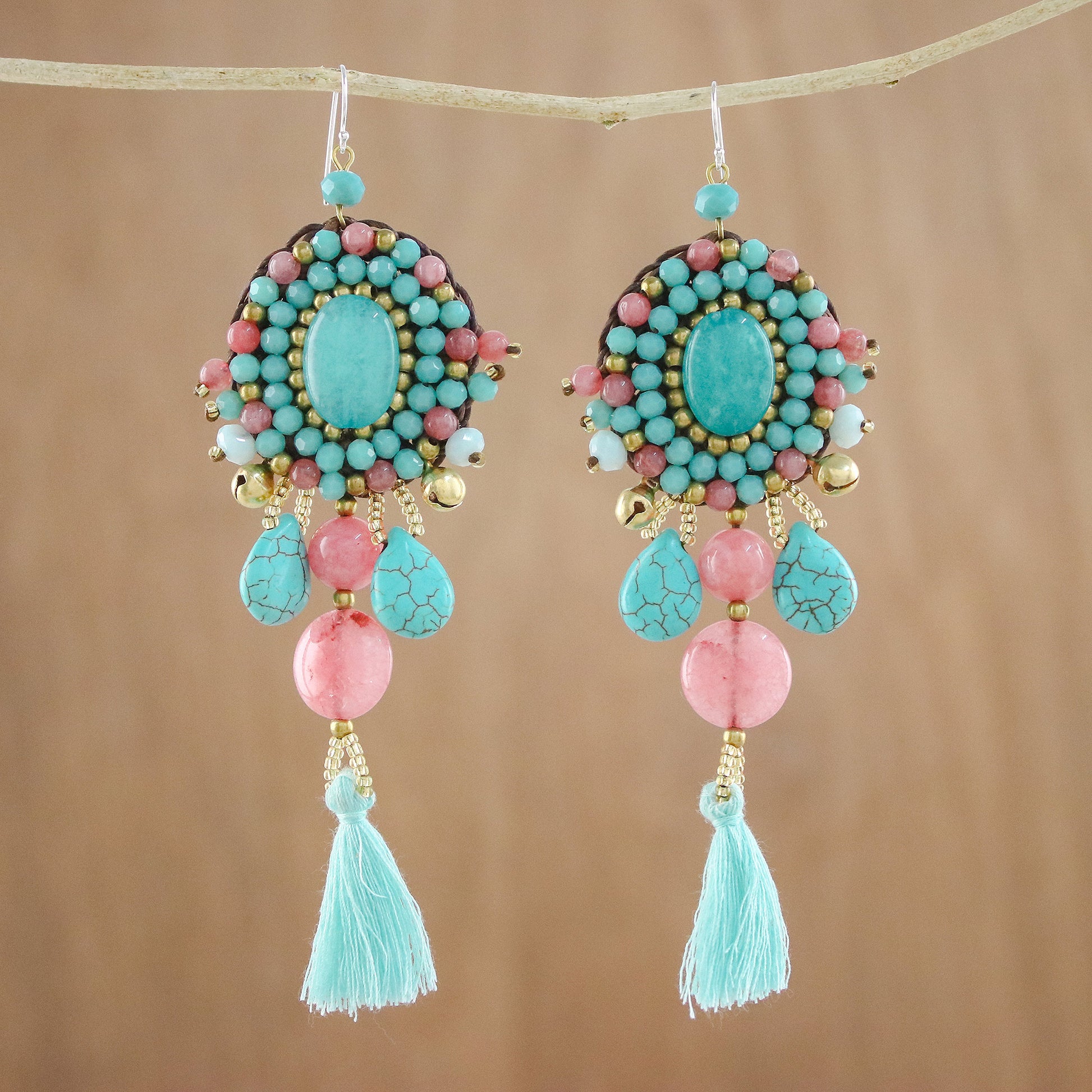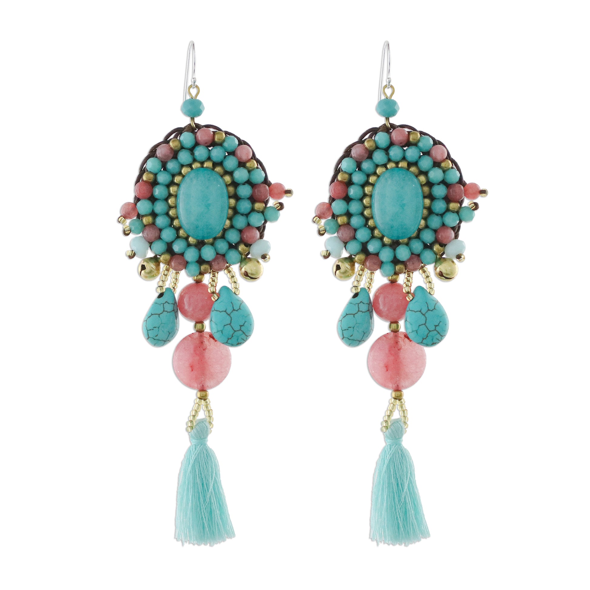 These dangle earrings handcrafted by Thai artisan Nareerat are dressed up for a night on the town. Sterling silver hooks support an explosion of beads threaded on brown waxed polyester cord, starting with nested ovals of blue glass, brass, and pink dyed quartz, all surrounding a large oval cabochon of blue dyed quartz. From the beaded ovals hang two brass jingle bells, larger round pink dyed quartz beads, and two large teardrops of blue dyed calcite. Swinging jauntily at the bottom is a blue cotton tassel.