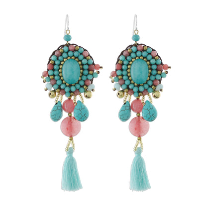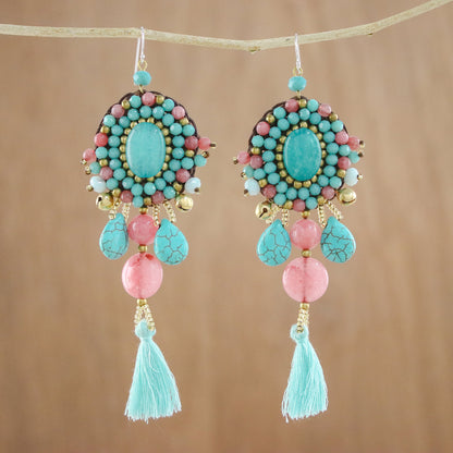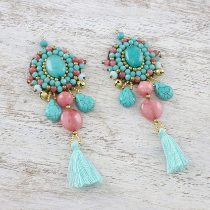 Ballroom Chic in Aqua Pink Quartz Blue Calcite Beaded Oval Tassel Dangle Earrings