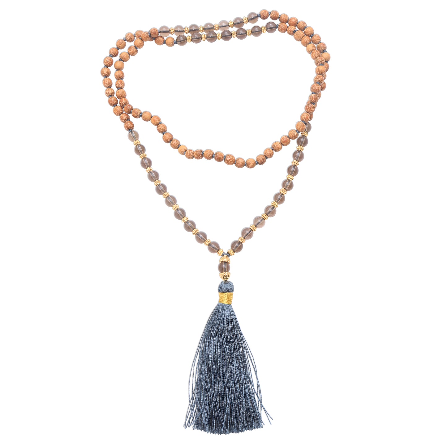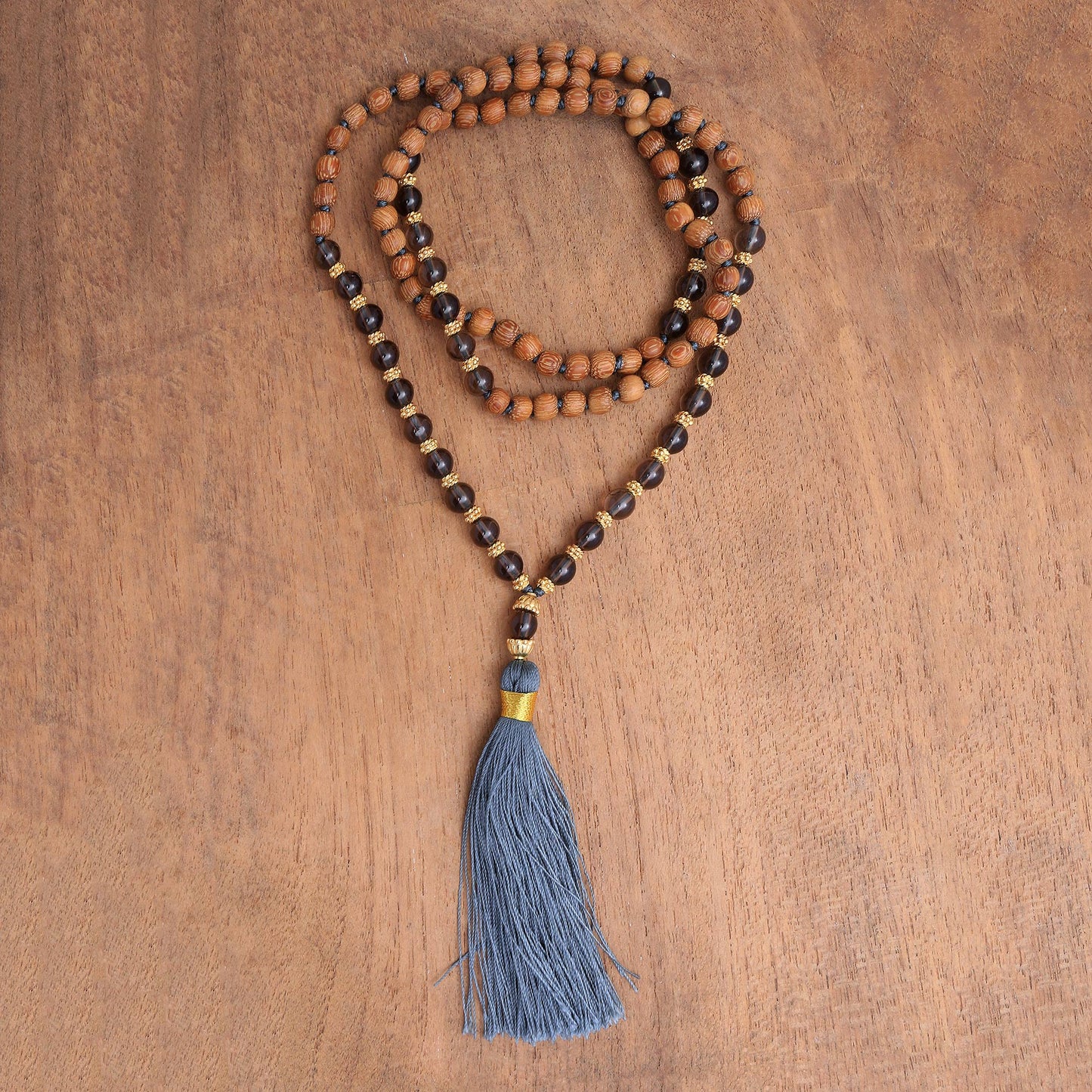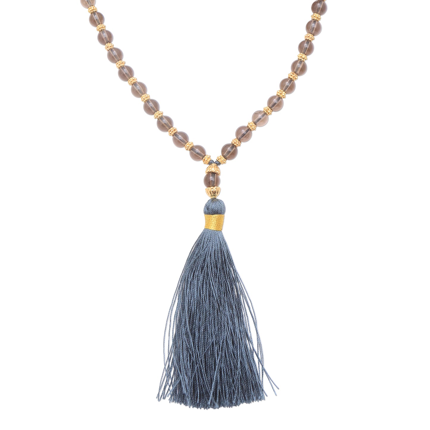 Inspired by the beauty of the Batuan village in Bali, Ketut Sulastri designs a beaded necklace to add harmony to your wardrobe. Beads of smoky quartz and cumala wood alternate with beads crafted of 22k gold plated sterling silver. A blue tassel dangles at the pendant.