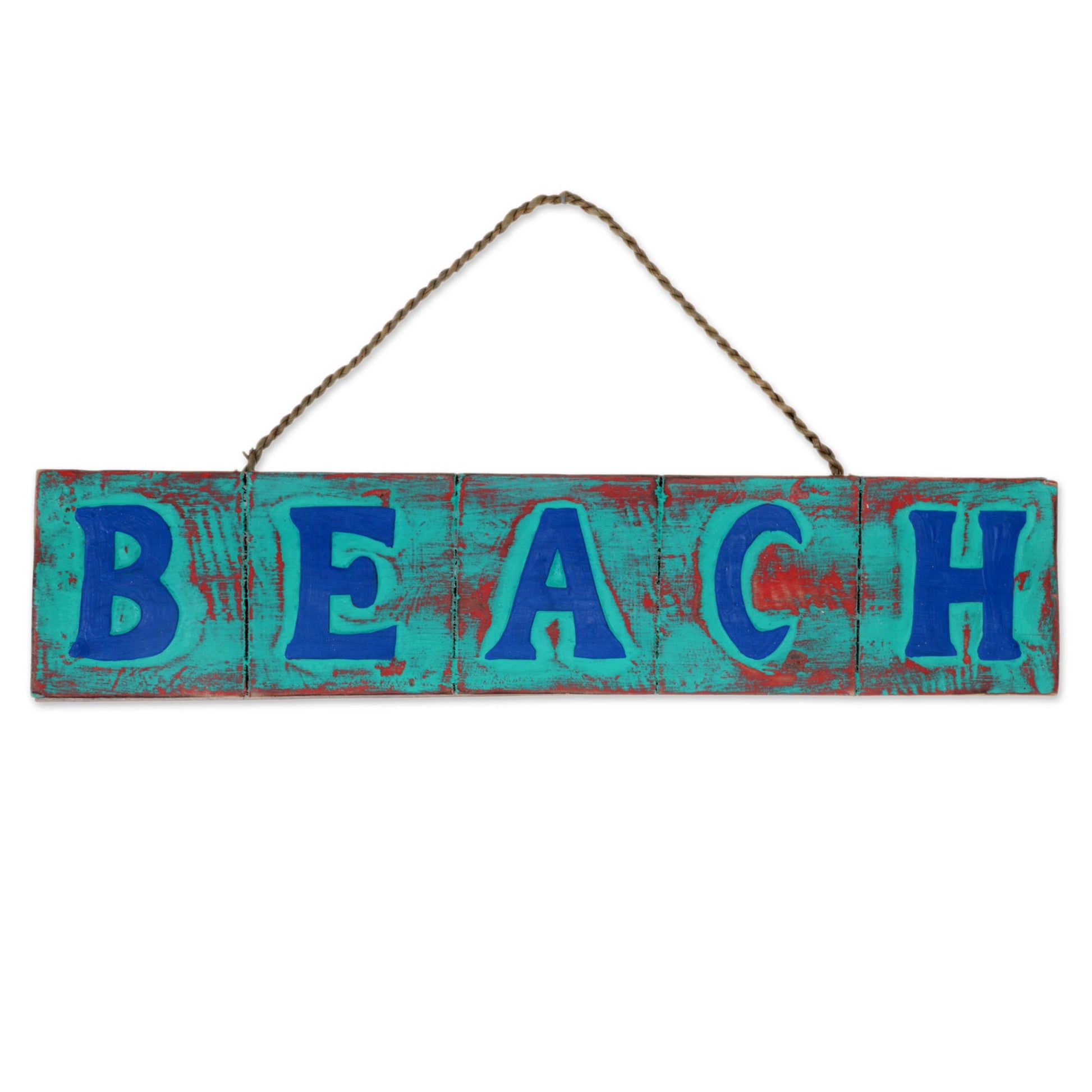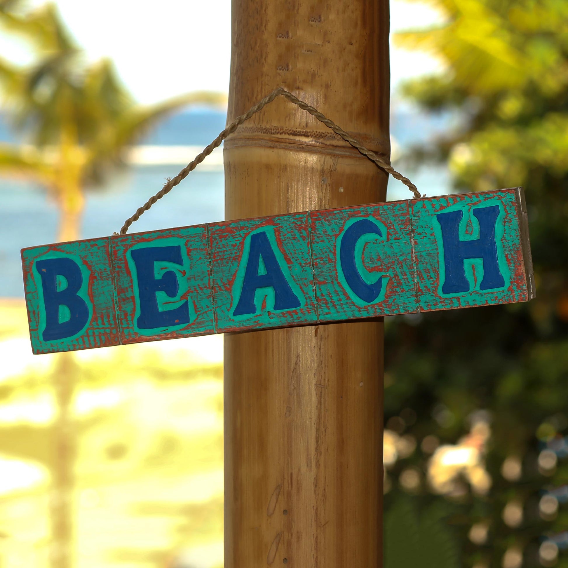 Beach in Turquoise and Red Hand Carved Beach Wood Sign Agel Grass from Indonesia