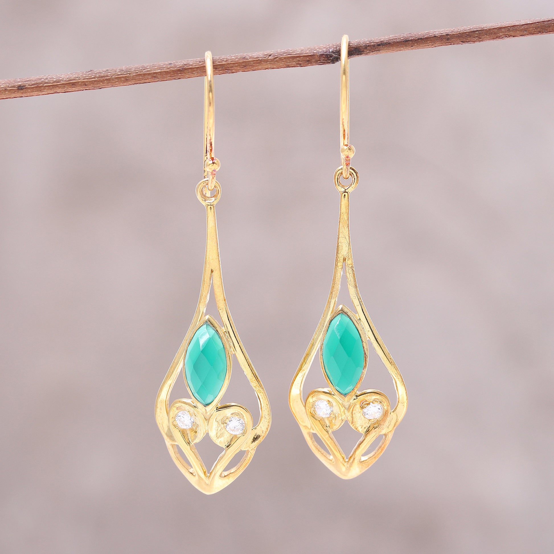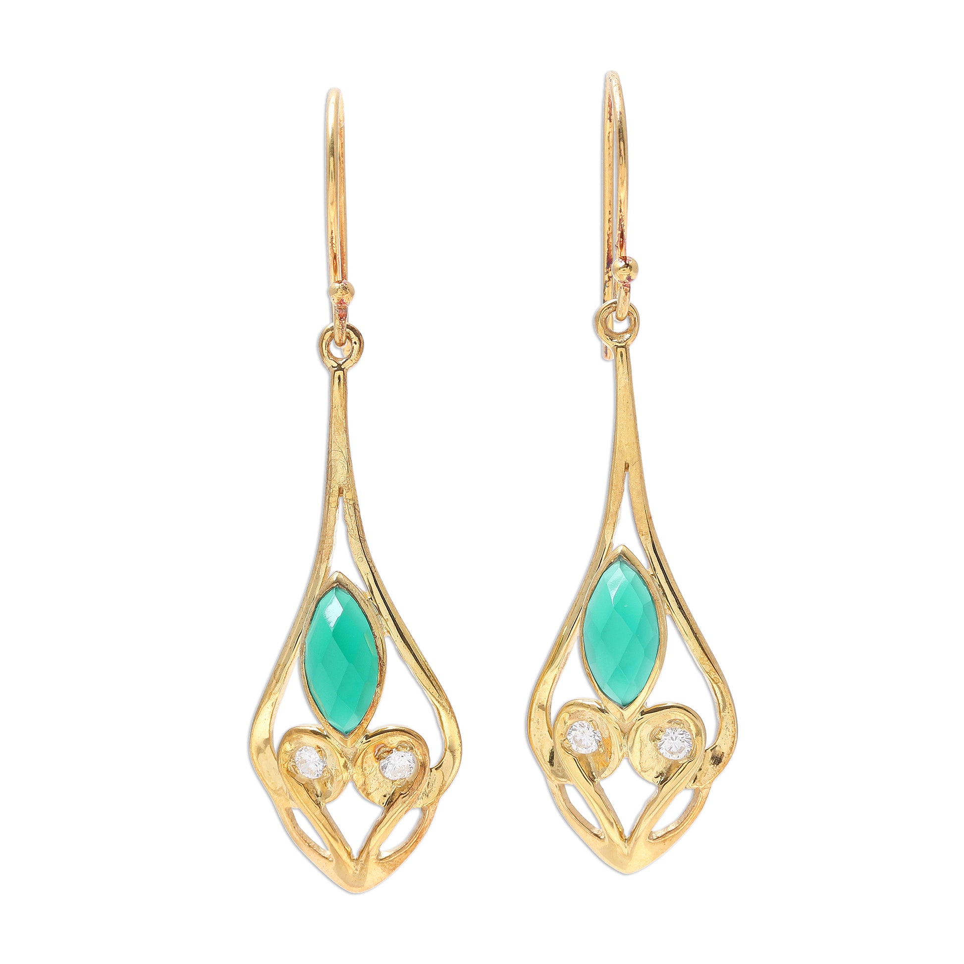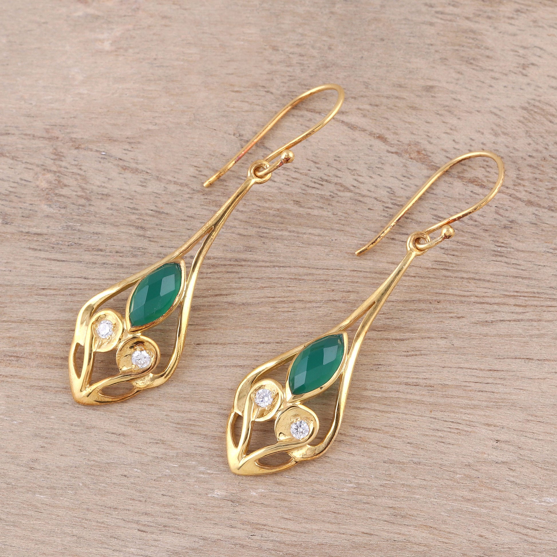 Brighten up your look with the classic glow of gold! Fusing the concepts of gemstones and rain drops, India's Mahavir presents an exquisite pair of earrings. Sterling silver bathed in 22k gold embraces two carats of vibrant green onyx. Cubic zirconia add sparkle.