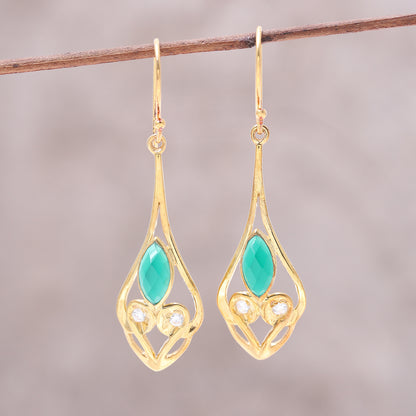 Bejeweled Rain Drops Gold Plated Green Onyx and Cubic Zirconia Dangle Earrings