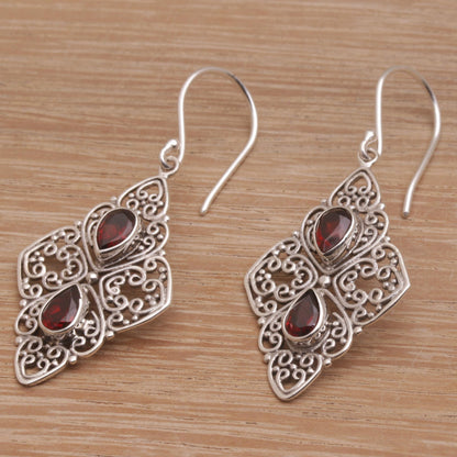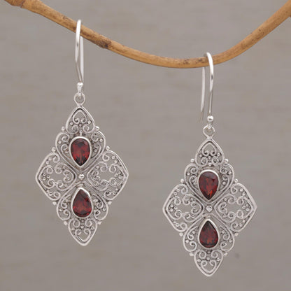 Besakih Beauty Ornate Dangle Earrings with Garnets and Sterling Silver