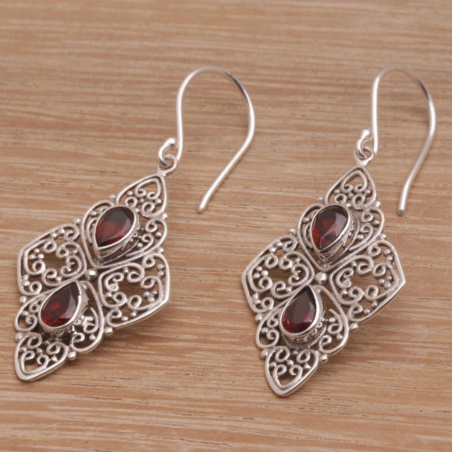 Using the Balinese jewelry motifs known as bun (wirework) and jawan (tiny silver granules), Eka Devi crafts a wonderfully ornate pair of earrings. The earrings are formed of sterling silver with a combination finish, and accented with teardrops of faceted garnet with natural crimson hues. The design is named for Besakih, an ancient temple on the island of Bali.