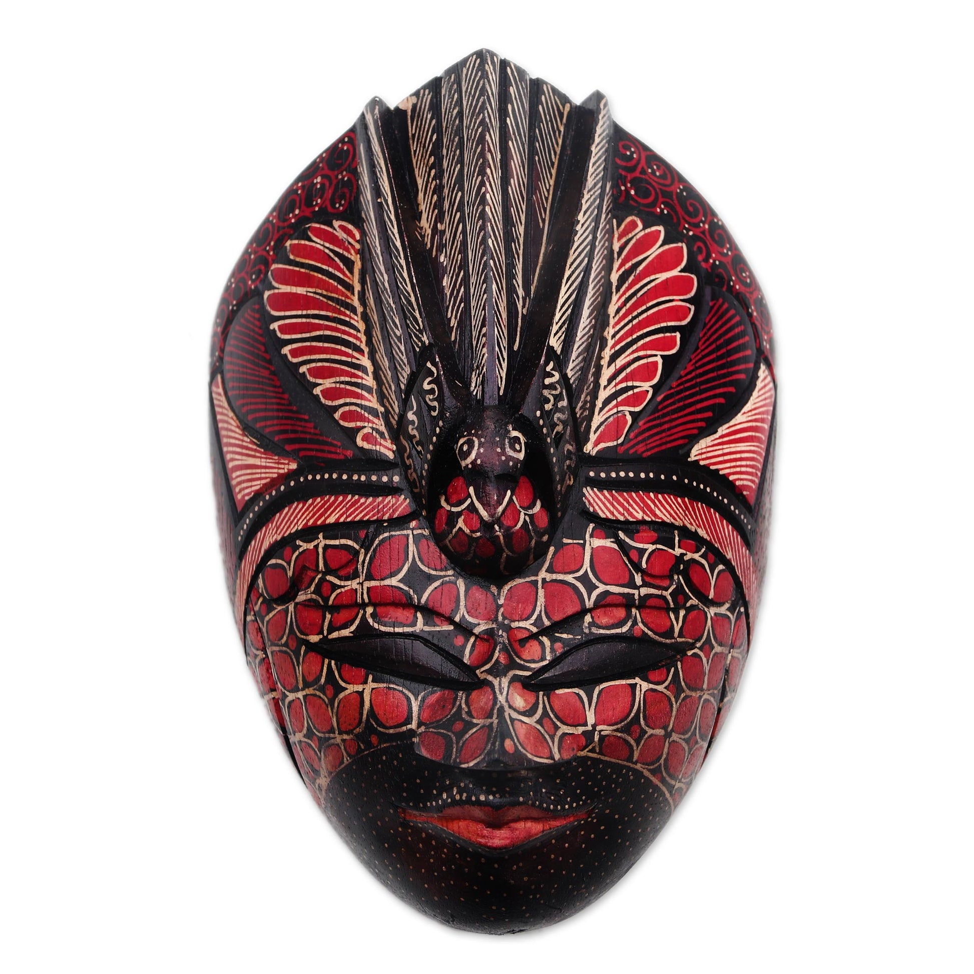 In tones of red, the face of a lord makes a regal addition to your home decor. Javanese artisan Omi Setiawan crafts this mask from albesia wood, featuring a bird that is hand-carved at the forehead. This mask is decorated using the batik method, where the wood is painted by hand with a wax resist before colorful dyes are applied. Traditional kawung motifs are visible on the mask's forehead, nose, and cheeks.