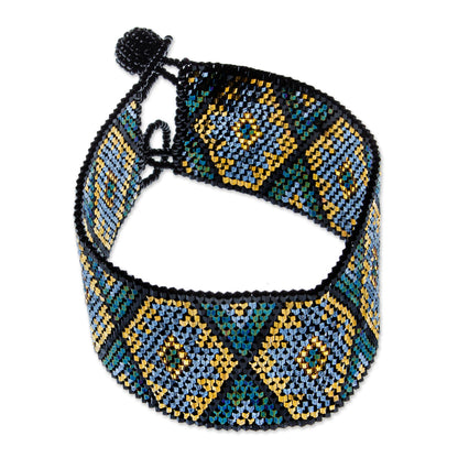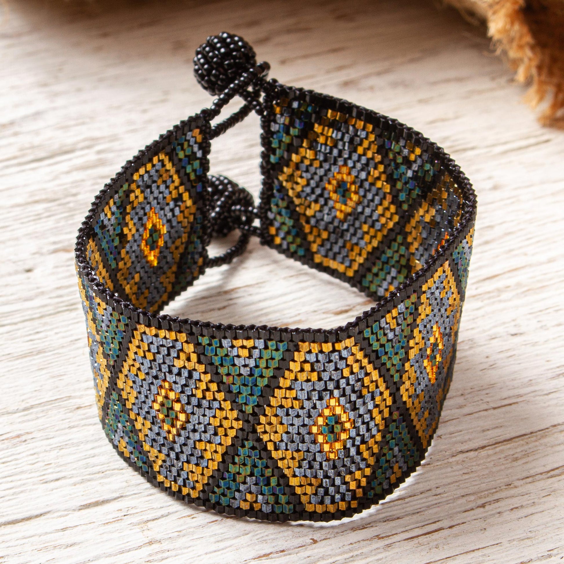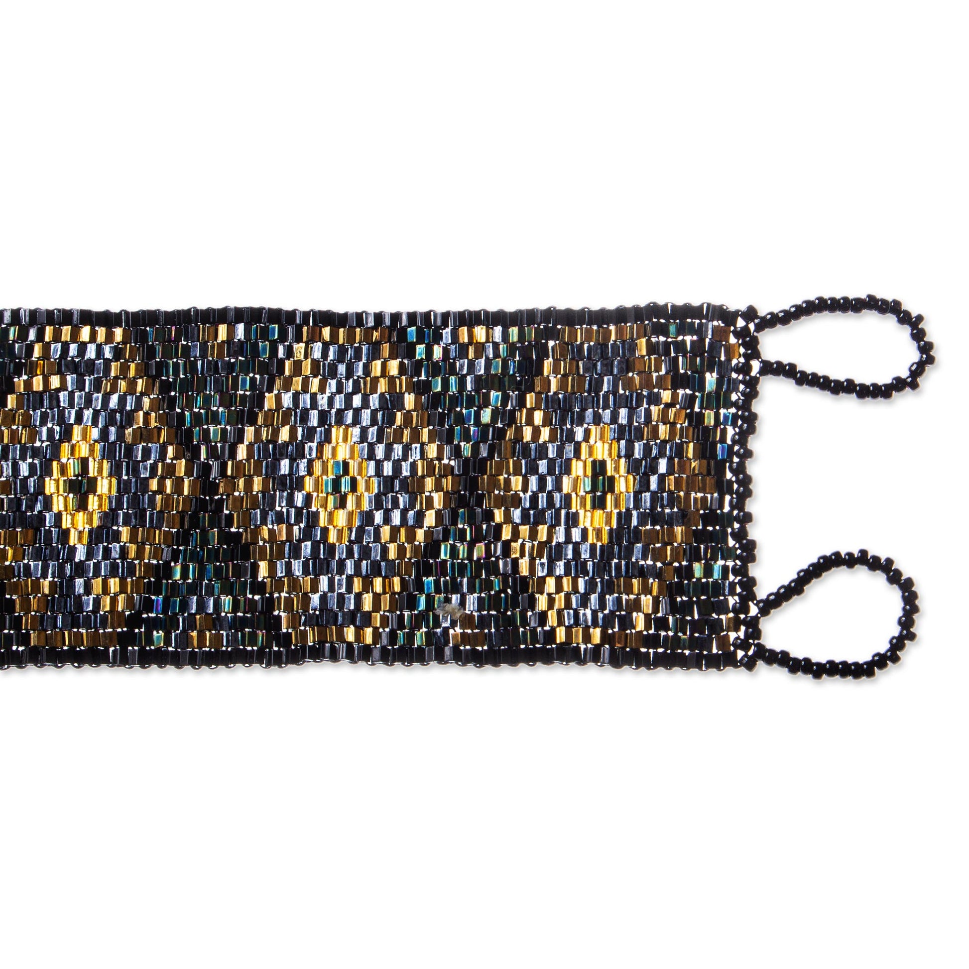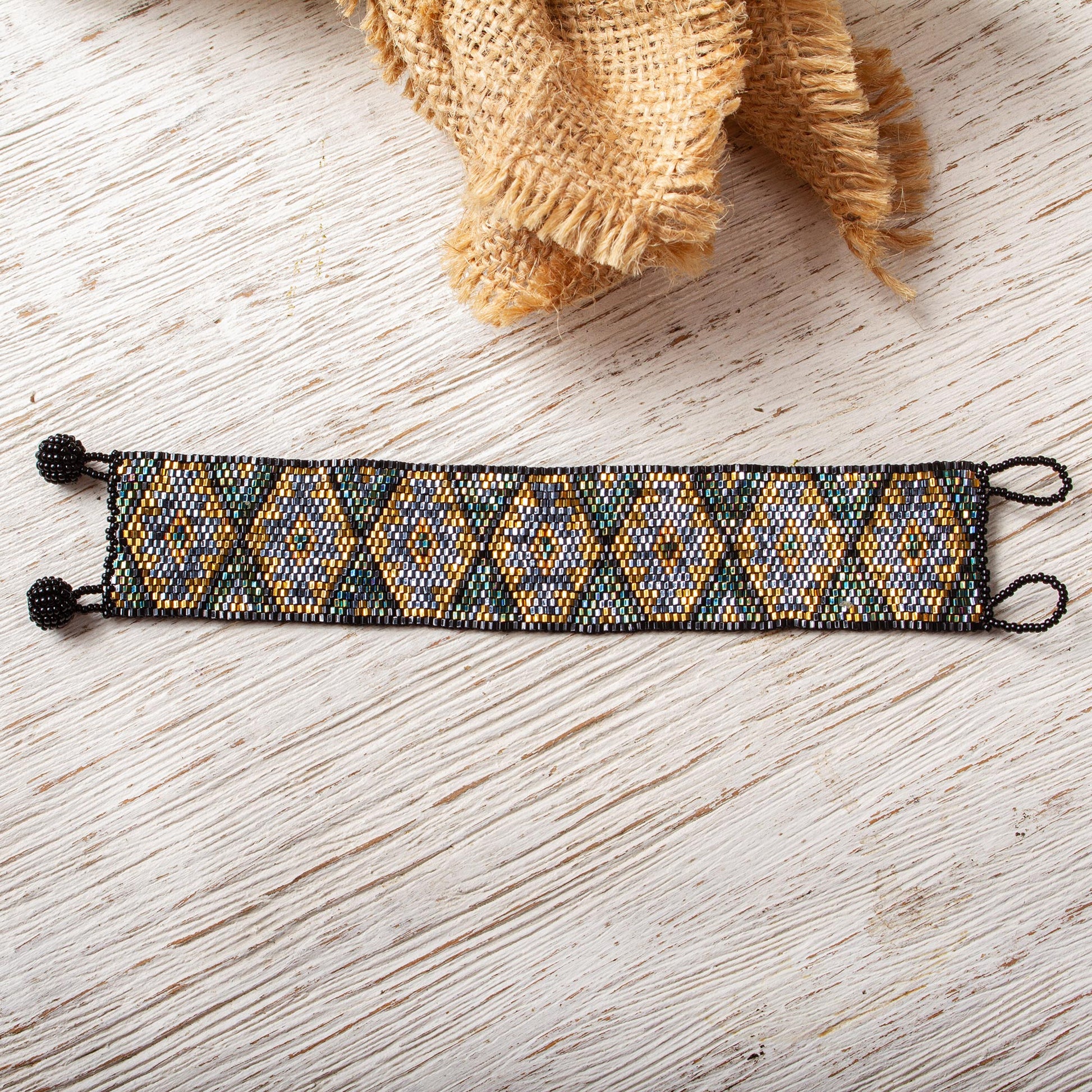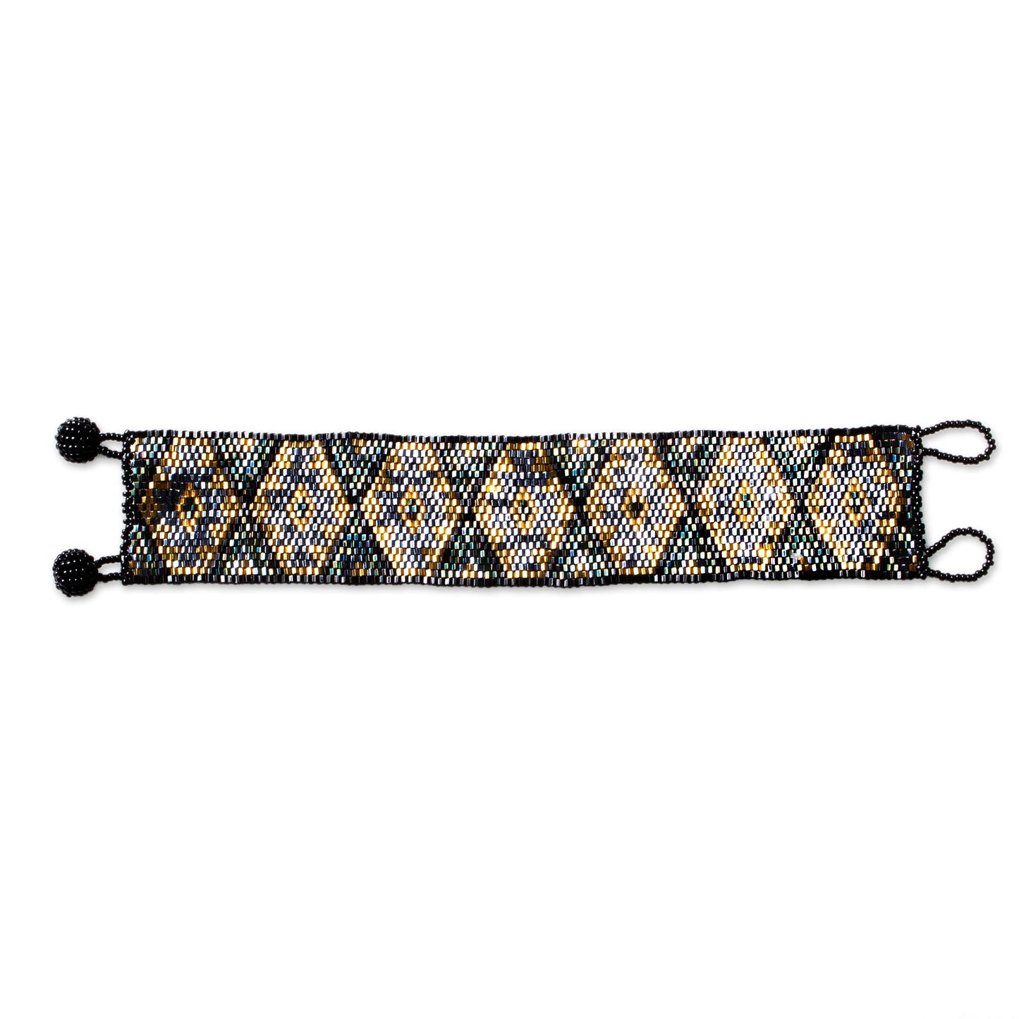 A petite God's eye centers a double water gourd, a symbol representing plentiful rain. In Huichol belief, diamond-shaped talismans known as the 'eyes of God' direct to the correct path of life and refer to the four cardinal directions. A favorite embroidery pattern, the motifs are created with of tiny seed beads, meticulously placed one by one with fine precision. Artisans from the Huichol Center for Cultural Survival and Traditional Arts work in a palette of sage green, golden brown, black and iridescent grey. The elegant wristband bracelet closes with two beaded buttons.