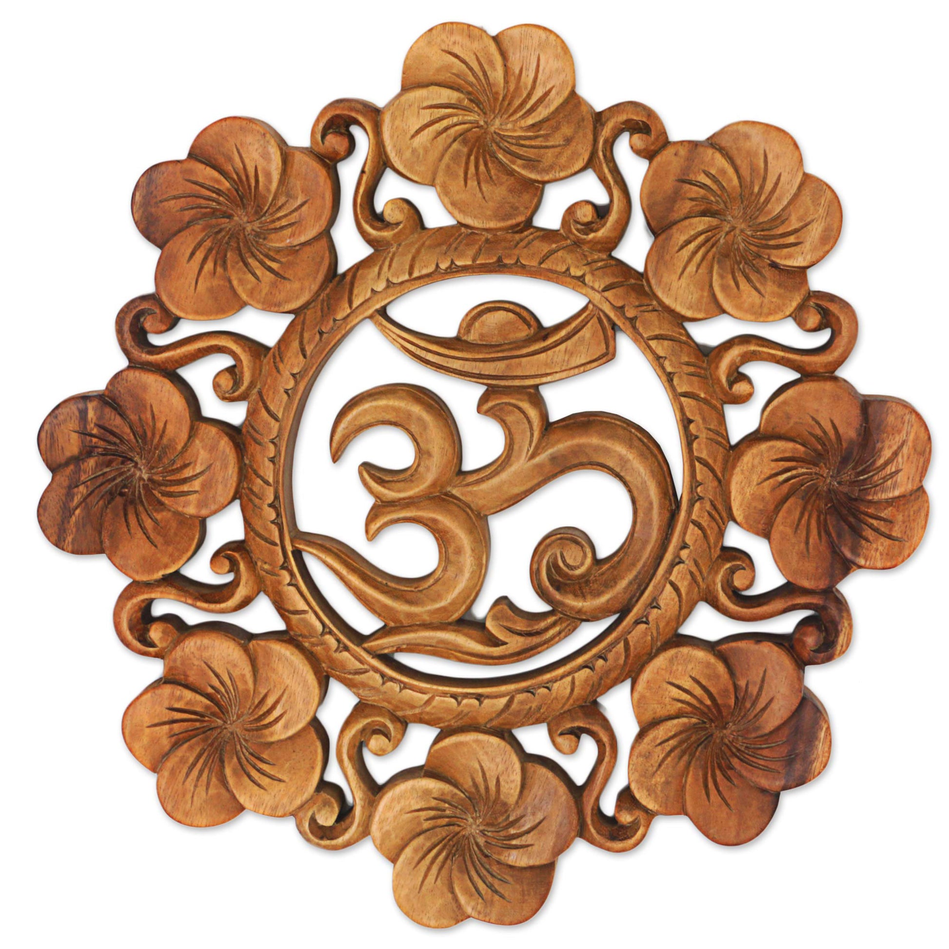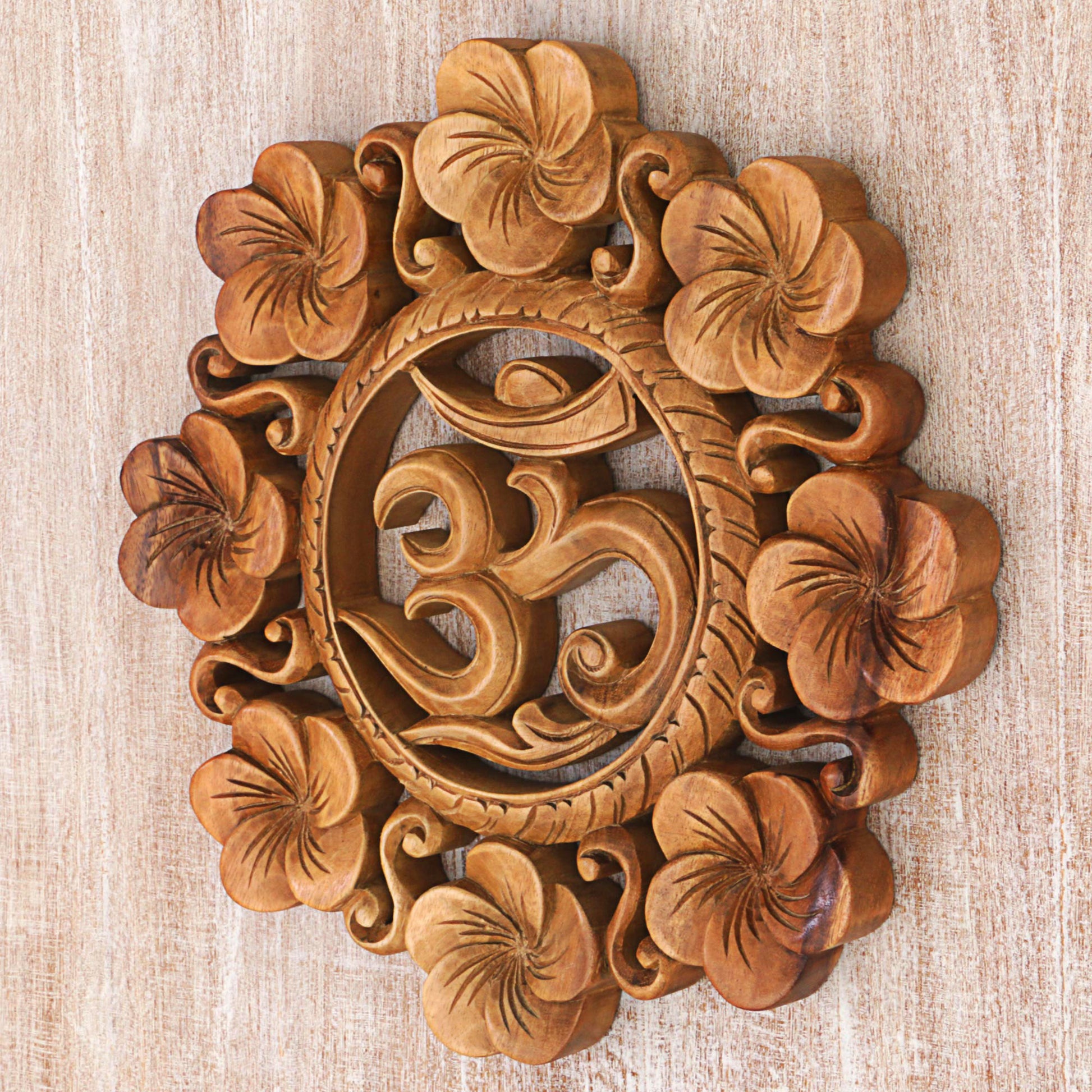 Made Mulyani comes from an Indonesian island that is well-known for its crafts and carvings. She works with local artisans to present this wall relief, handcrafted from local suar wood to depict an om symbol surrounded by elegant floral motifs. Om is a sacred mantra for Buddhist and Hindu traditions, associated with rejuvenation and believed to resonate with all things in the universe.