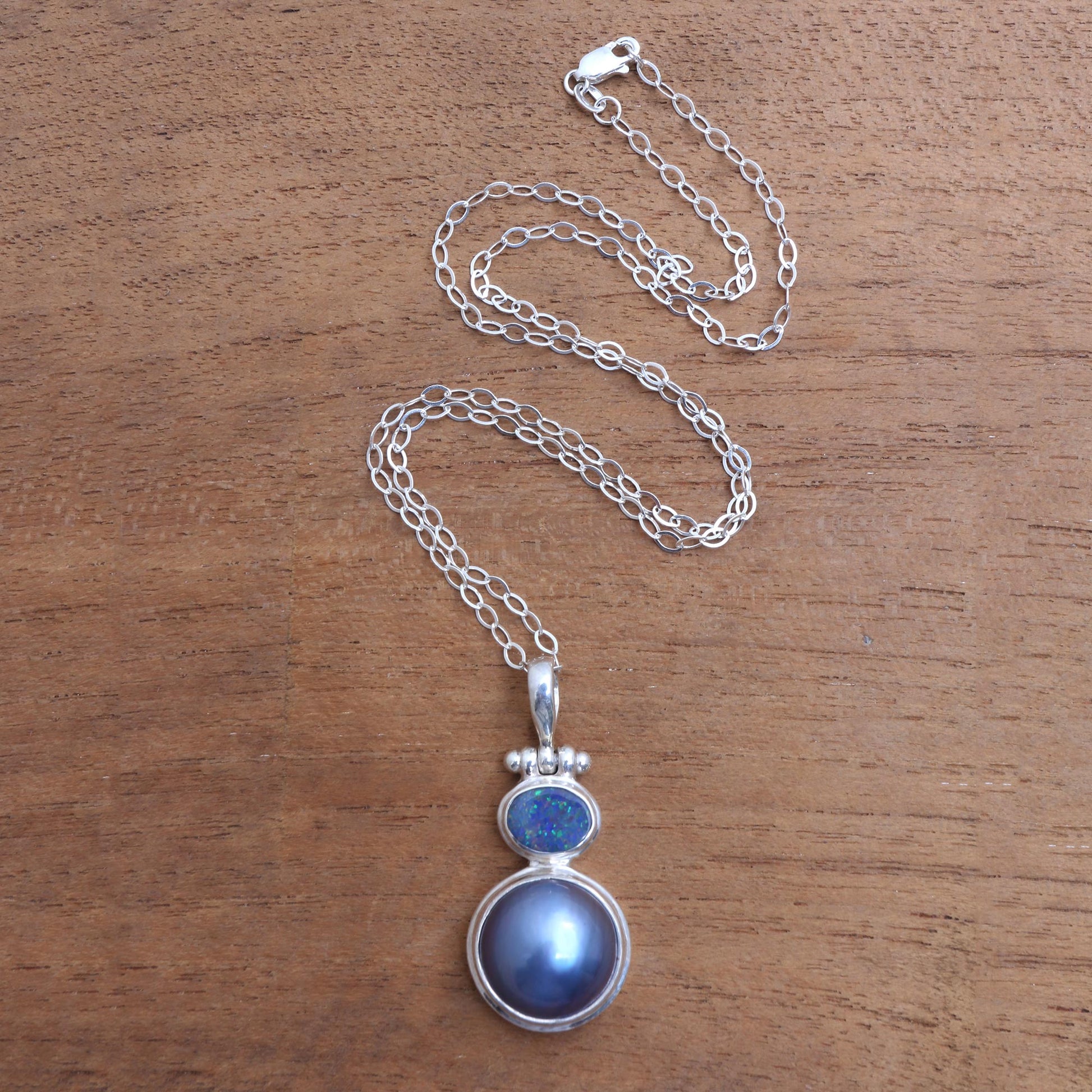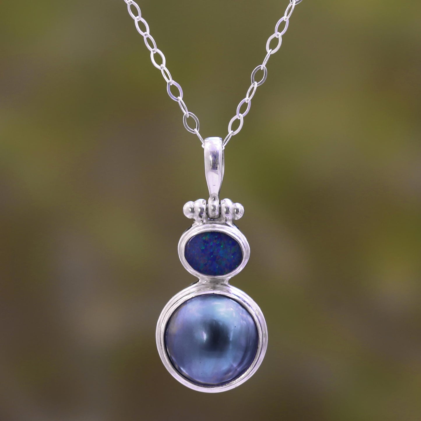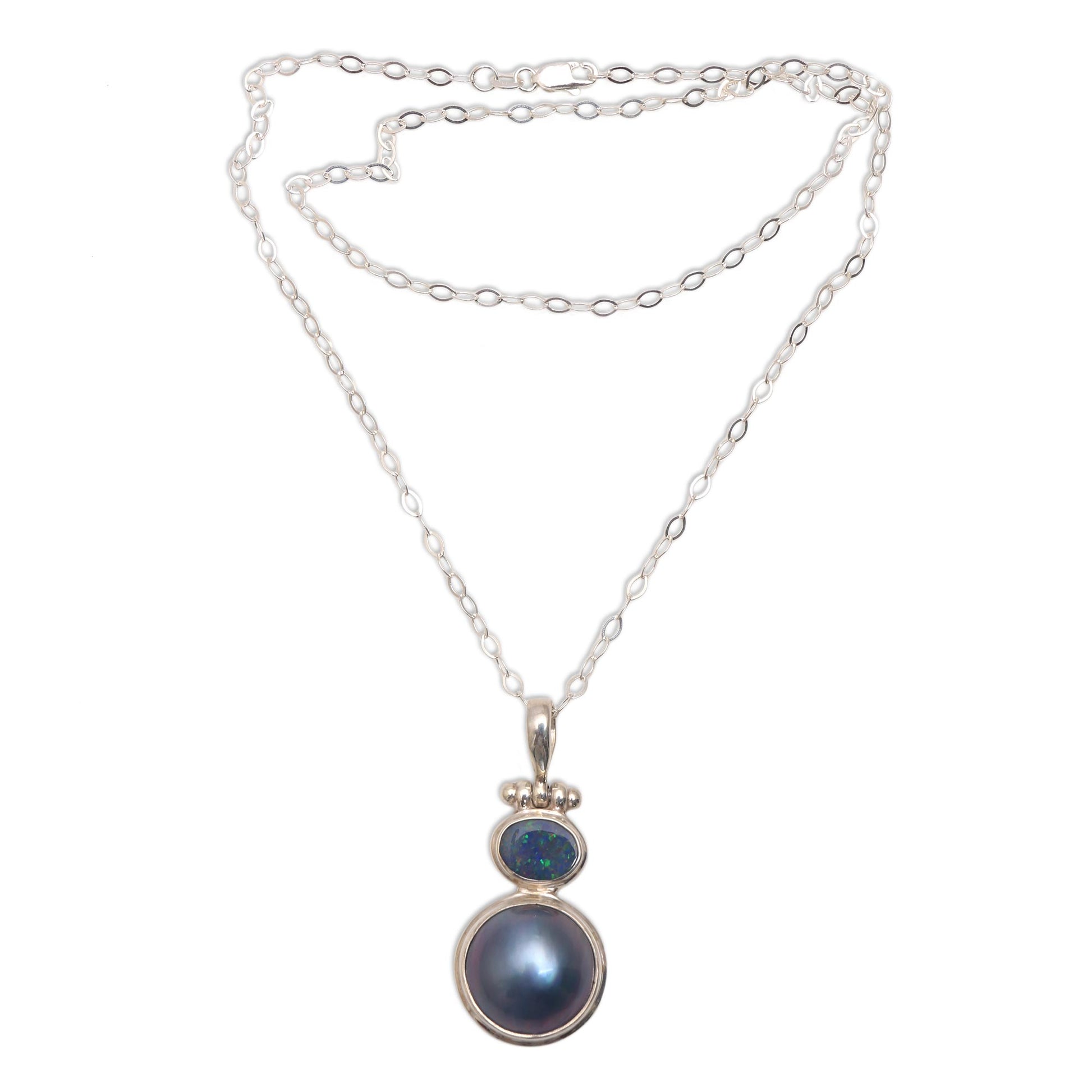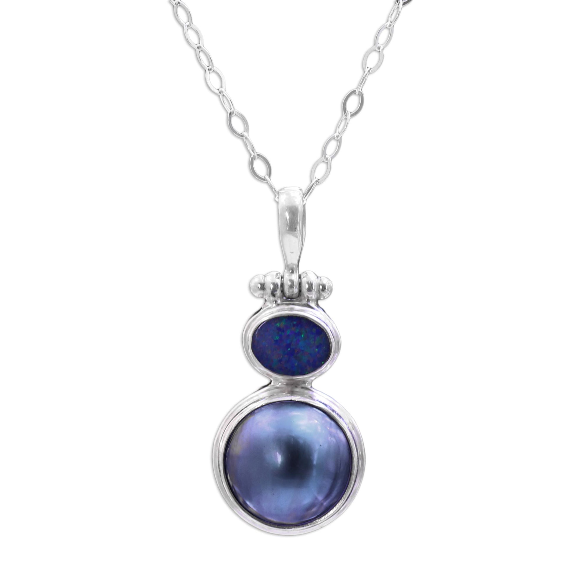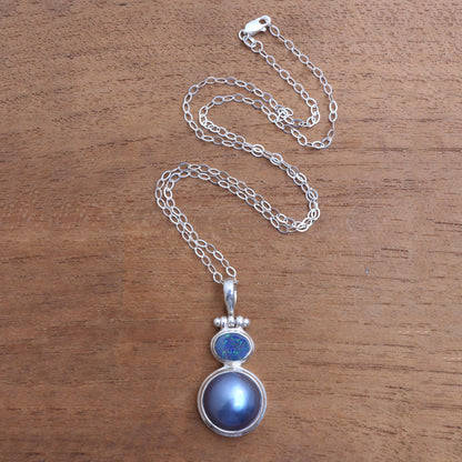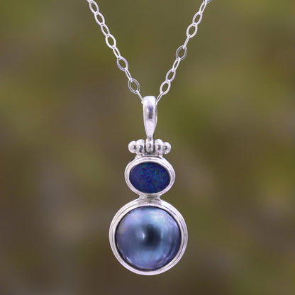 Dazzling colors distinguish a pendant of stunning minimalism. Artisans from Bali's Mutiara Collection focus on the natural allure of a blue cultured mabe pearl and an opal set in sterling silver.