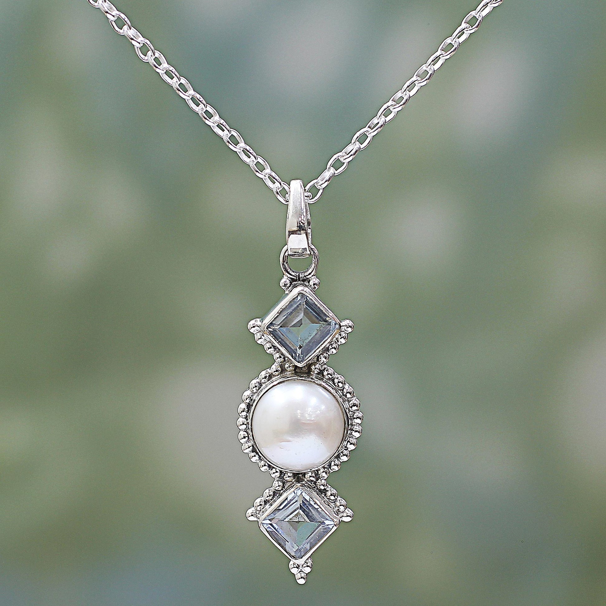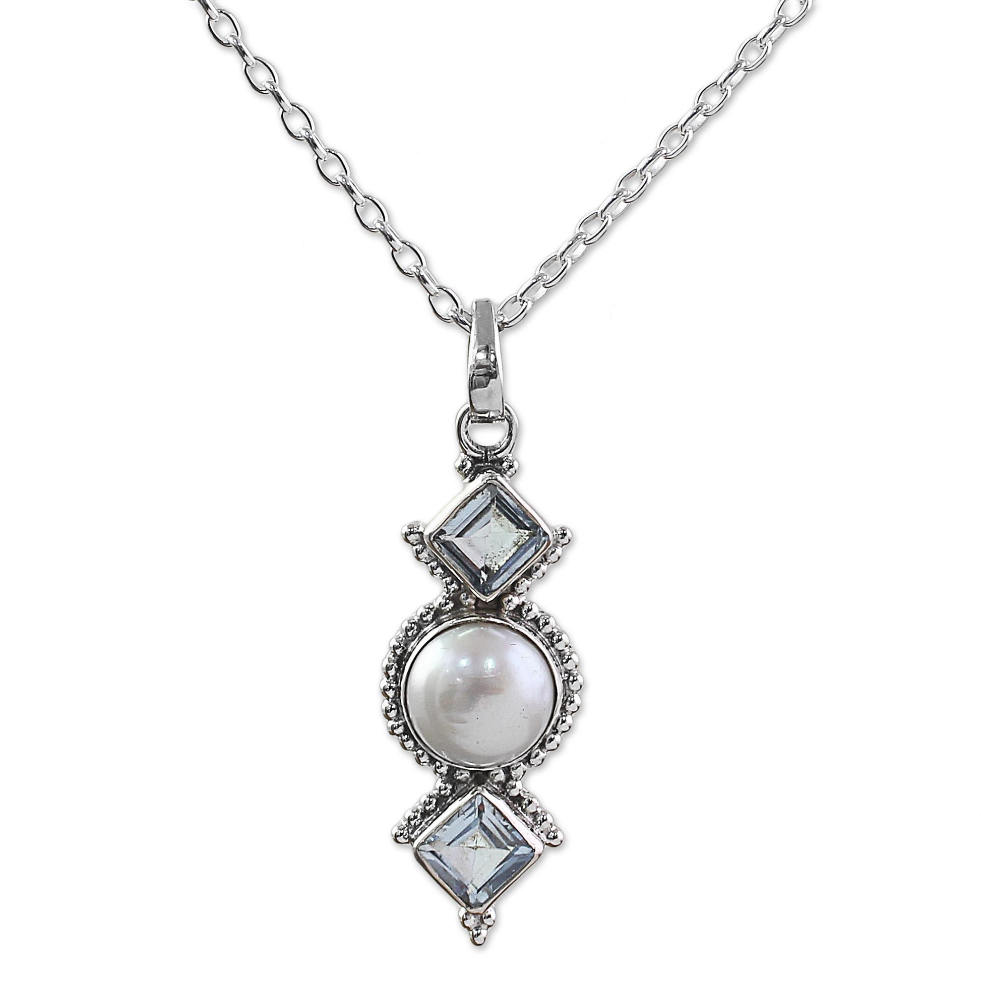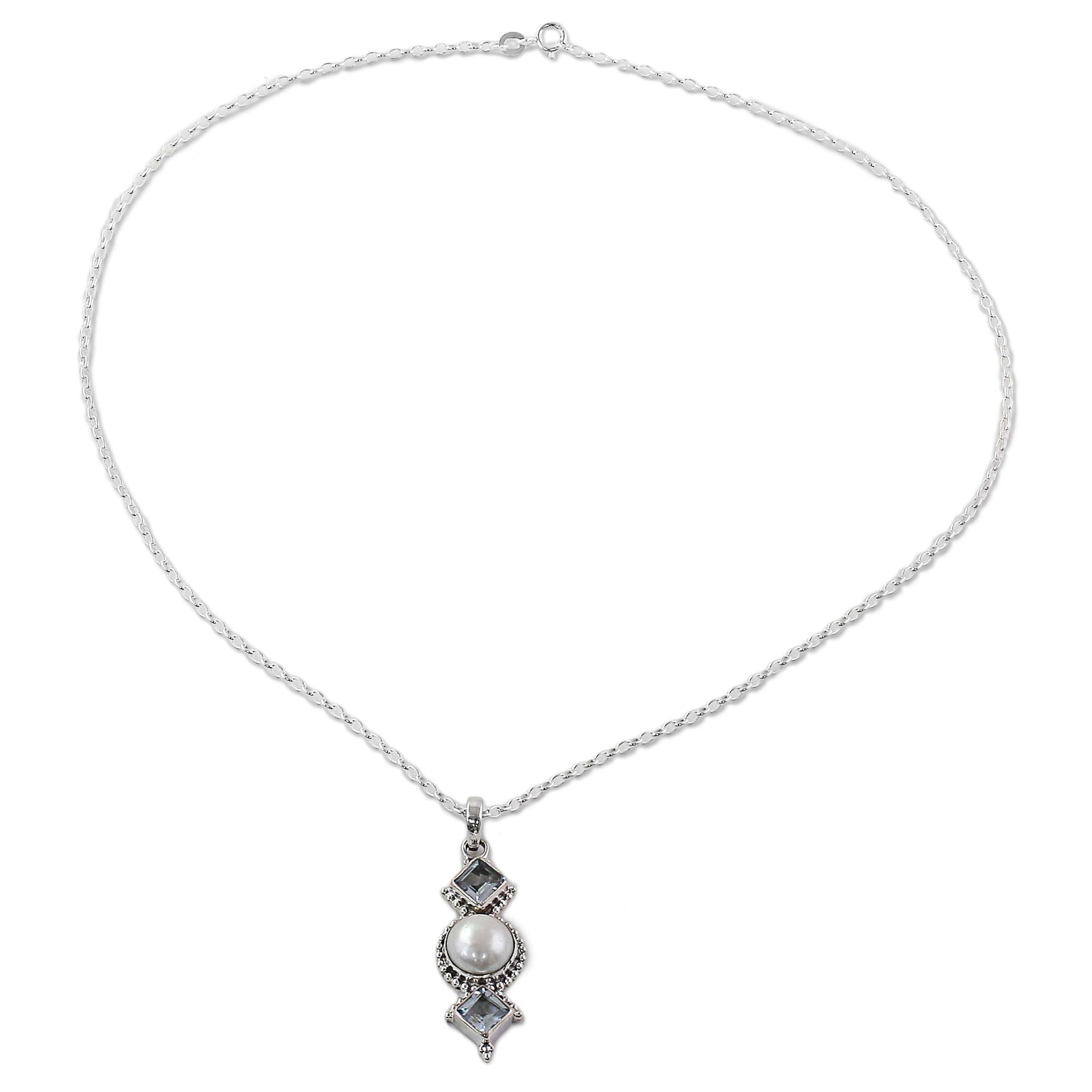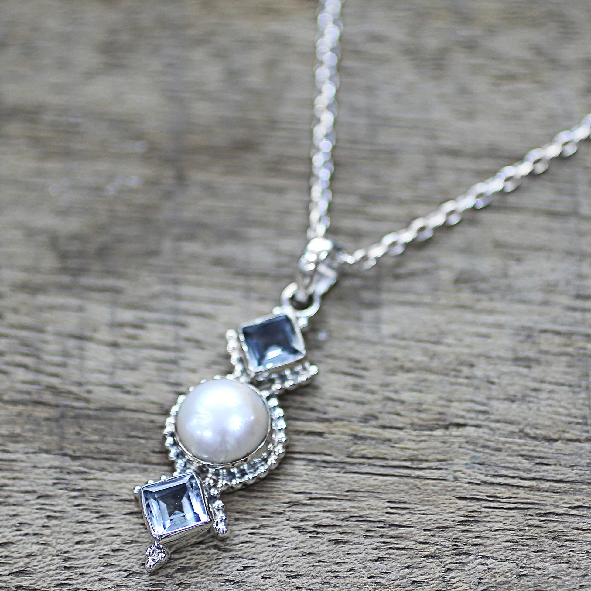 A single cultured pearl glows brilliantly white between two stones of blue topaz that total over one carat. With a passion for the jewelry of her country, India's Neeru Goel presents the necklace with handcrafted dot motifs in sterling silver surrounding the stones.