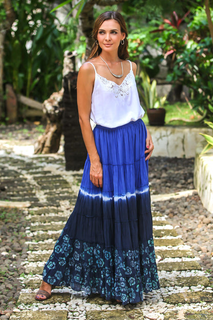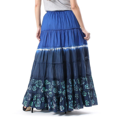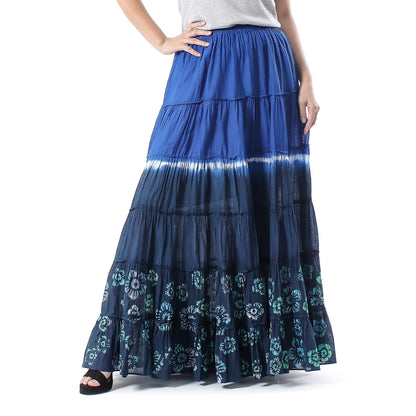 Make a statement in this maxi skirt by Thai artisan Chomsuda Samana. Tie-dyed vibrant blue and inky navy hues transition to a floral batik pattern at the hem. The elastic waist and crinkled style make this skirt all-day comfortable and perfectly packable.