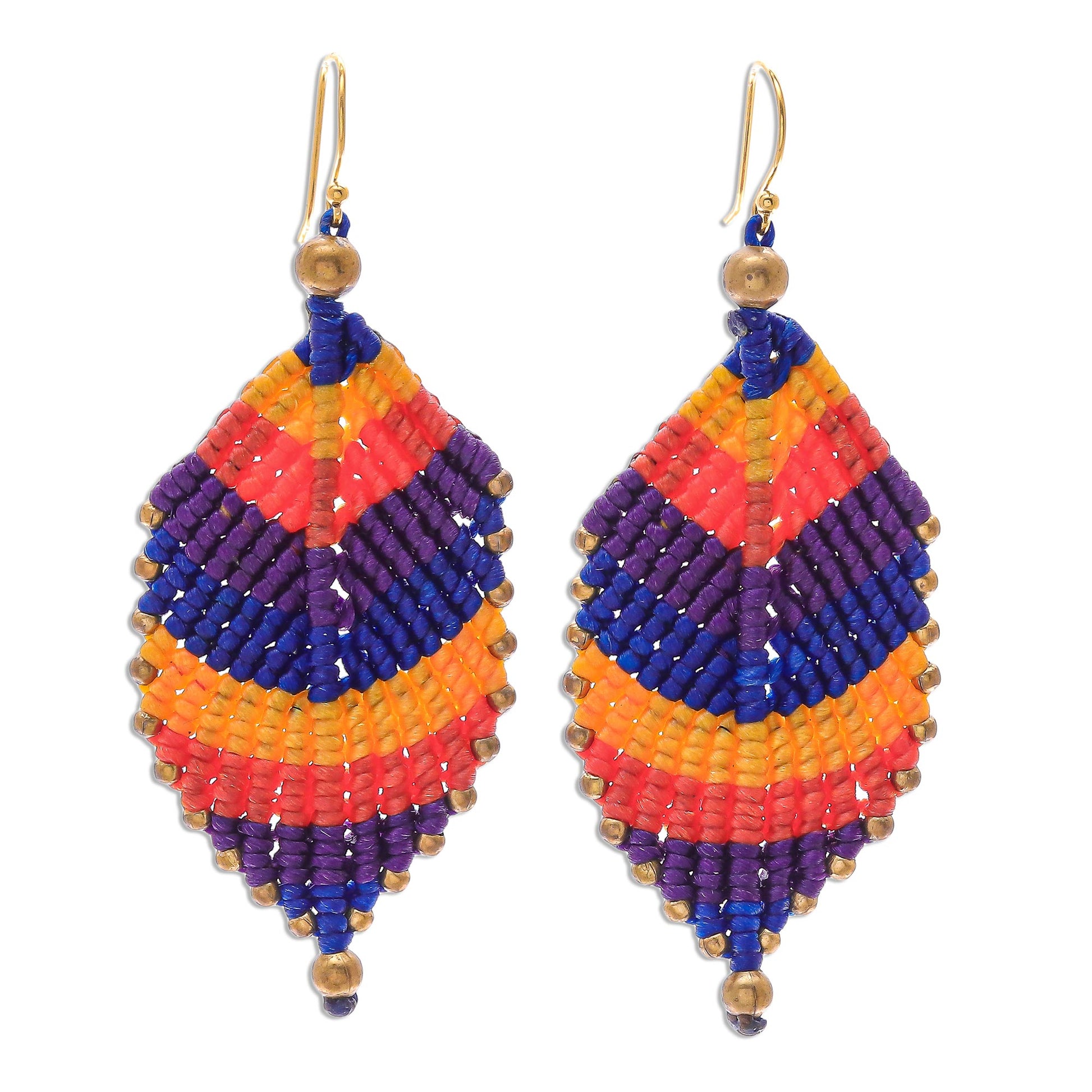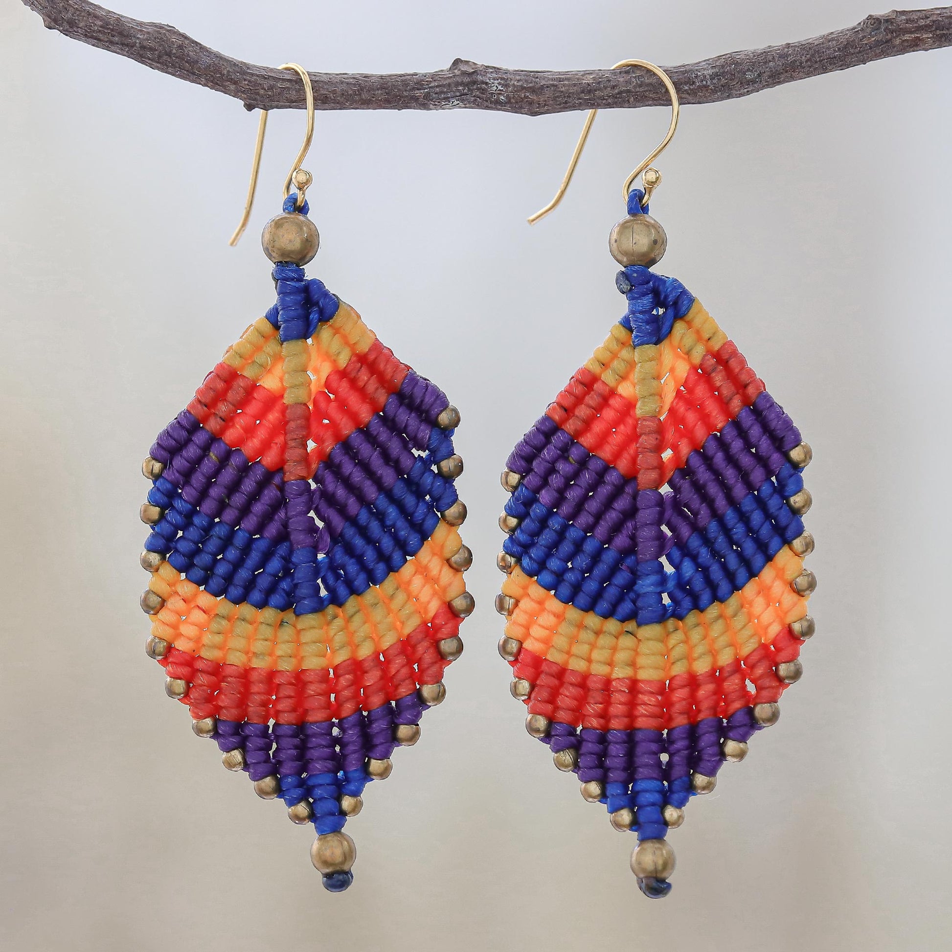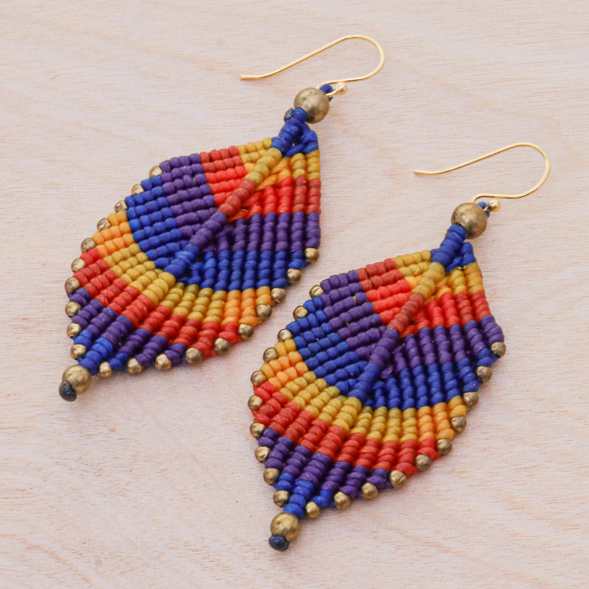 Thailand's Kanjana uses traditional macrame techniques to turn waxed cord into delicate spring leaves in the form of dangle earrings. The leaves, in shades of yellow, blue, purple, and red, are edged with brass beads, and hang from hooks made from gold-flashed sterling silver.