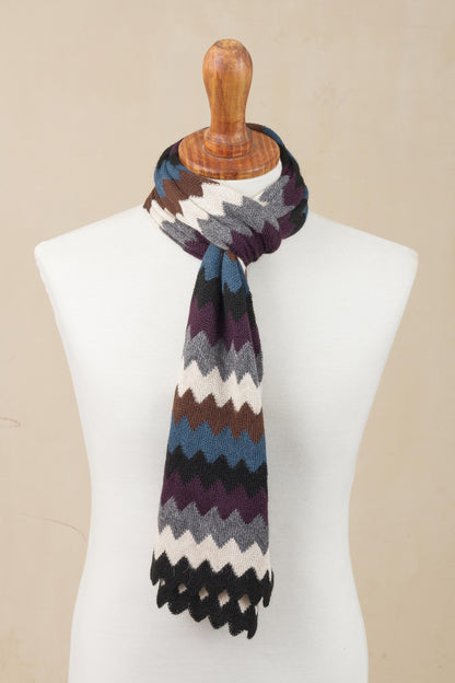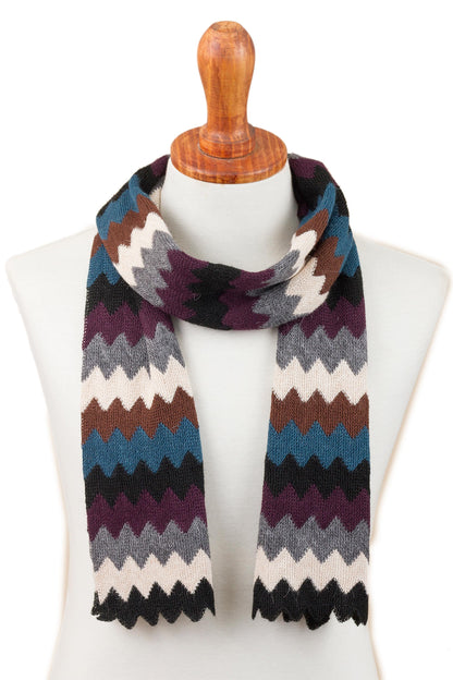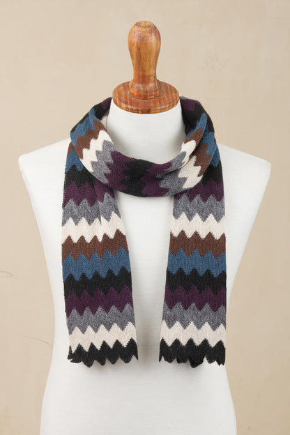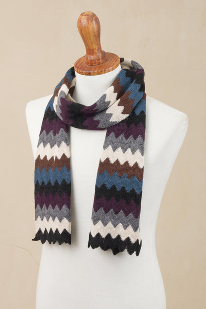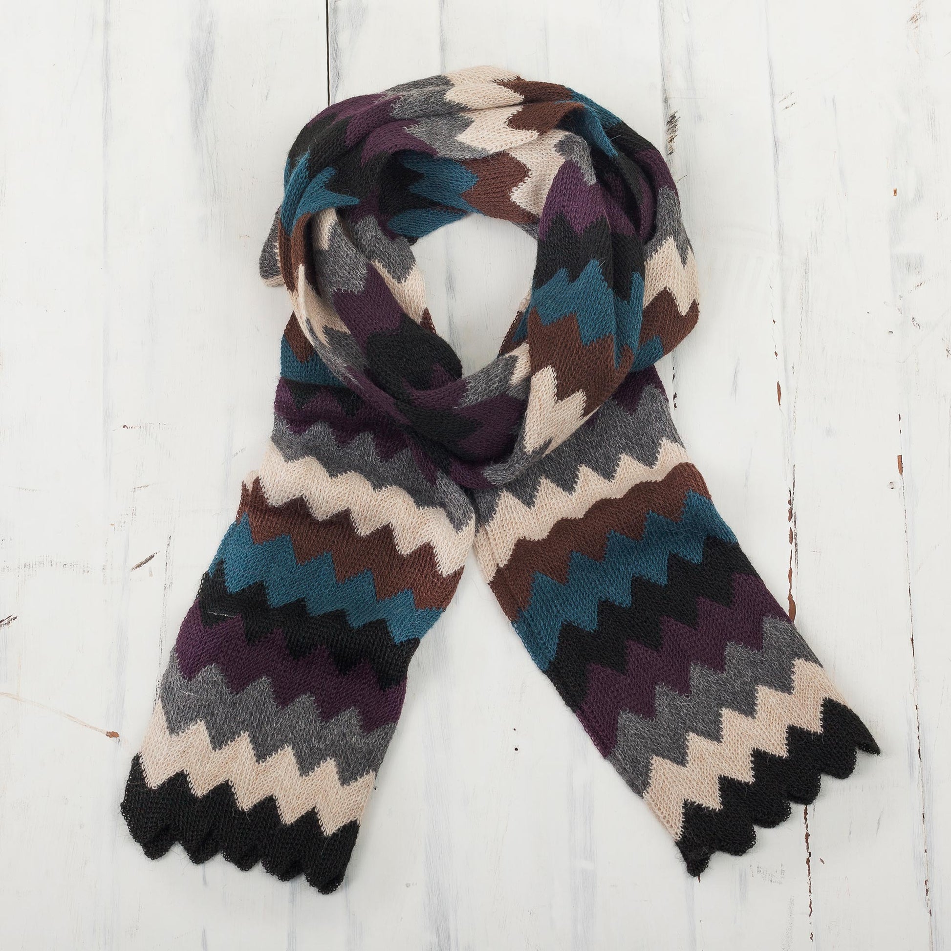In bold hues of antique white, chestnut, teal, black, and mulberry, mesmerizing zigzag patterns decorate this wrap scarf from Peru. Alfredo Falcon designs this scarf, which he knits from a soft alpaca wool blend.
