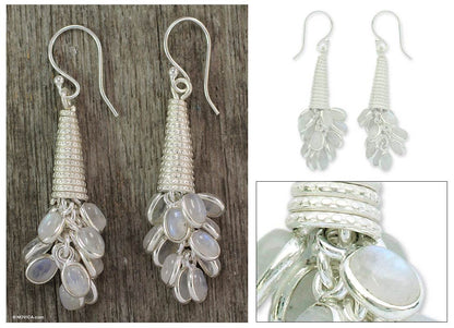 Cascading ripe rainbow moonstones gems glow with natural beauty in a design by Neeru Goel. The sterling silver earrings are expertly crafted by hand featuring rainbow moonstone, believed to reunite lovers and strength in intuition.