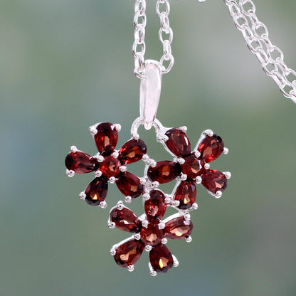 Blossoming with petals of garnet, daisies are captivating in a sterling silver necklace from Alok Jain, in India. The faceted gems total over three gemstone carats. According to gemstone lore, garnet is a stone of passion, devotion and courage.