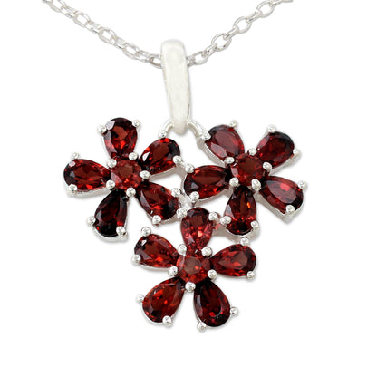 Bouquet of Passion Garnet Flower Pendant Necklace in Rhodium Plated Silver