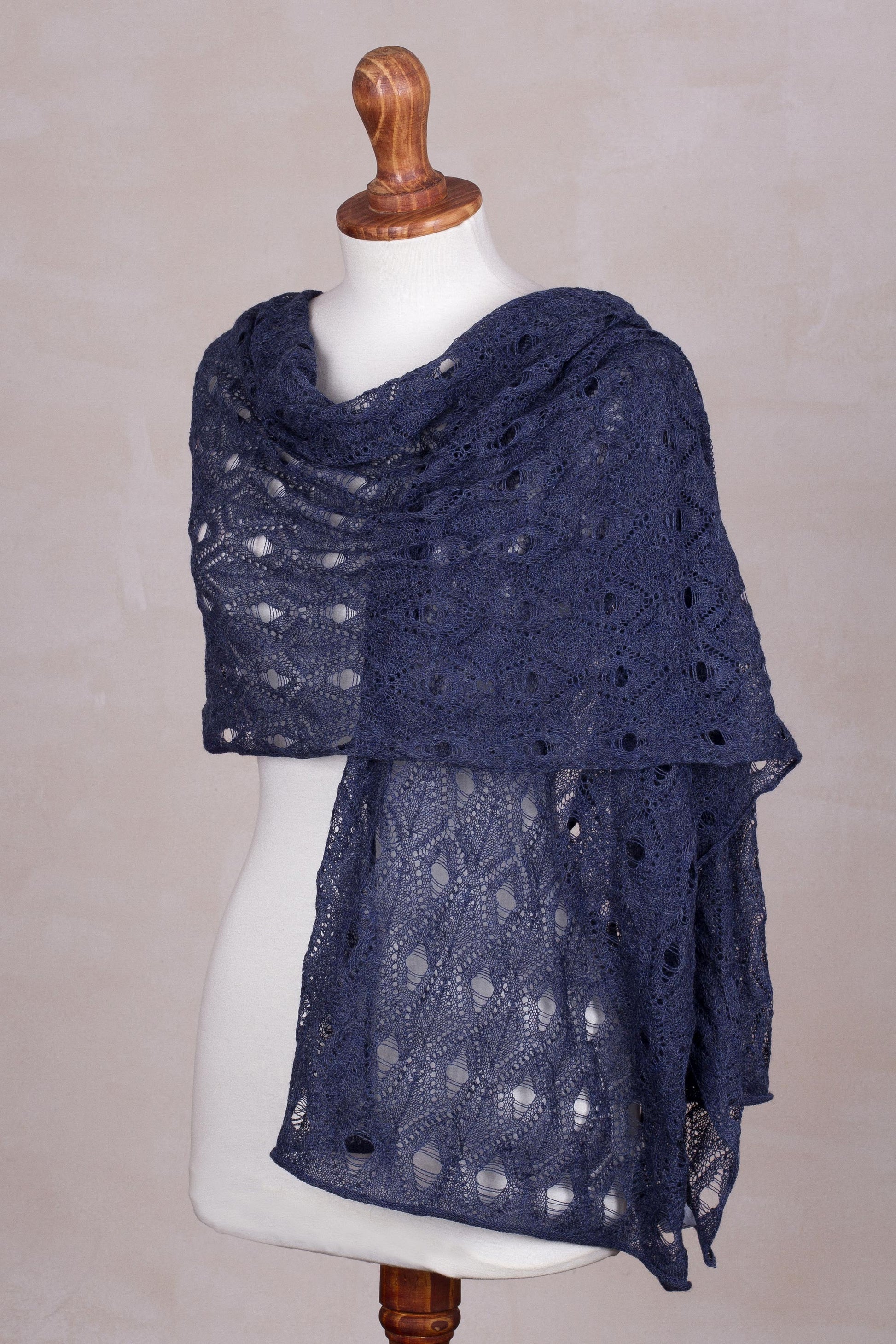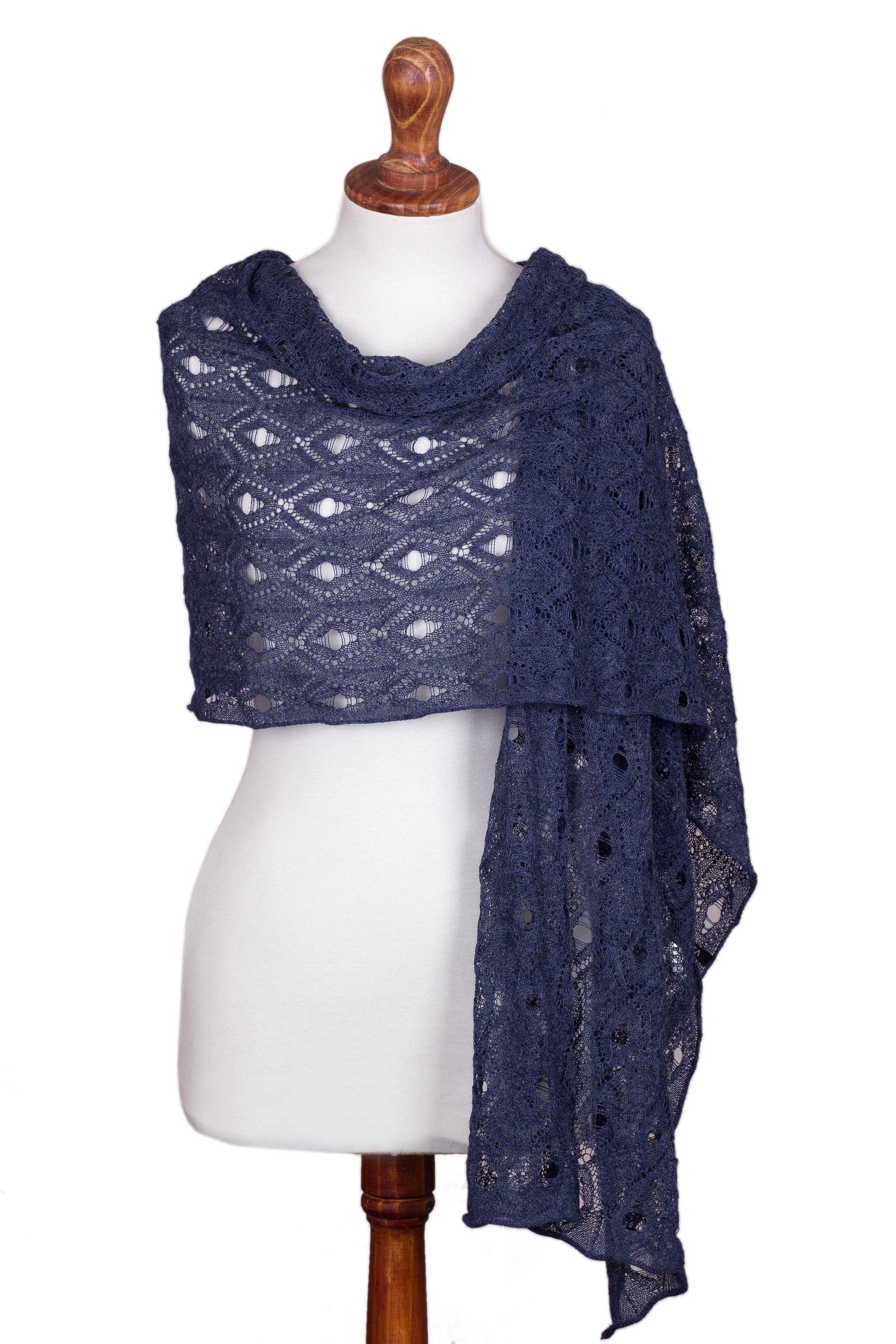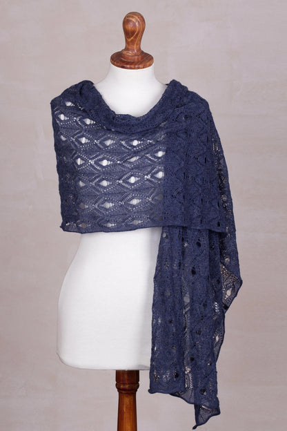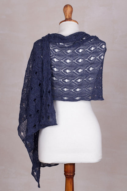 Elegant kite-shaped patterns are crocheted of soft baby alpaca wool to create the body of this magnificent shawl from the Andean highlands. Designed by Peru's Alfredo Falcon, the blue wrap is lightweight, yet cozy. Baby alpaca refers to the fine fleece from the season's first shearing.